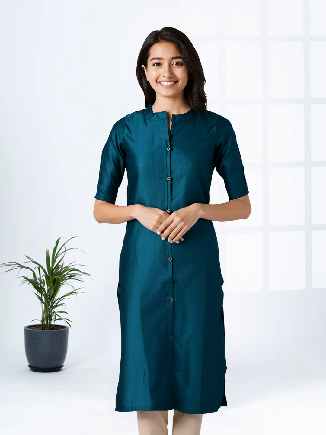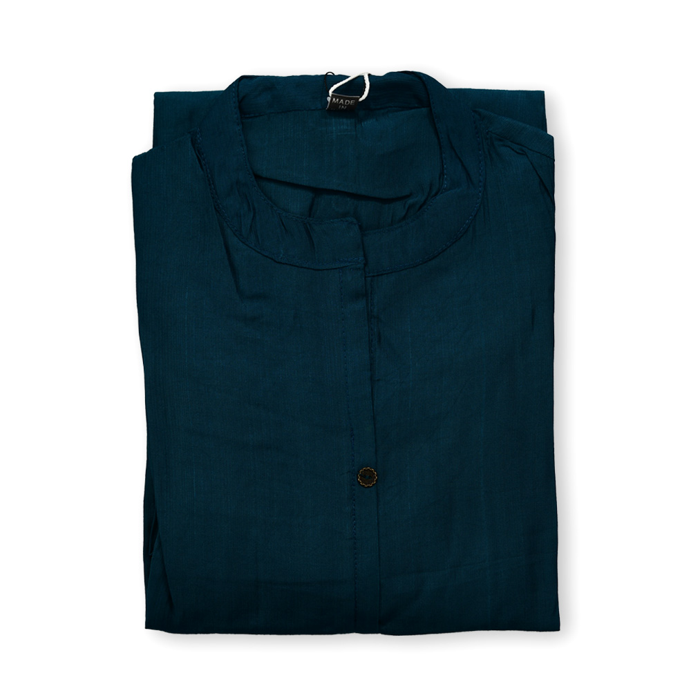 Designed with a high round Mandarin Collar neckline and elbow-length sleeves, this kurta strikes the perfect balance between contemporary chic and traditional comfort. The button-down front adds a subtle touch of style, giving you the flexibility to wear it as a relaxed piece or dress it up with accessories. Ideal for daily wear or festive occasions, it promises both comfort and fashion-forward appeal.