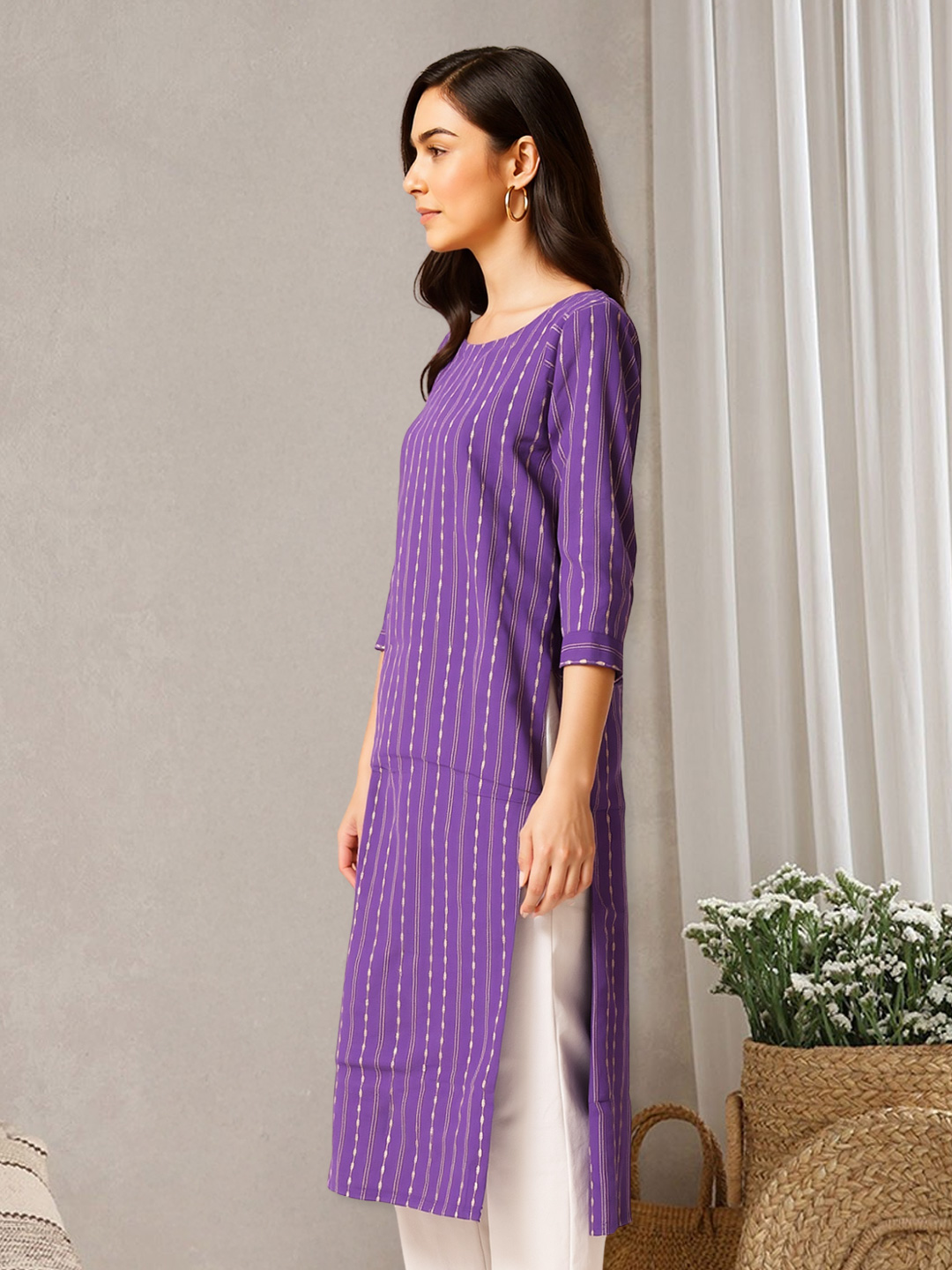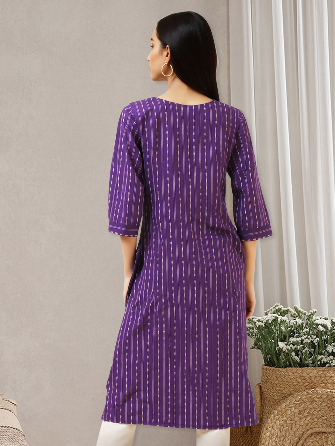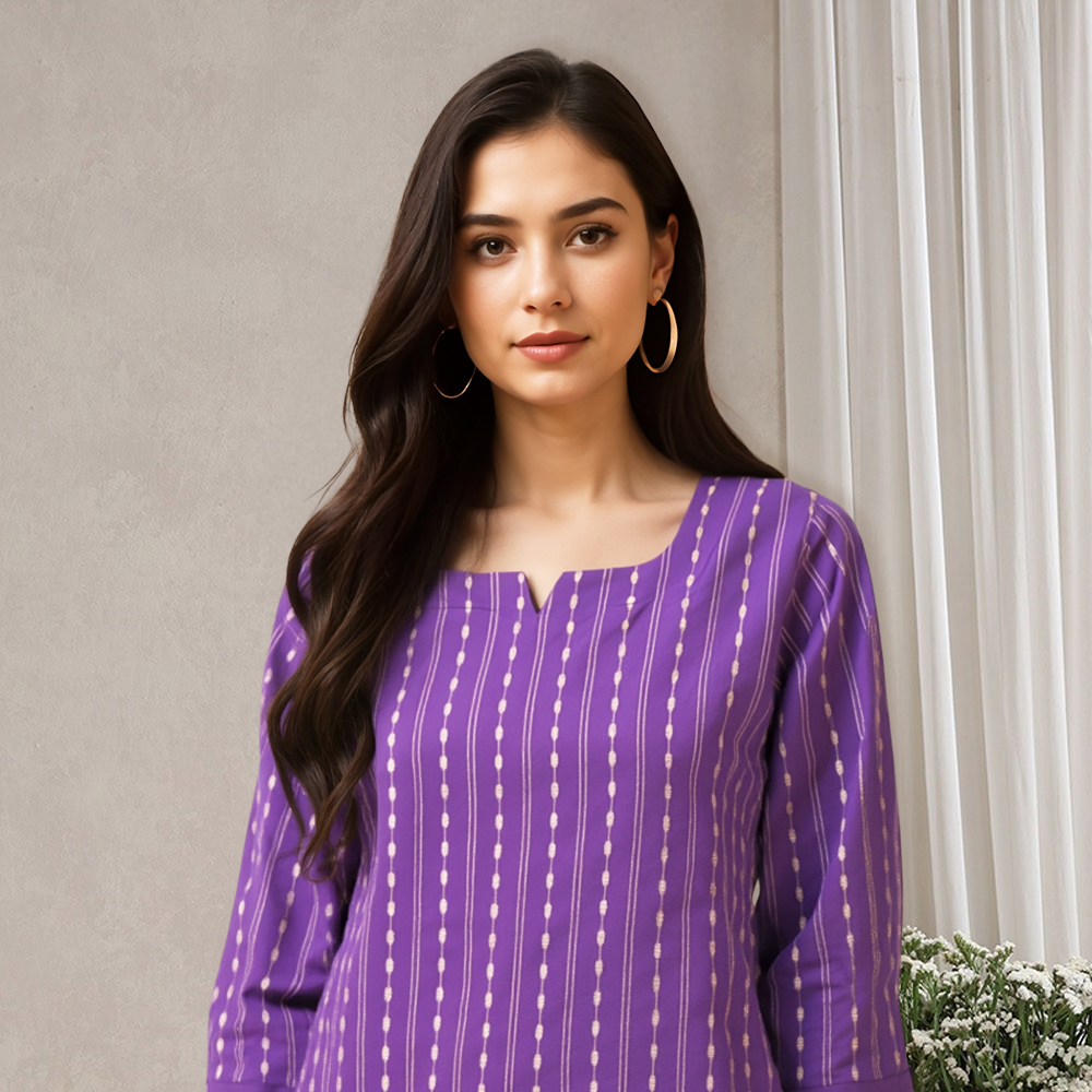 Step into everyday elegance with a kurta that blends tradition with trend. Featuring an all-over vertical print of fine dotted lines, this straight kurta elongates your silhouette and brings a refined charm to your wardrobe.