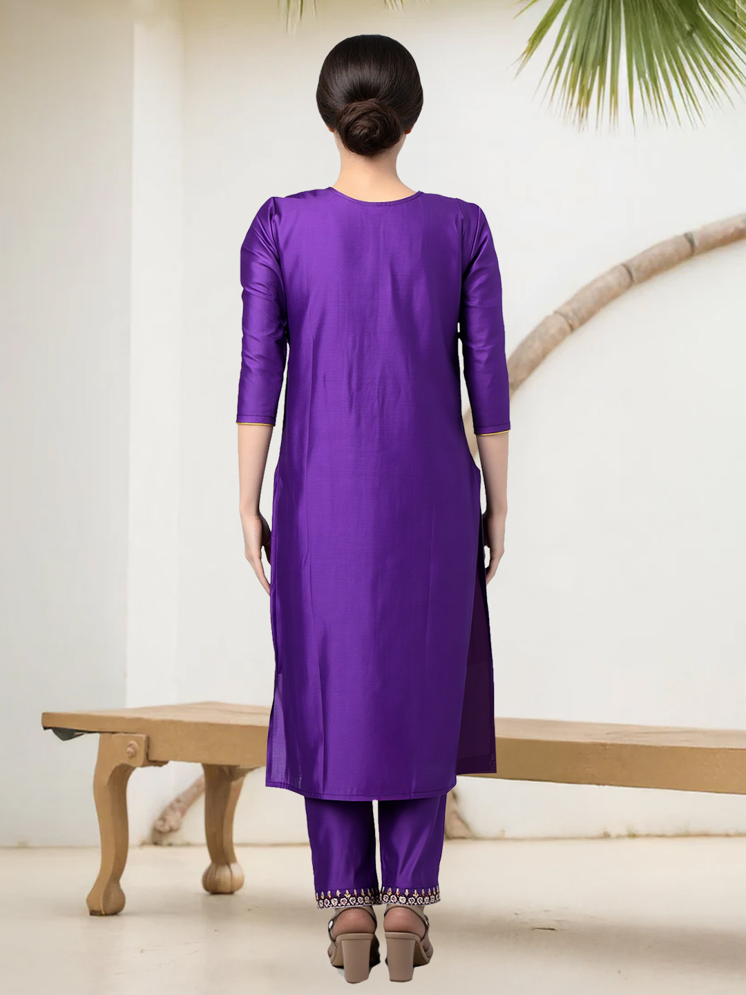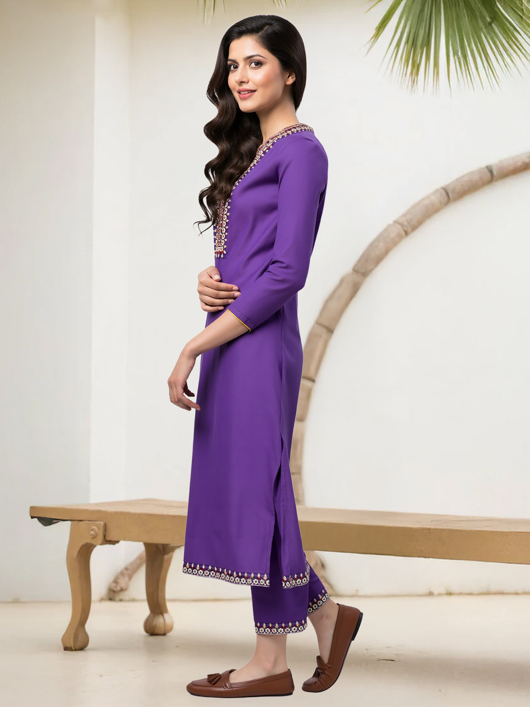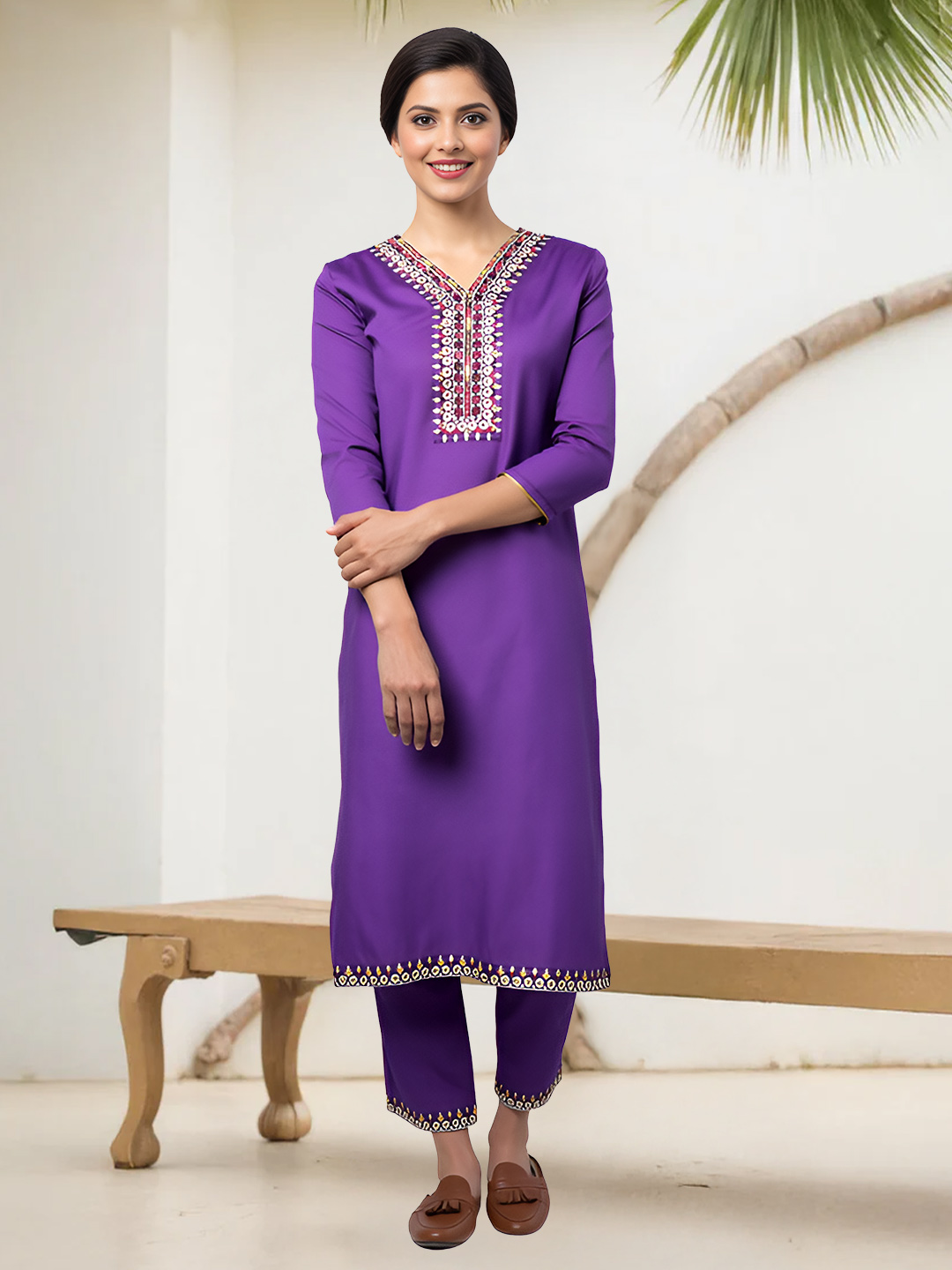 This elegant V-neck kurta set showcases intricate embroidery that adds a touch of sophistication to your ethnic wardrobe. The straight-cut silhouette offers a clean, polished look, making it perfect for both workwear and special occasions.