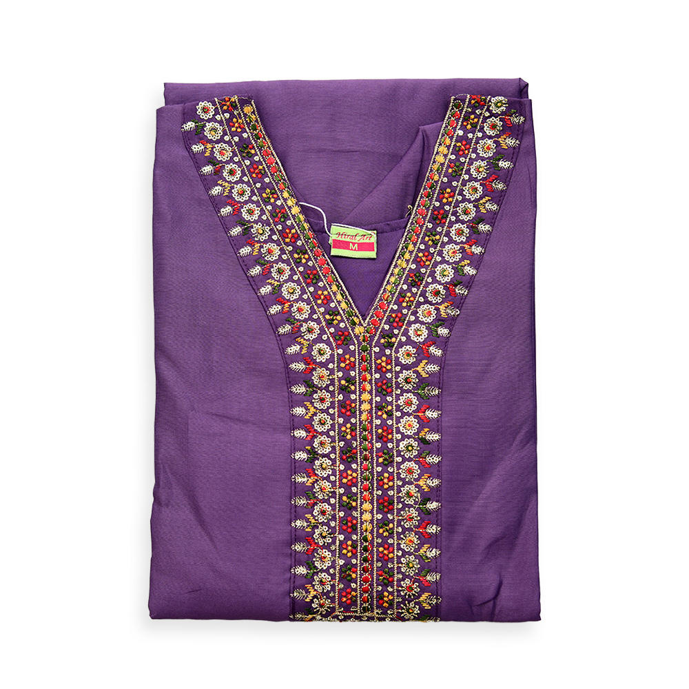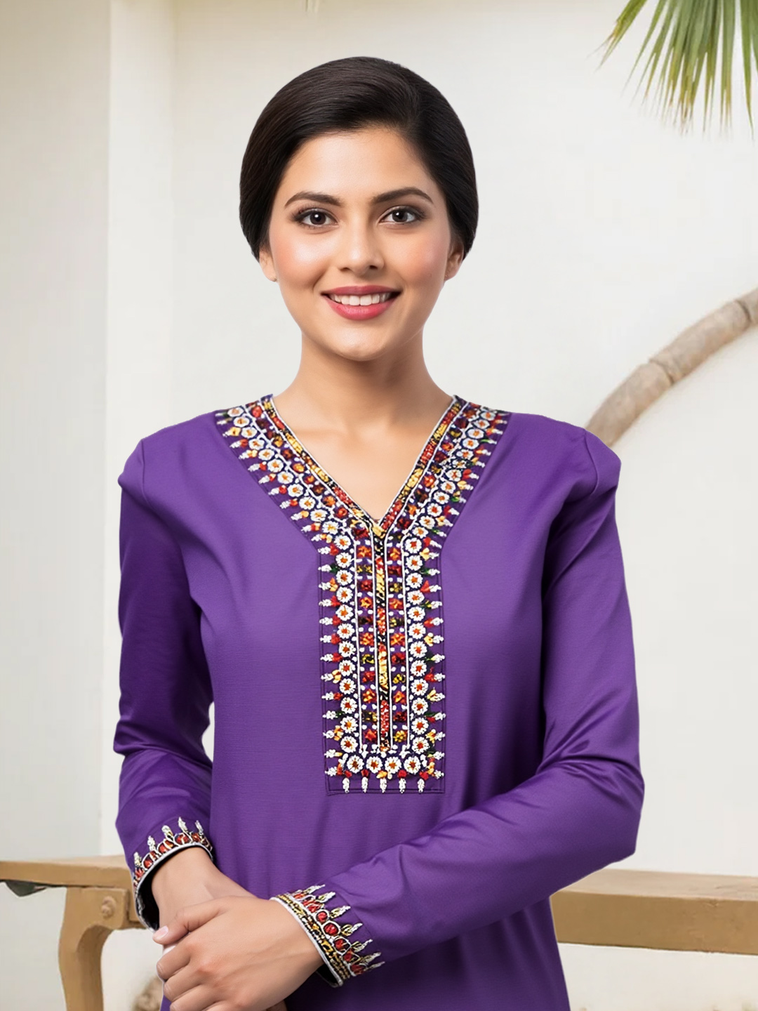 Designed with a beautifully embroidered V-neckline and three-quarter sleeves, this kurta blends traditional craftsmanship with modern styling. The delicate detailing enhances the overall appeal without overpowering the outfit.