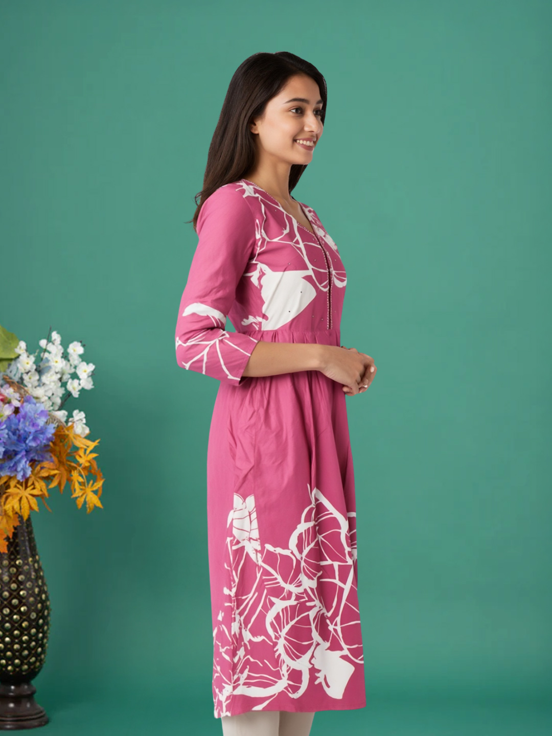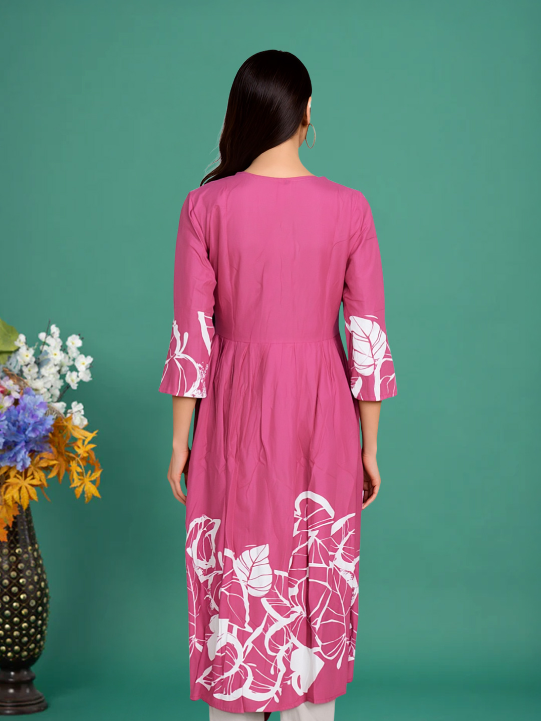 The elegant floral-leaf print design at the hem and sleeves gives this kurti a timeless charm. Whether you're dressing it up with a dupatta or keeping it simple, it’s an effortless statement piece.