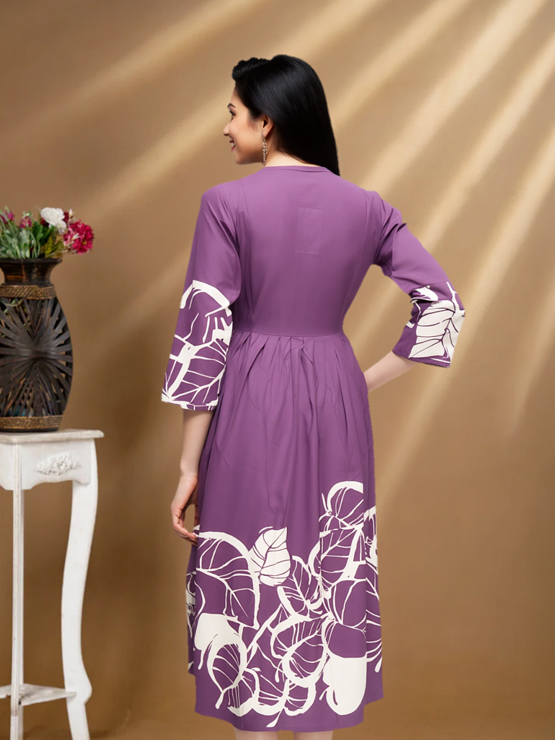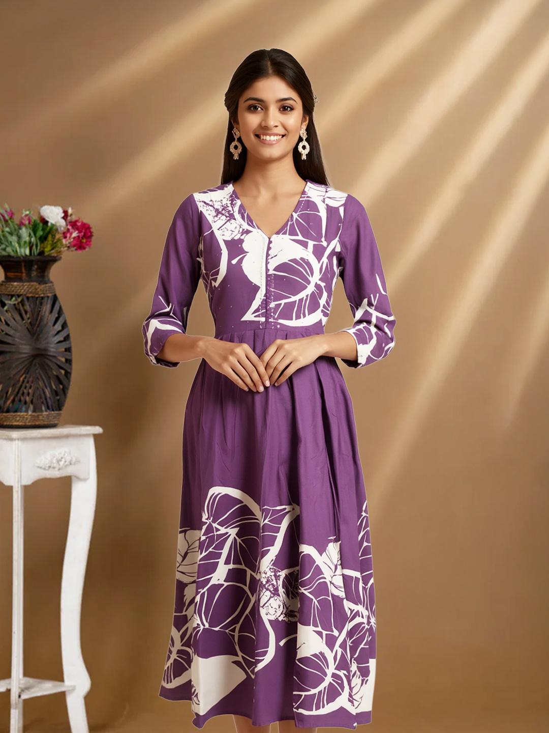 Elevate your ethnic wardrobe with this leaf-print V-neck kurti, designed to bring subtle elegance to your everyday wear. The delicate floral-leaf patterns at the hem and sleeves add a graceful charm that’s both minimal and stylish.