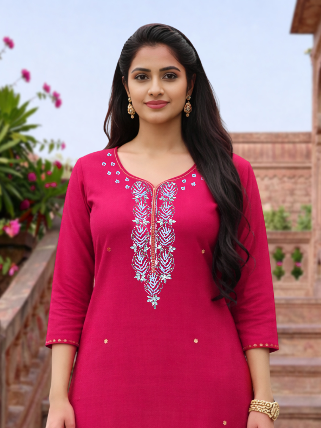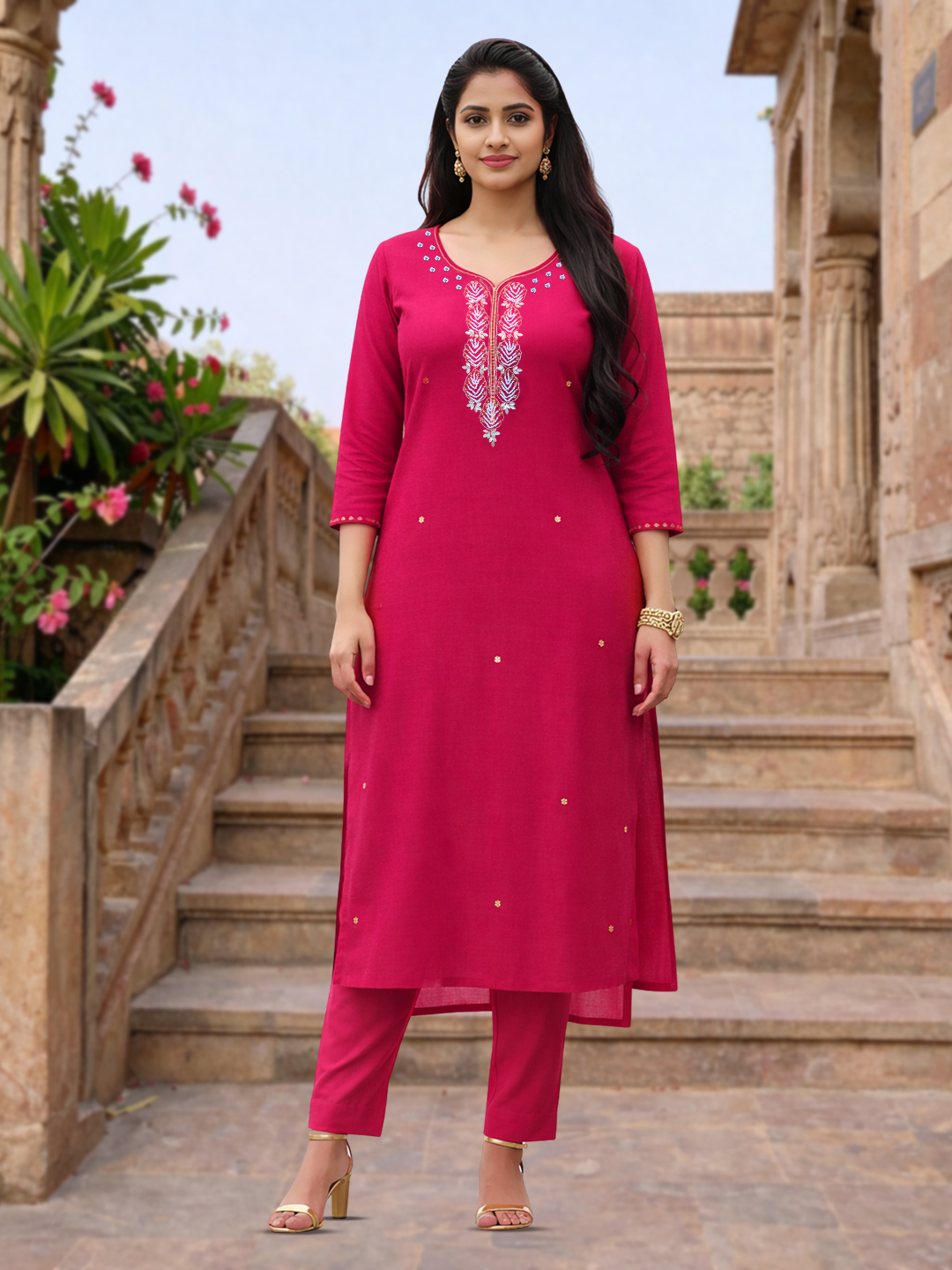 A perfect blend of tradition and contemporary design, this salwar suit set is ideal for festive functions, cultural events, or casual gatherings. Its elegant embroidery and chic neckline make it a versatile wardrobe essential.
