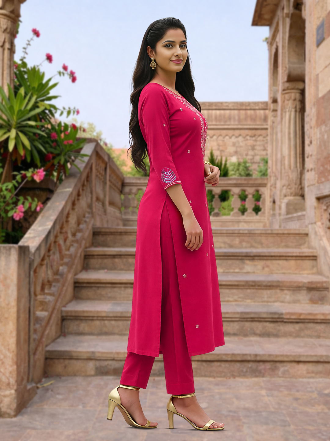 This beautifully coordinated set includes a kurta, straight-fit pants, and a matching dupatta, giving you a ready-to-wear ensemble. The dupatta complements the kurta’s embroidery for a cohesive and stylish ethnic look.