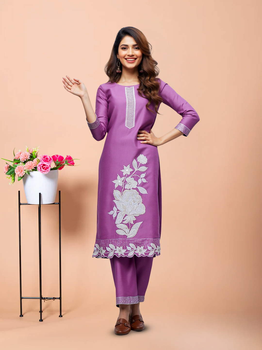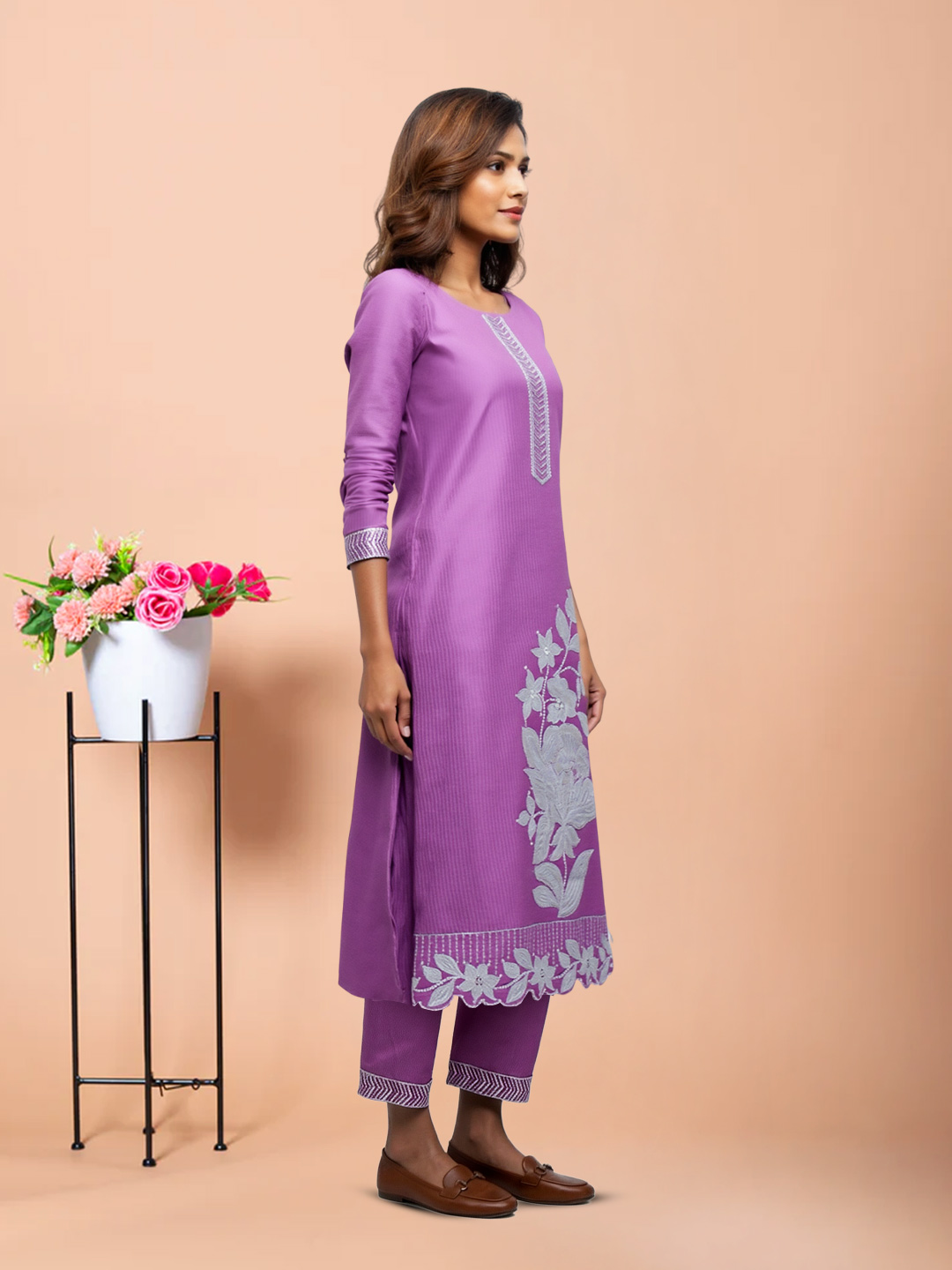 Designed for effortless wear, this straight-fit salwar suit offers a flattering silhouette without compromising on comfort. The kurta showcases intricate panel embroidery, complemented by embroidered cuffs and hem detailing. The floral embroidered dupatta with scalloped edges completes the look with soft sophistication.