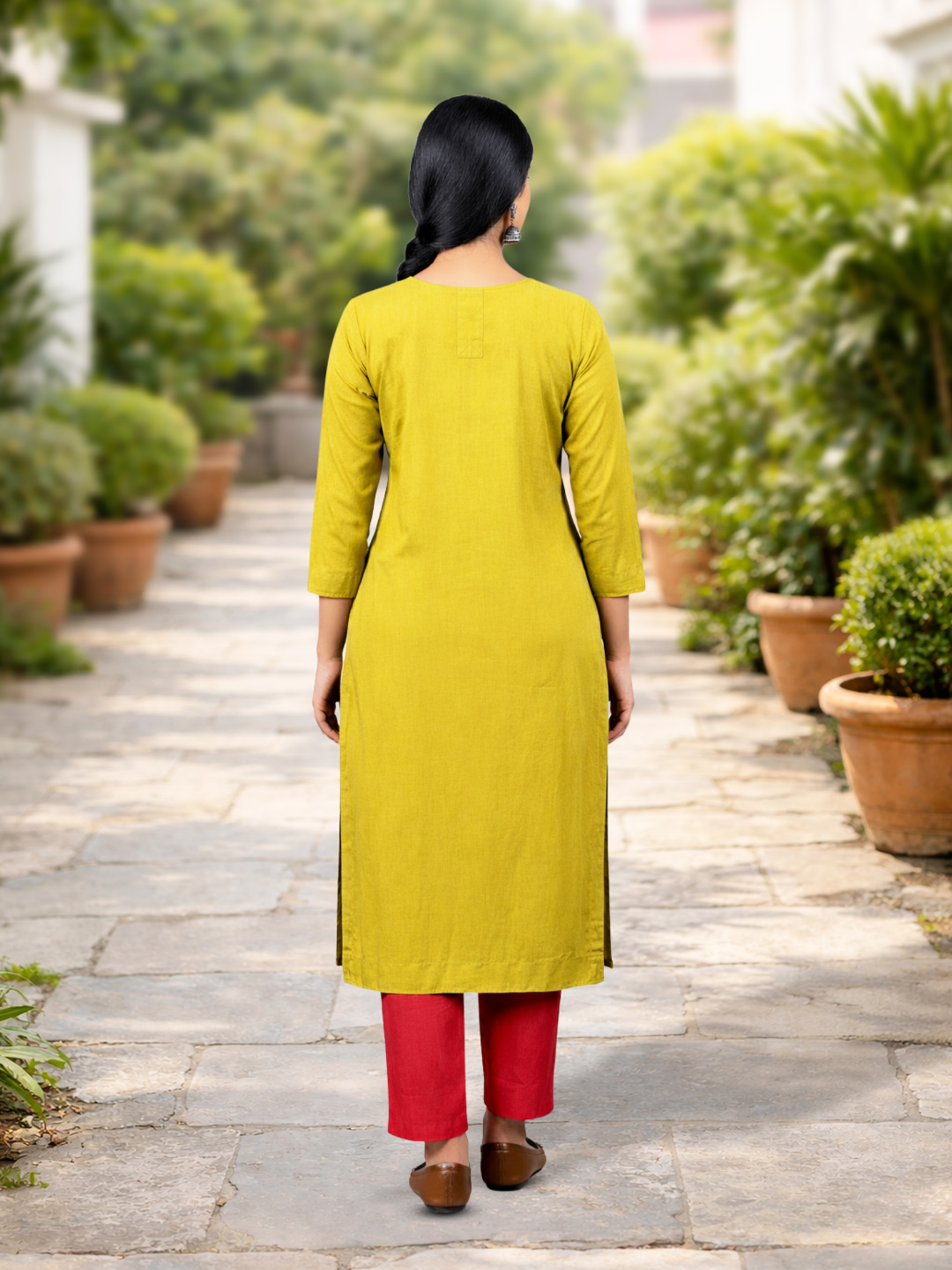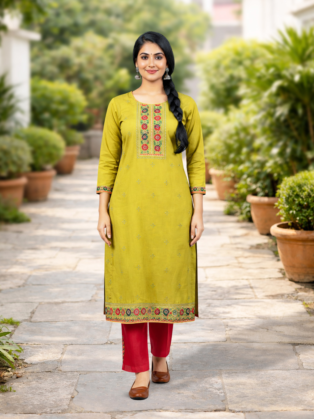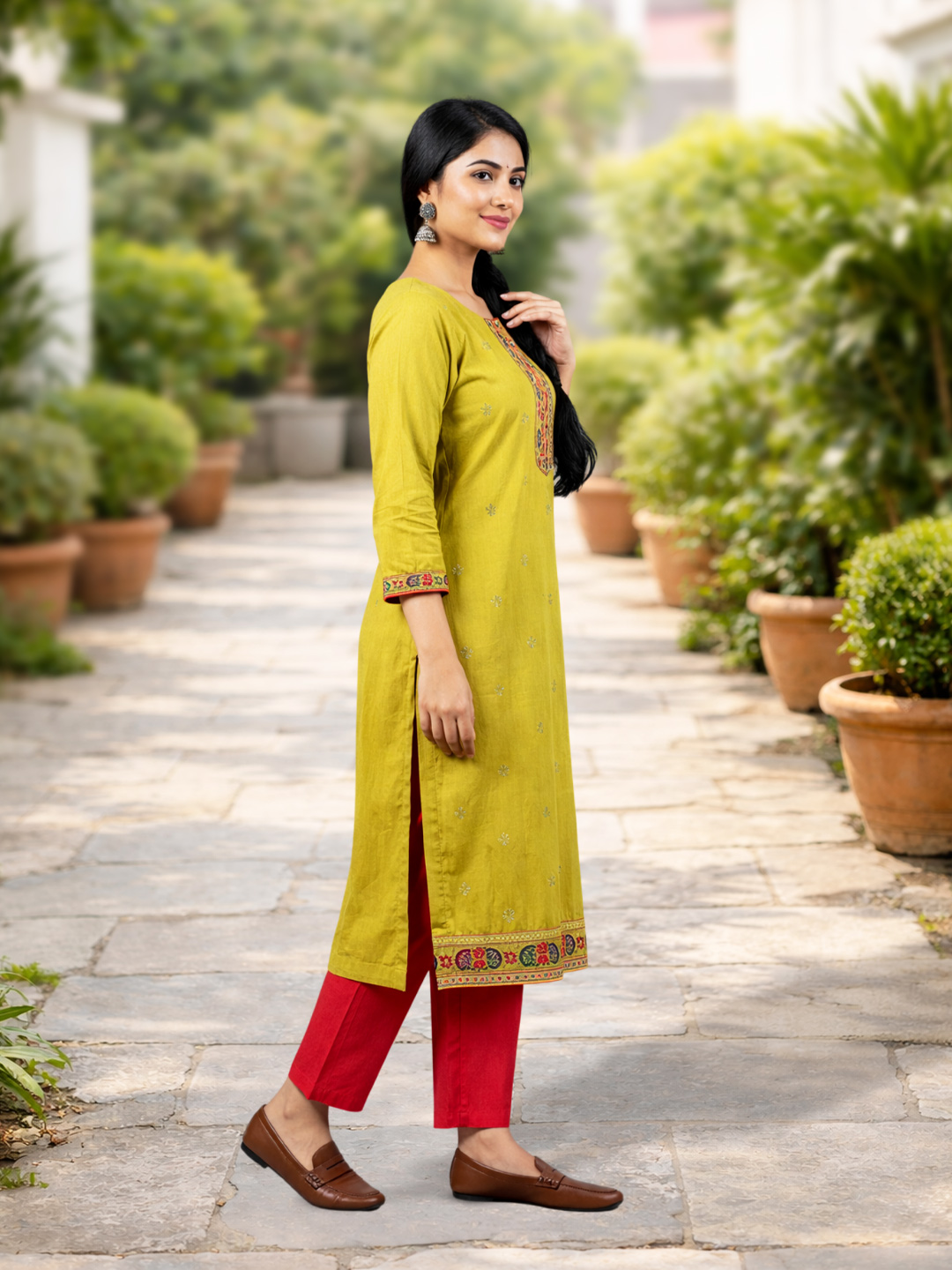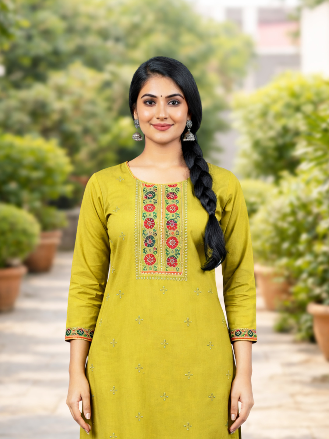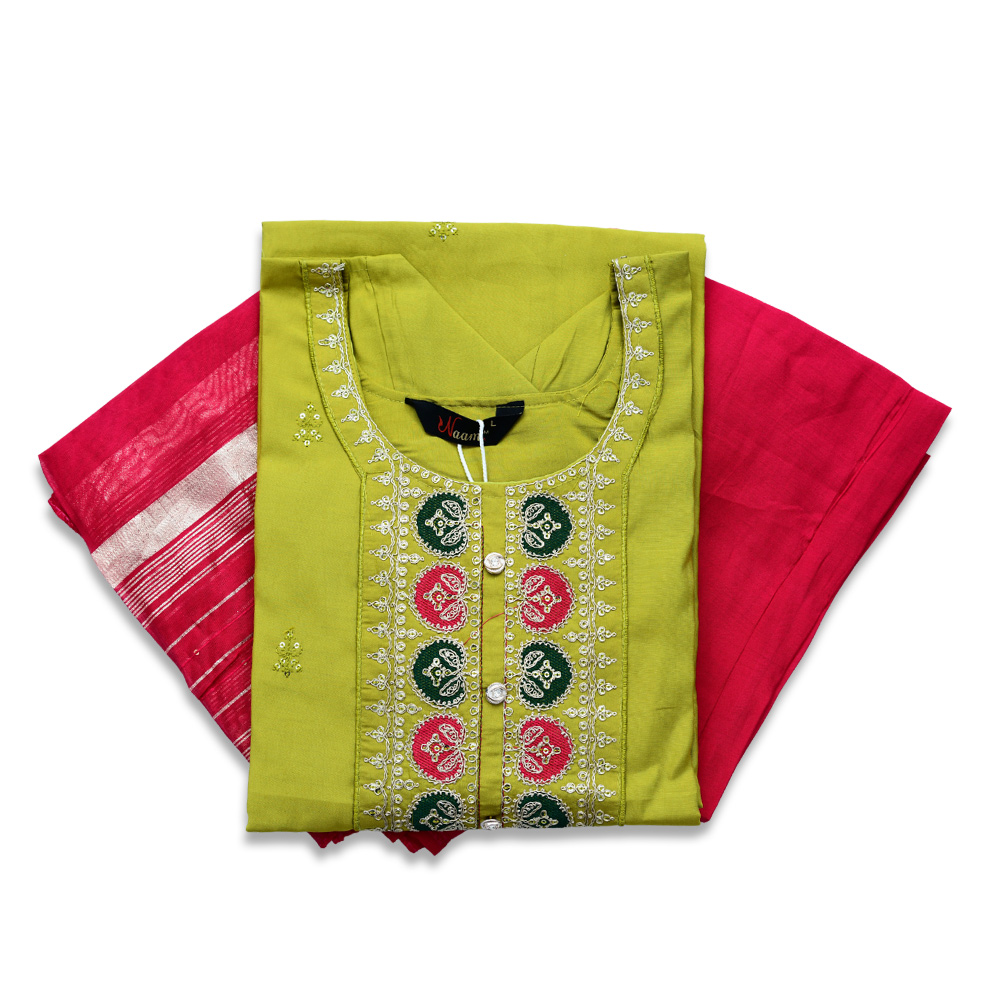 Bring out your inner glow with this elegant embroidered suit set. The intricate detailing on the neckline, hem, and sleeves enhances its festive appeal, while the straight-cut design offers a relaxed yet stylish fit. Perfect for celebrations and cultural occasions.