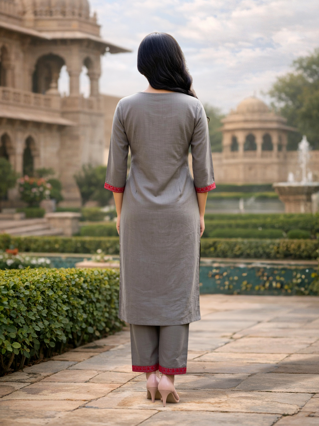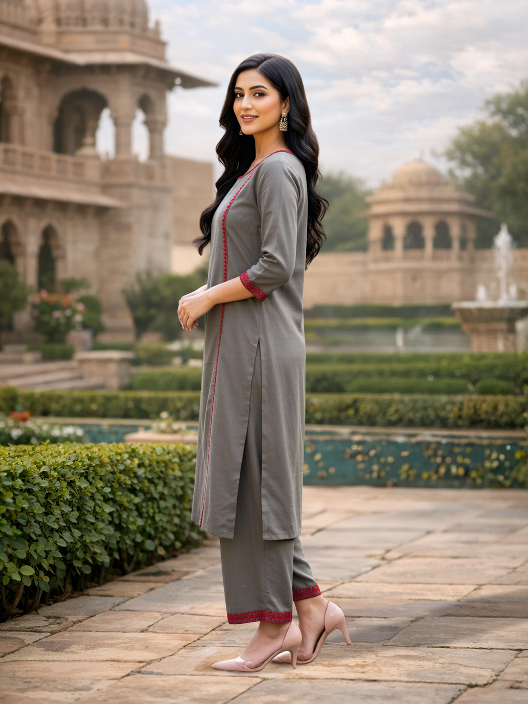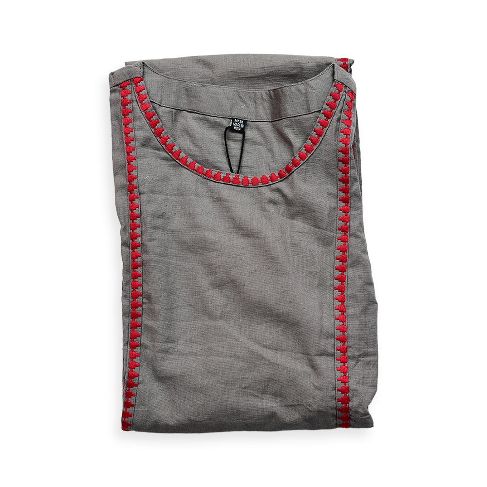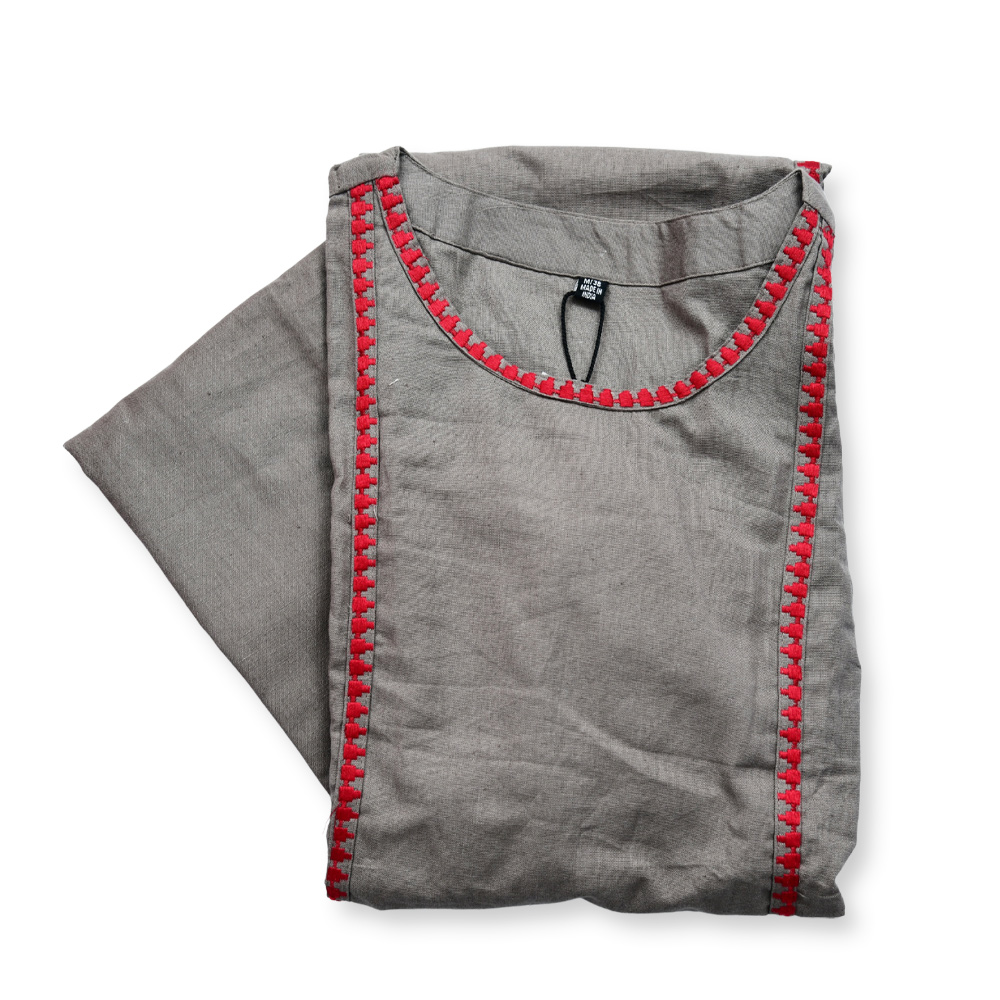 Delicate red embroidery adorning the sides, sleeves, and pant hems adds a beautiful contrast to the subtle gray base. The intricate craftsmanship brings a refined touch, making the outfit stand out with understated luxury.