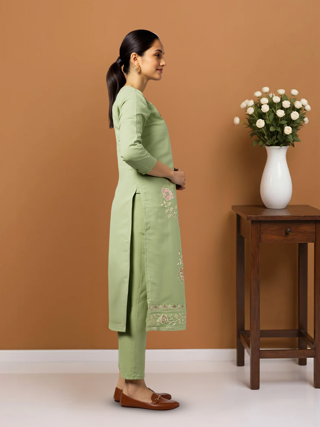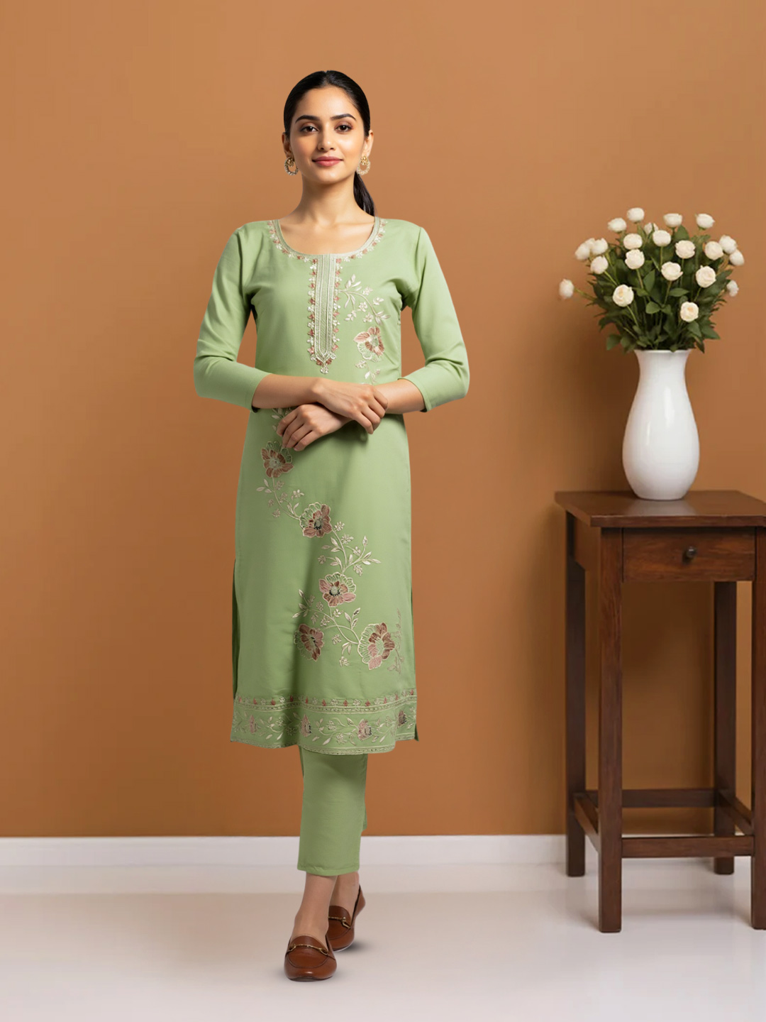 Celebrate tradition with a modern twist in this Elegant Traditional Floral Embroidery Salwar Suit Set. The round neckline adds a soft touch of elegance, while the intricate floral embroidery brings a burst of color and charm to the kurta. The matching embroidered dupatta elevates the look, adding a rich, graceful finish, while the straight pants offer a sleek, contemporary look. This set is perfect for anyone looking to add a touch of floral elegance to their festive or formal wardrobe.