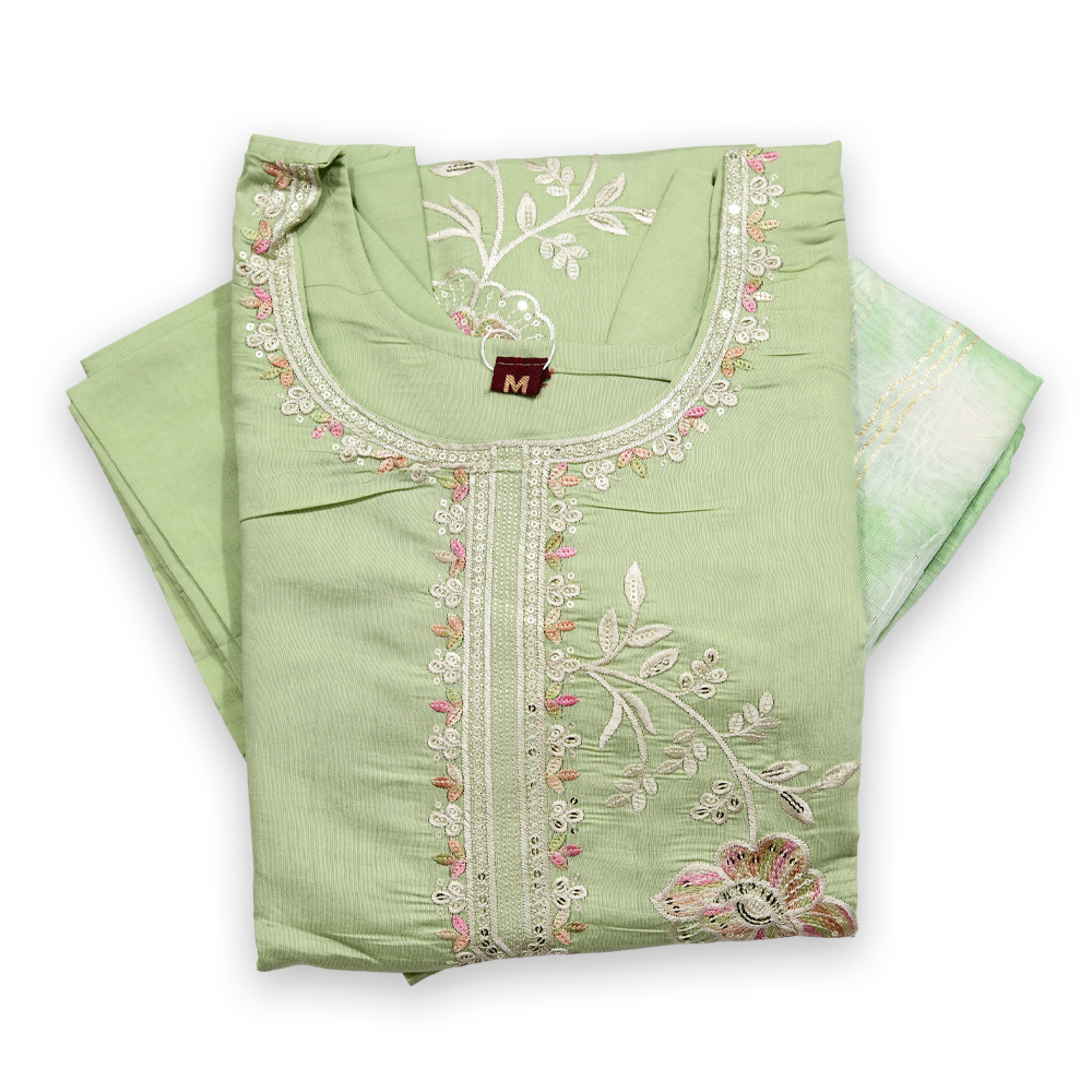 Step into a world of grace and tradition with the Elegant Traditional Floral Embroidery Salwar Suit Set. The beautifully crafted round neckline adds a subtle yet sophisticated touch to the ensemble, while the intricate floral embroidery brings timeless charm to the design. Paired with a matching embroidered dupatta and straight pants, this set offers a sleek and flattering silhouette, perfect for any festive occasion, wedding, or family gathering. Crafted with premium fabric, it ensures you stay comfortable and stylish all day long.