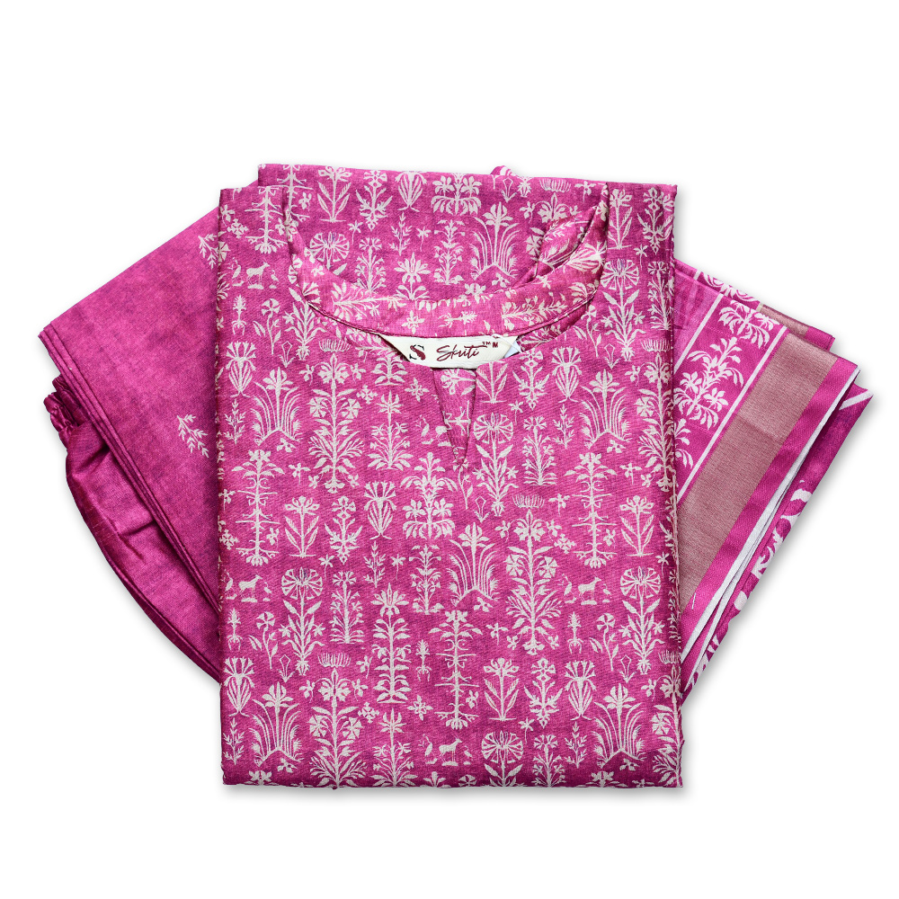 Celebrate tradition with a contemporary twist in this elegant three-piece ensemble. The detailed floral print enhances the kurta’s refined straight-cut design, while the matching pants create a cohesive look. Made from breathable fabric, it ensures comfort without compromising on style. The coordinated dupatta adds charm and completes the outfit, making it suitable for office wear, family gatherings, and festive celebrations alike.