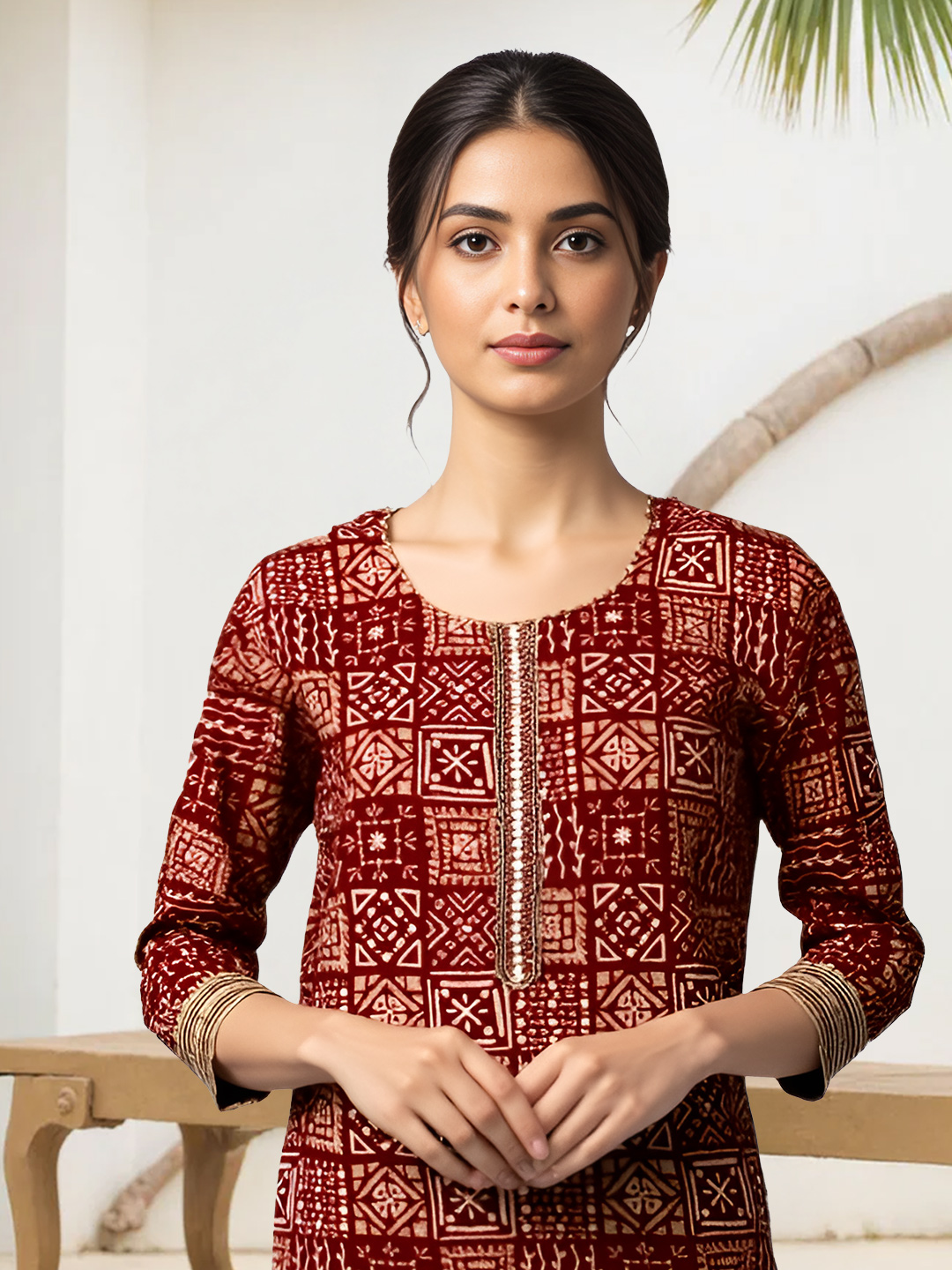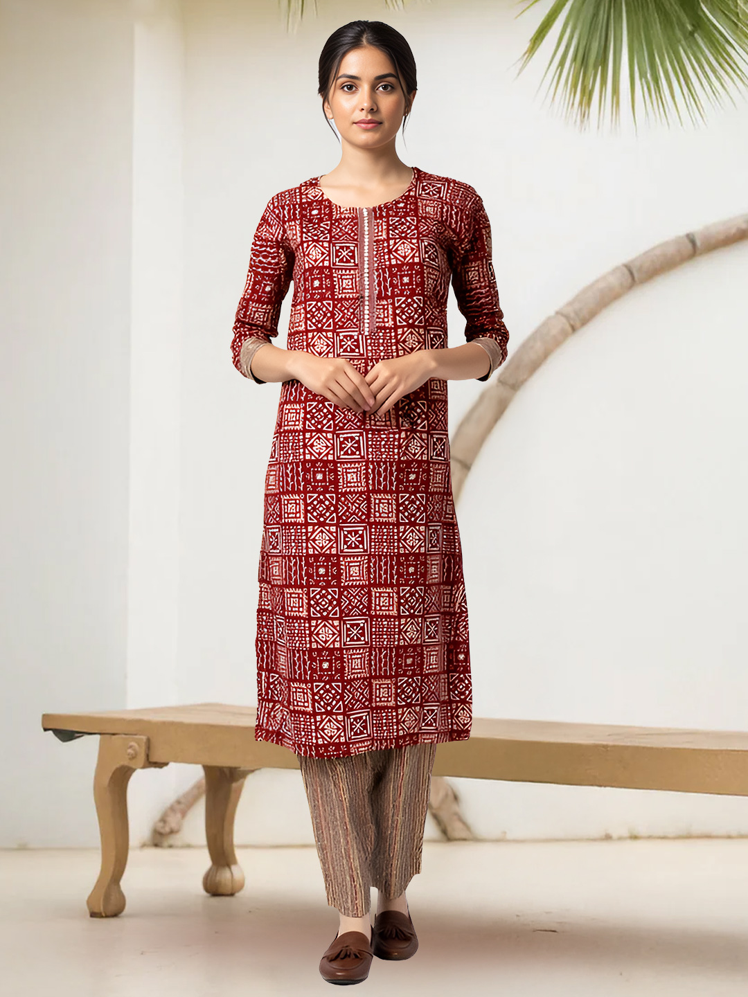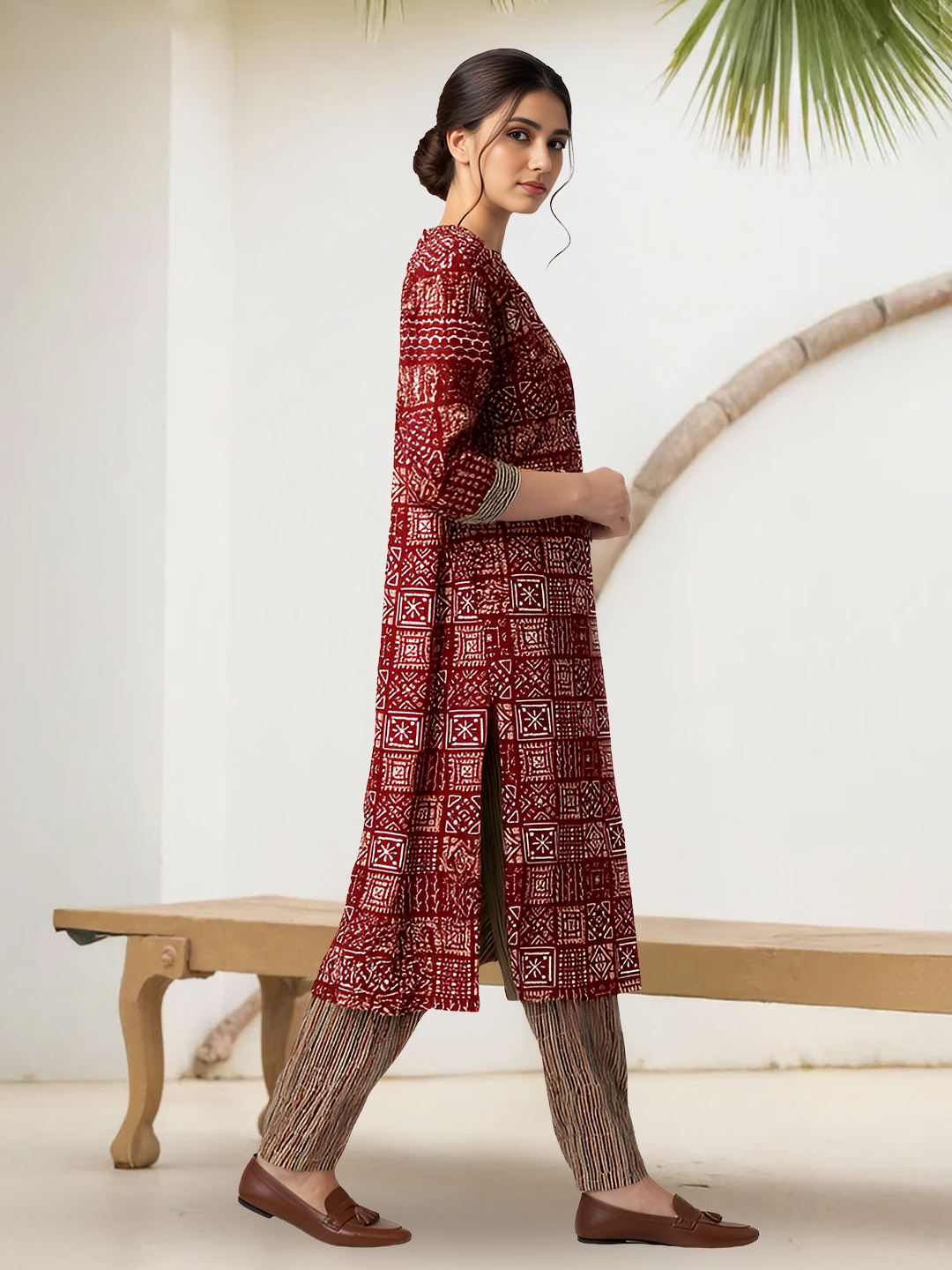 Paired with textured beige striped pants, this set ensures a relaxed and flattering fit. Designed for comfort without compromising style, the pants allow ease of movement while maintaining a polished, traditional appearance.