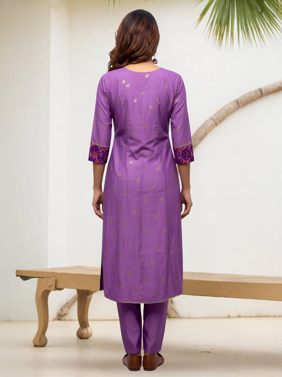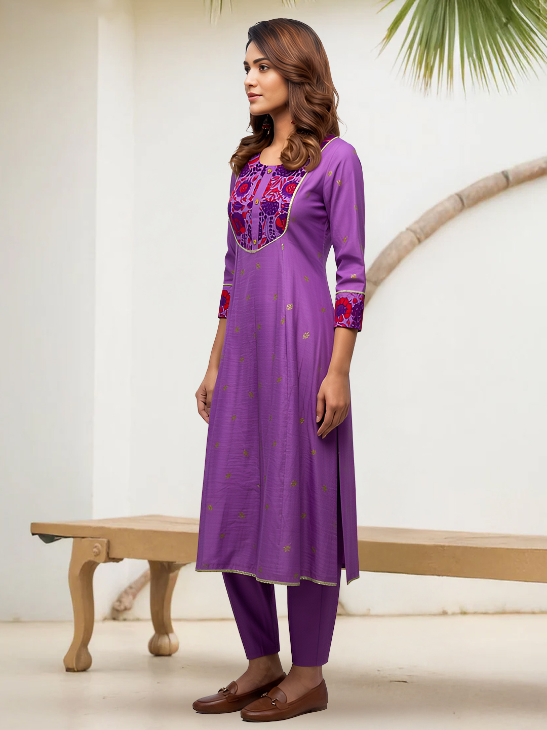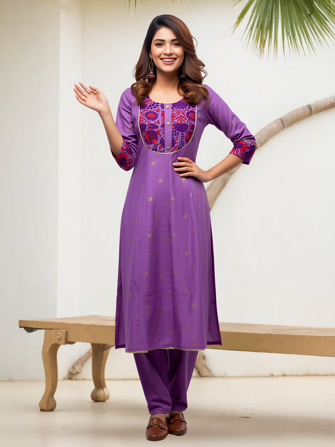 Made with premium breathable fabric, this salwar suit set promises unmatched comfort without compromising on style. The beautifully detailed yoke with intricate prints and button embellishments creates a refined yet modern appeal. Three-quarter sleeves with coordinated printed cuffs complete the polished look.