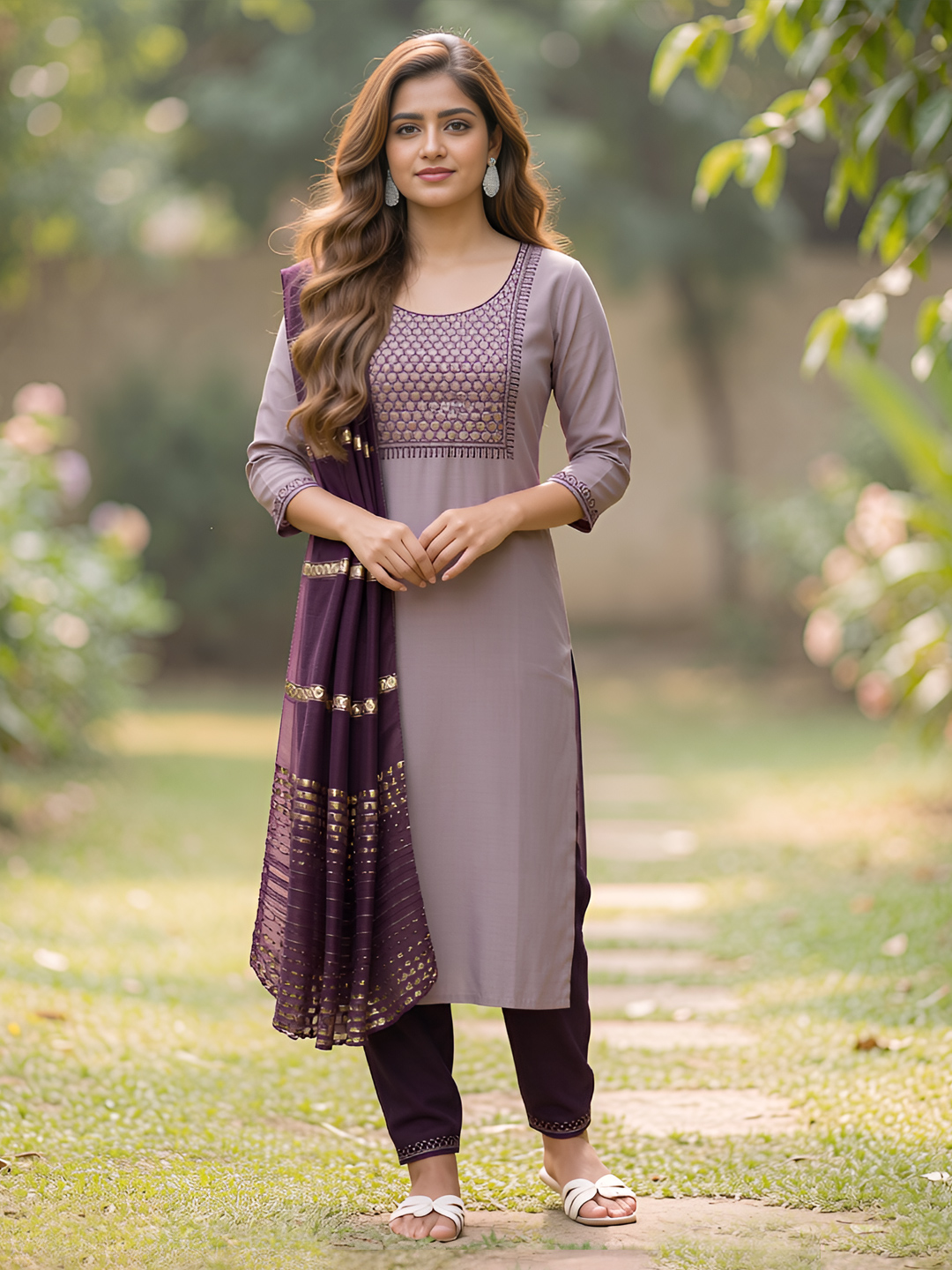 Step into refined style with this Elegant Yoke Geometric Embroidery Salwar Suit Set. Crafted from soft, breathable fabric, it ensures all-day comfort while keeping you effortlessly chic. The intricately embroidered geometric yoke adds a modern artistic touch, making this outfit perfect for both casual and semi-festive occasions.