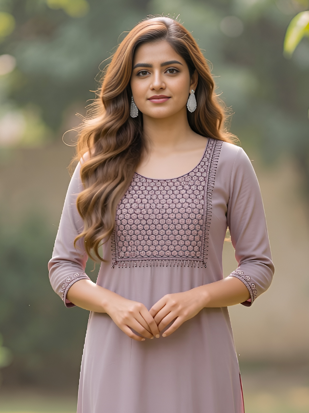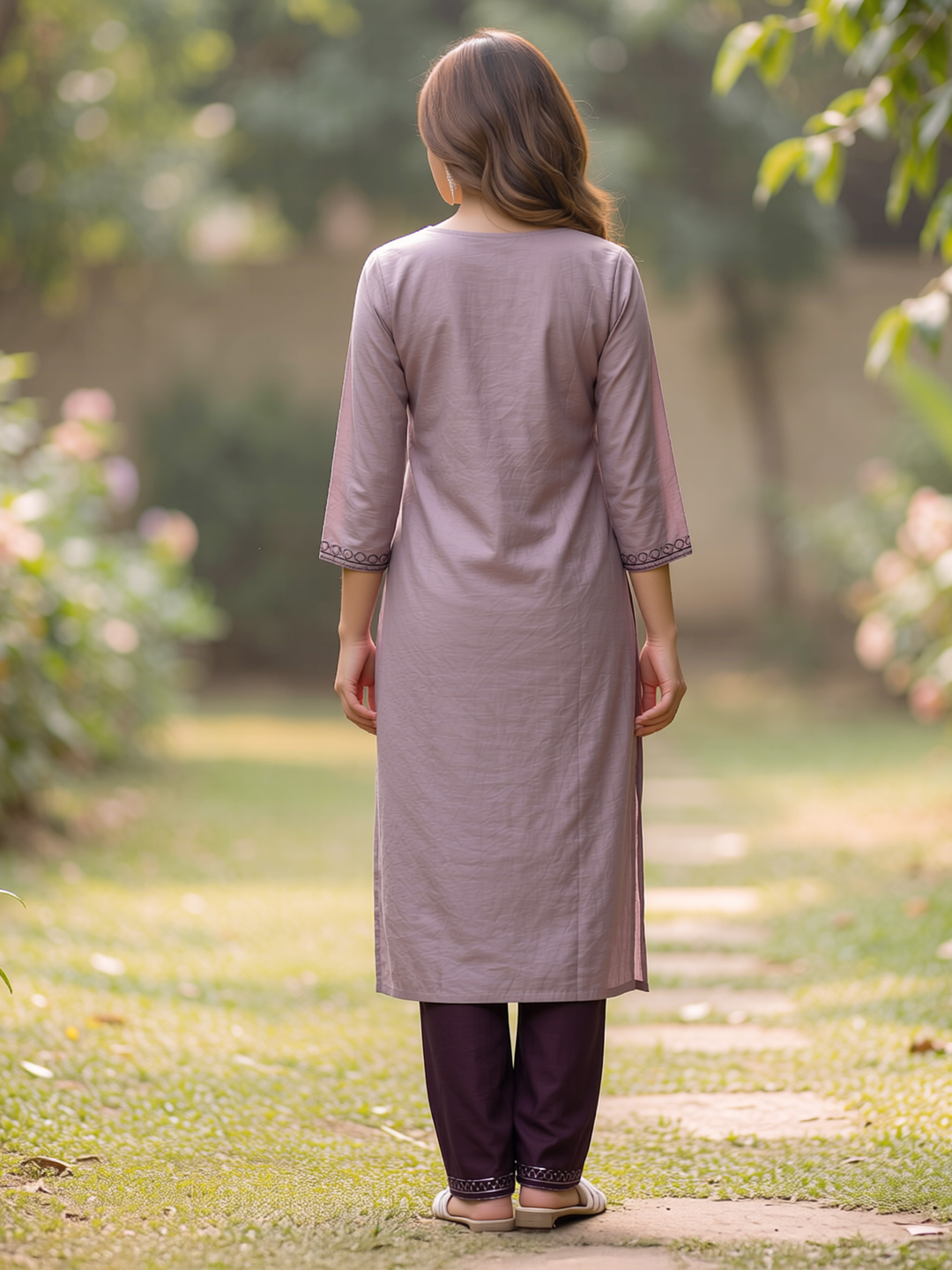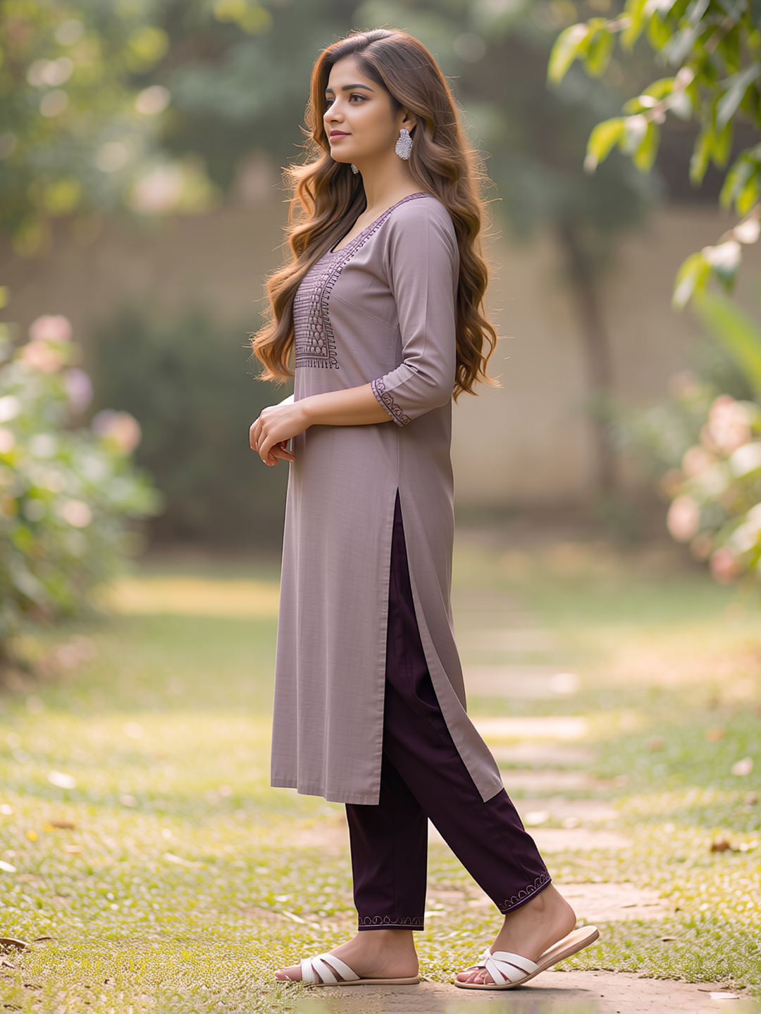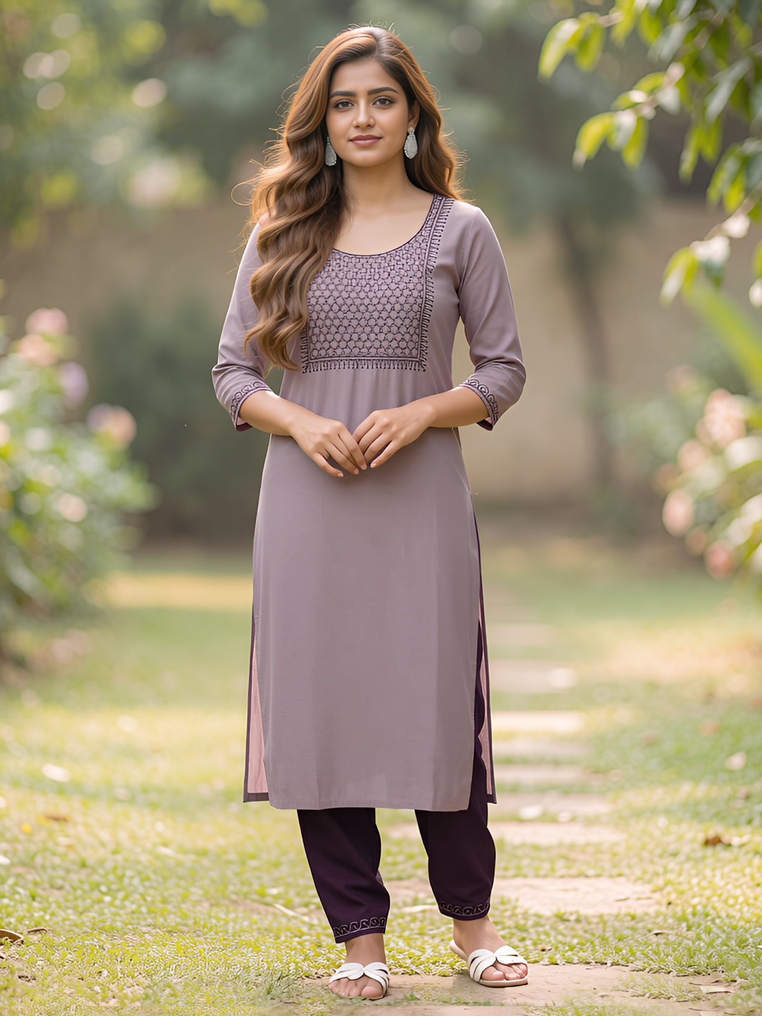 Upgrade your everyday ethnic look with this thoughtfully designed ensemble. The geometric yoke embroidery adds a refined focal point, while the straight-cut kurta and tailored pants ensure comfort and ease. Finished with three-quarter sleeves, this outfit strikes the perfect balance between minimalism and elegance.