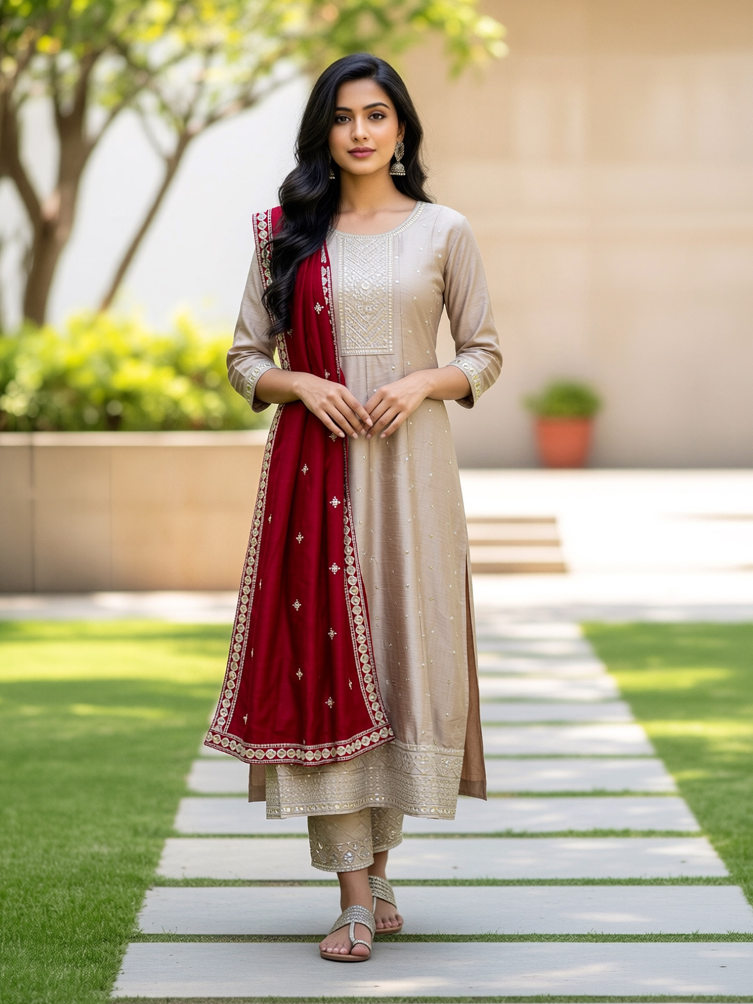 Designed to make a lasting impression, this Anarkali suit set combines ornate embroidery with a soft, breathable fabric for all-day comfort. The detailed threadwork across the kurta adds depth and richness, while the three-quarter sleeves offer both style and practicality. The flared silhouette lends regal charm, beautifully paired with embroidered churidar pants and a decorative dupatta finished with fine border detailing.