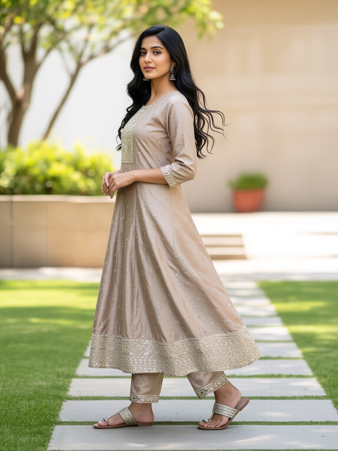 Blending traditional craftsmanship with contemporary ease, this Anarkali suit set offers both luxury and wearability. The richly embroidered front panel and cuffs enhance the overall grandeur, while the subtle flare of the silhouette adds movement and grace. Styled with embroidered churidar bottoms and a decorative dupatta featuring intricate border work, this outfit transitions beautifully from festive celebrations to semi-formal occasions.