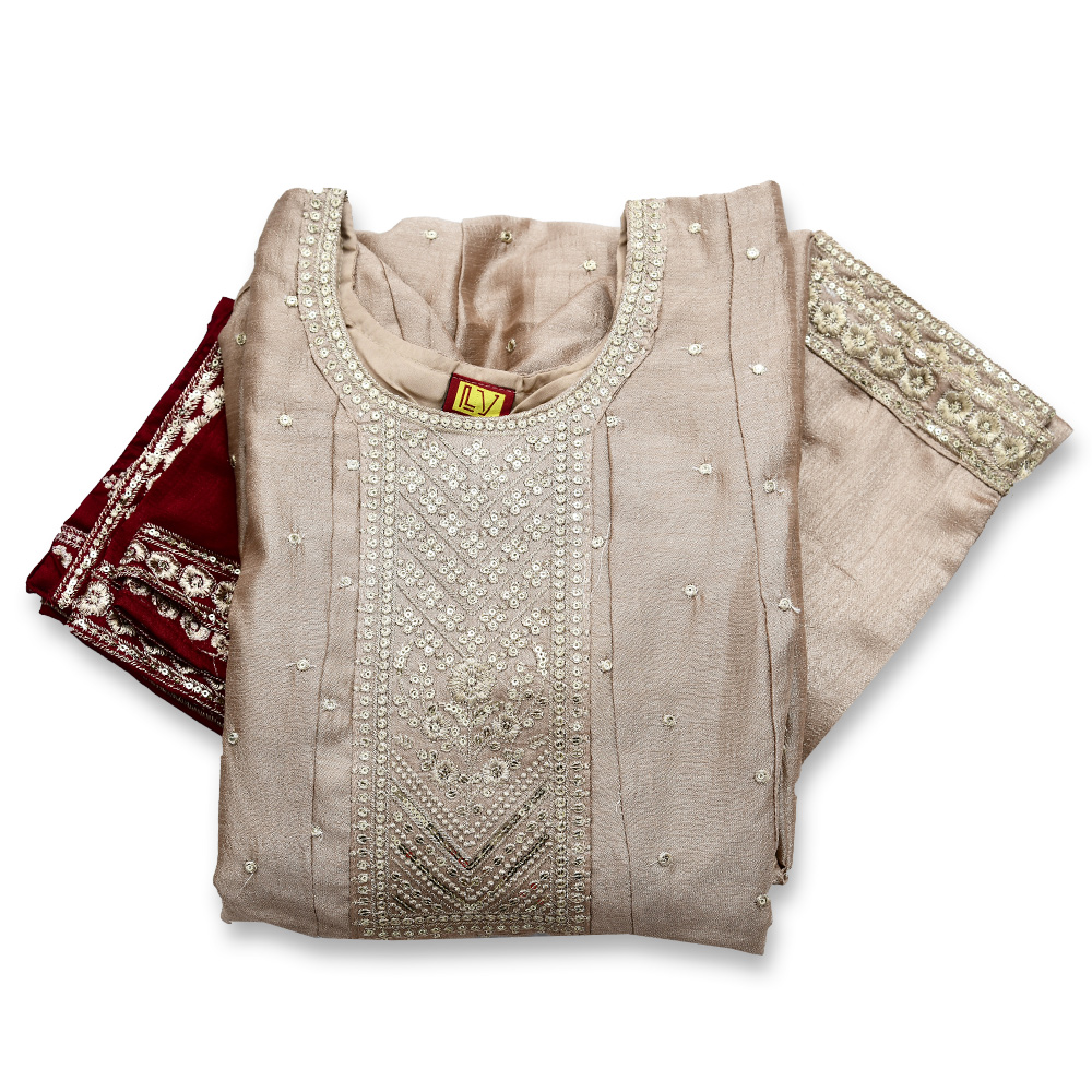 This embellished embroidery Anarkali suit set is a celebration of elegance and fine artistry. The intricate threadwork along the neckline and hemline highlights the sophistication of the design, while the A-line cut creates a flowing, feminine silhouette. Coordinated churidar pants echo the embroidery theme, and the delicately adorned dupatta completes the look with graceful charm. Crafted in lightweight fabric, it ensures comfort throughout festive gatherings and special events.