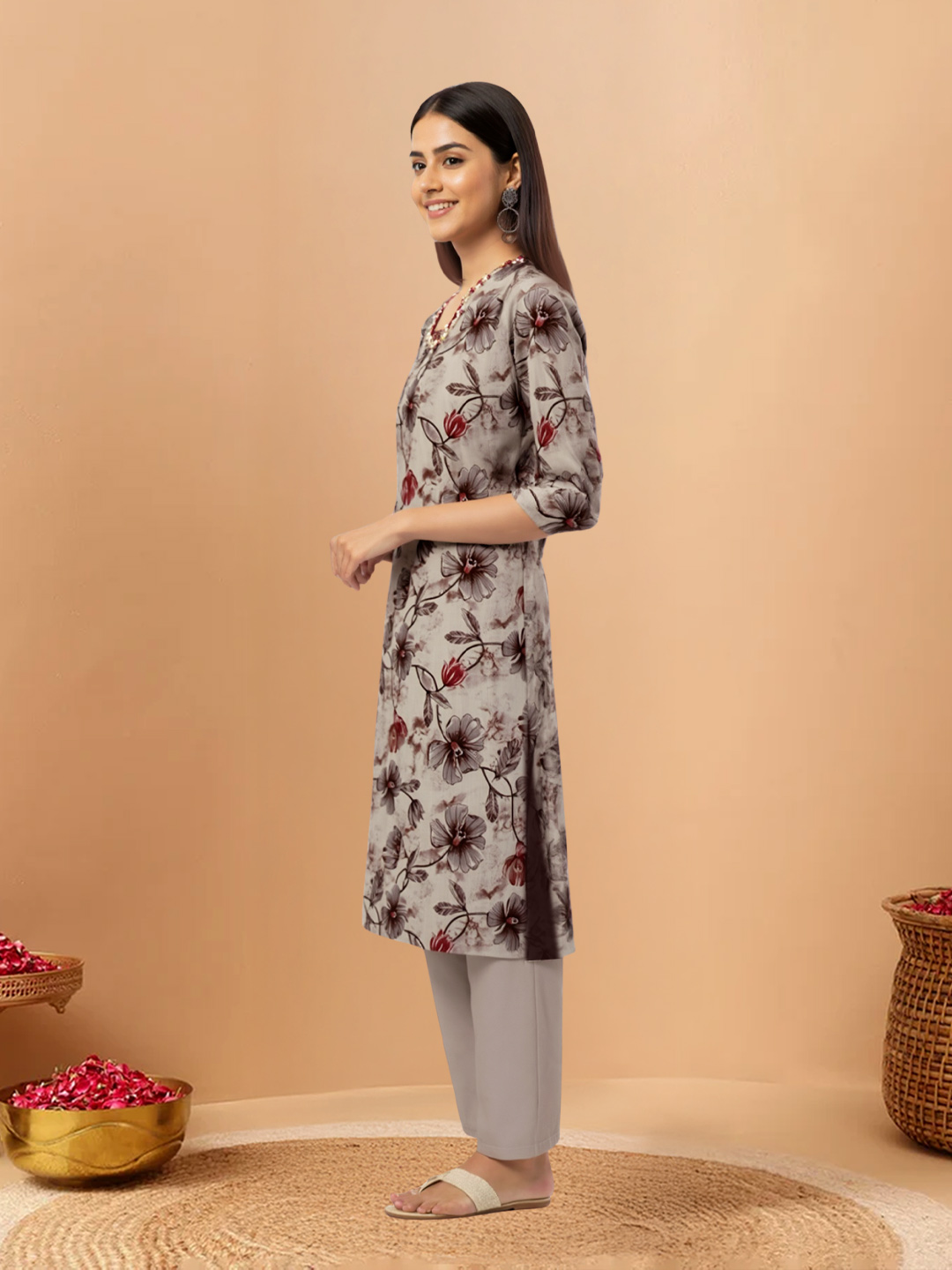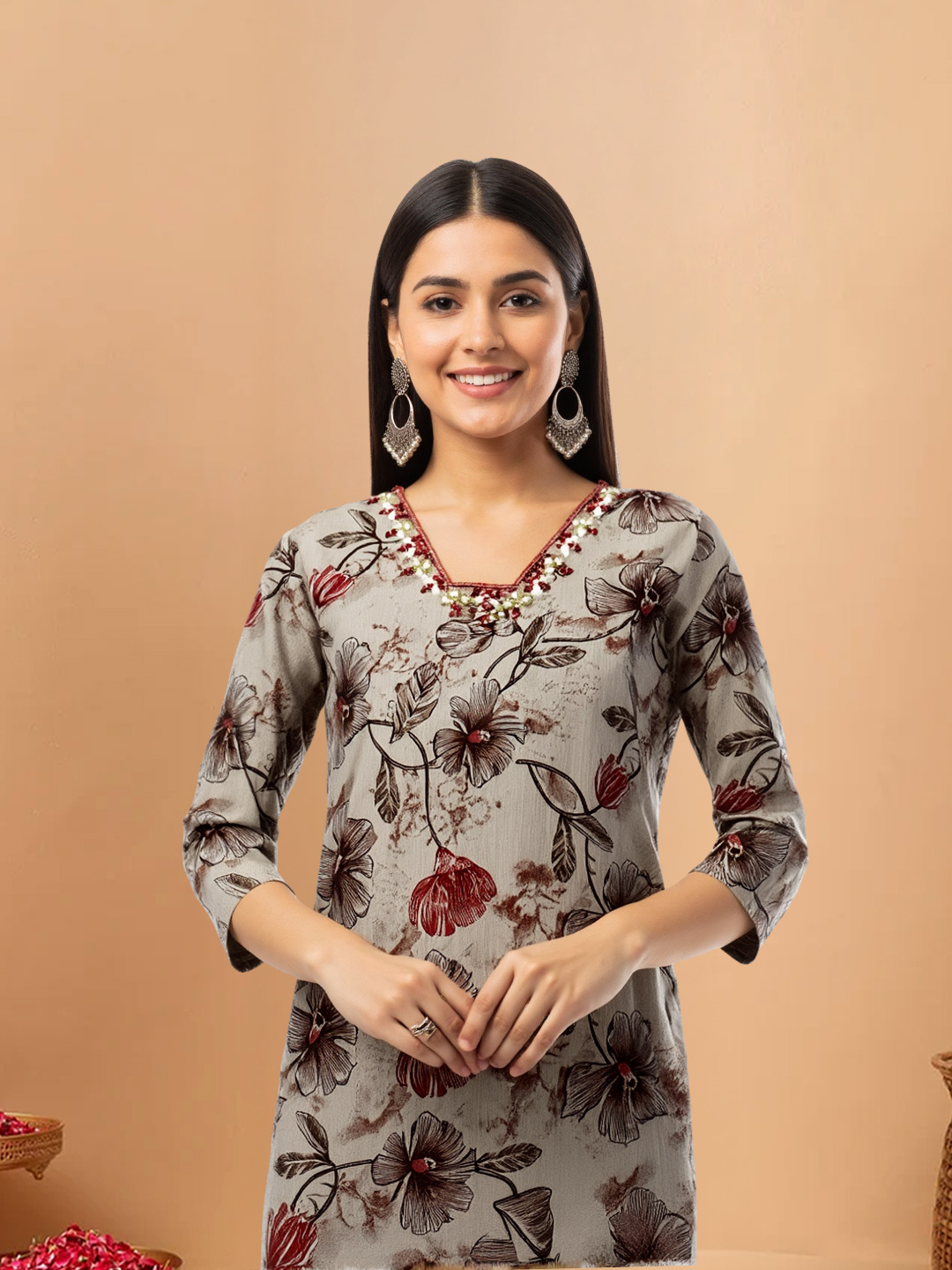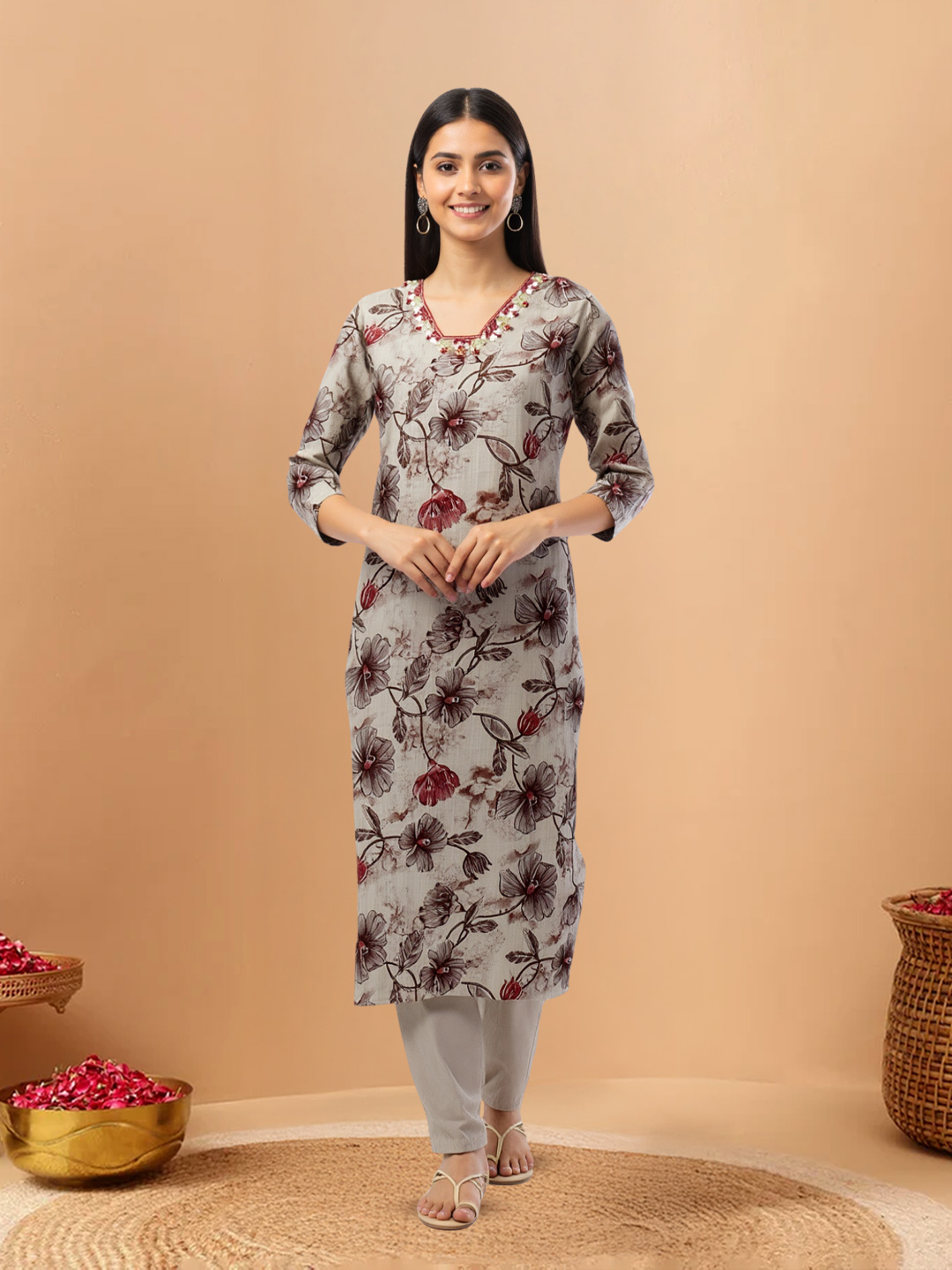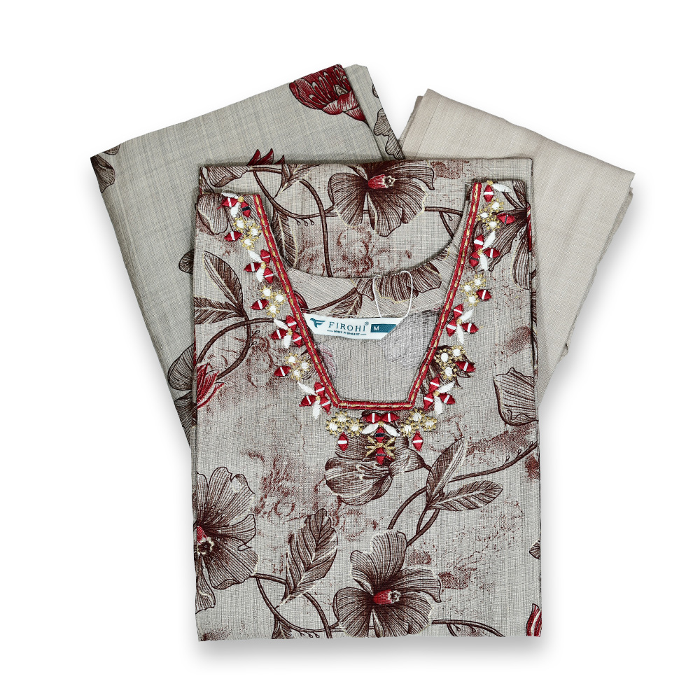 Step into effortless elegance with this Embellished V-Neck Kurta Set. Featuring delicate embroidery on a sleek straight-fit kurta, paired with matching beige trousers and a lightweight floral-stripe dupatta, this ensemble exudes timeless sophistication for casual outings or festive gatherings.