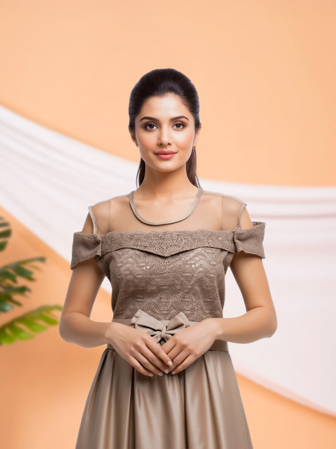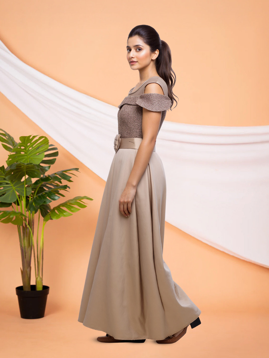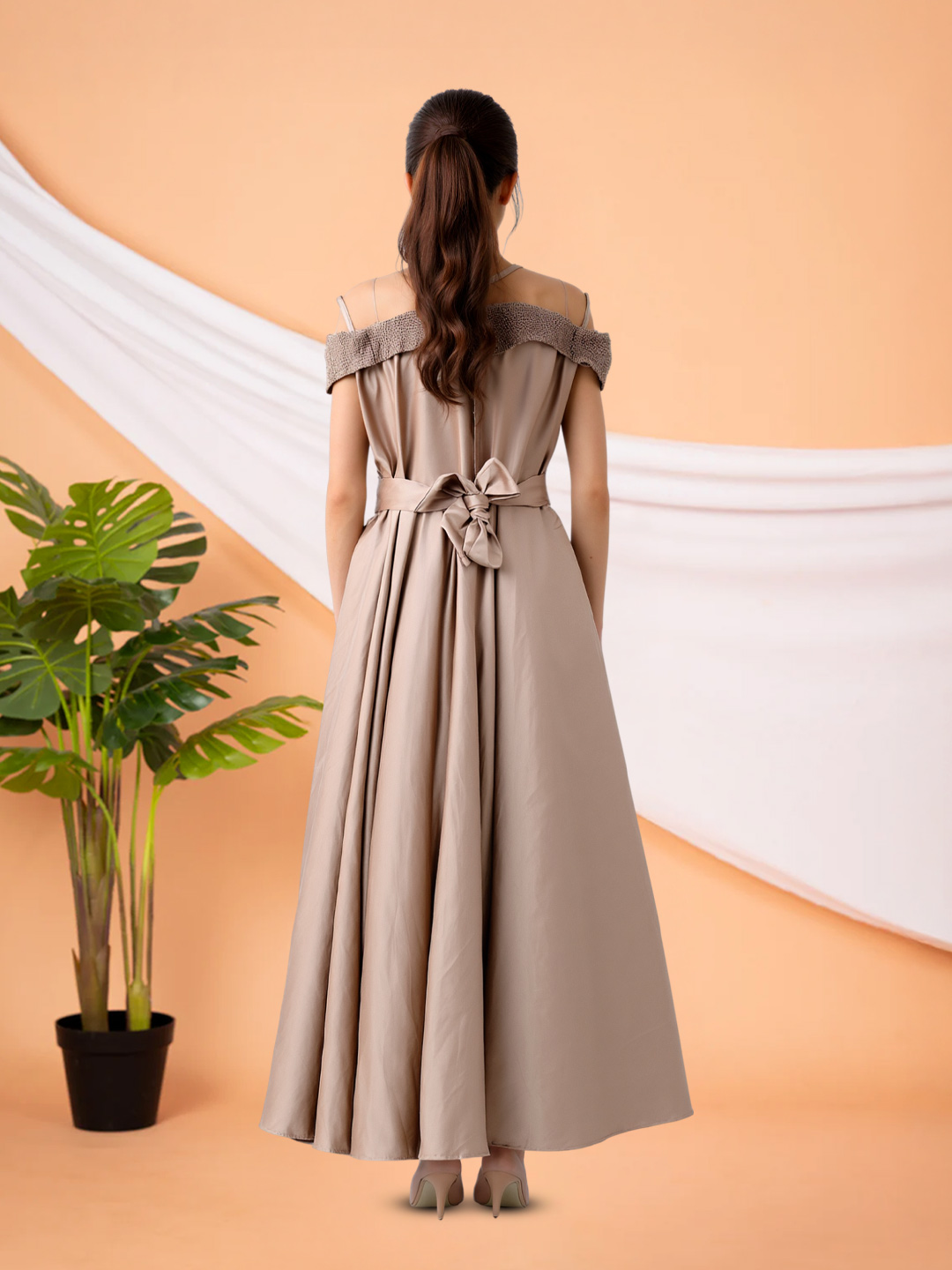 The stylish cold-shoulder sleeves give the gown a modern and fashionable edge, balancing elegance with a touch of contemporary charm. Ideal for evening events, parties, or weddings.