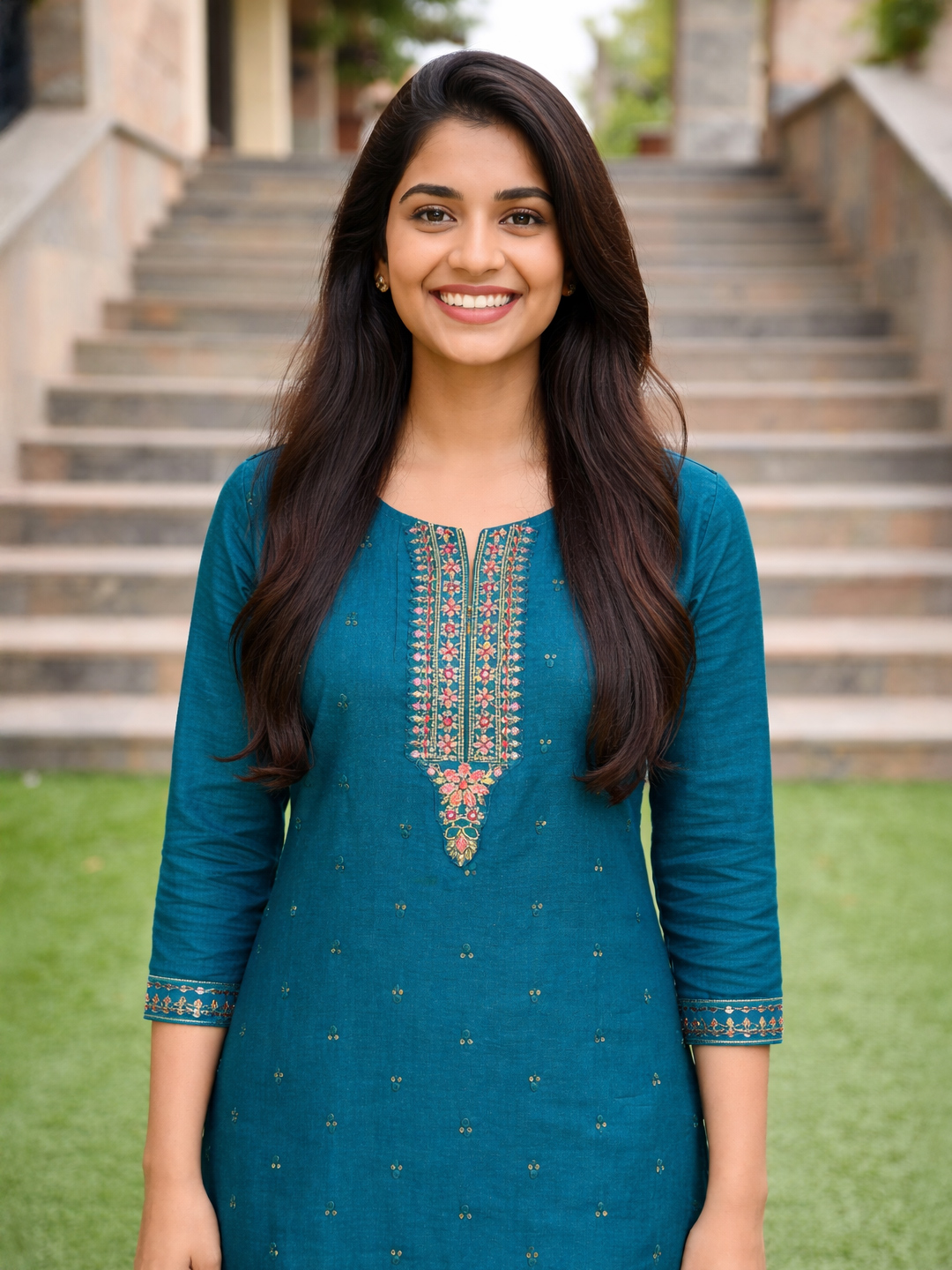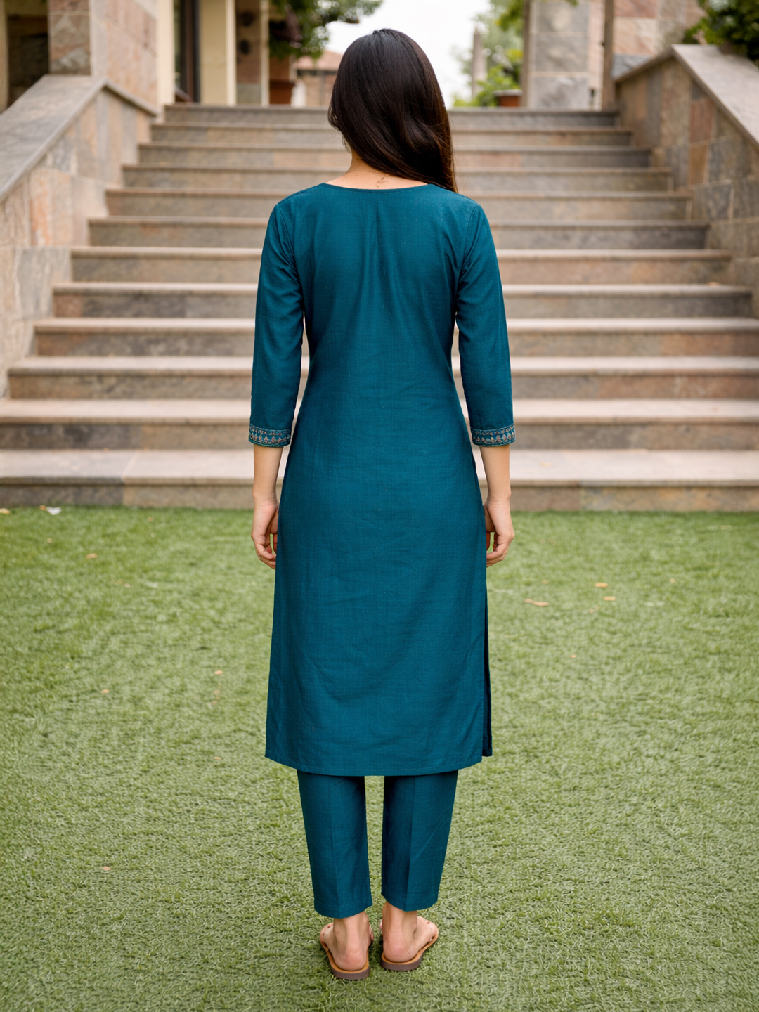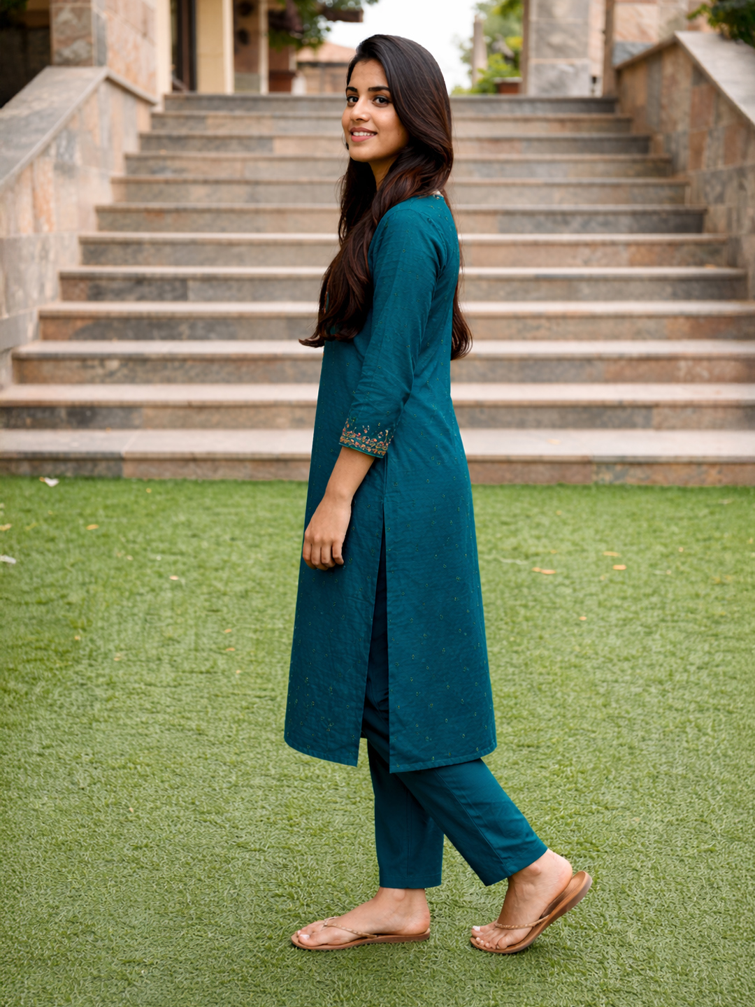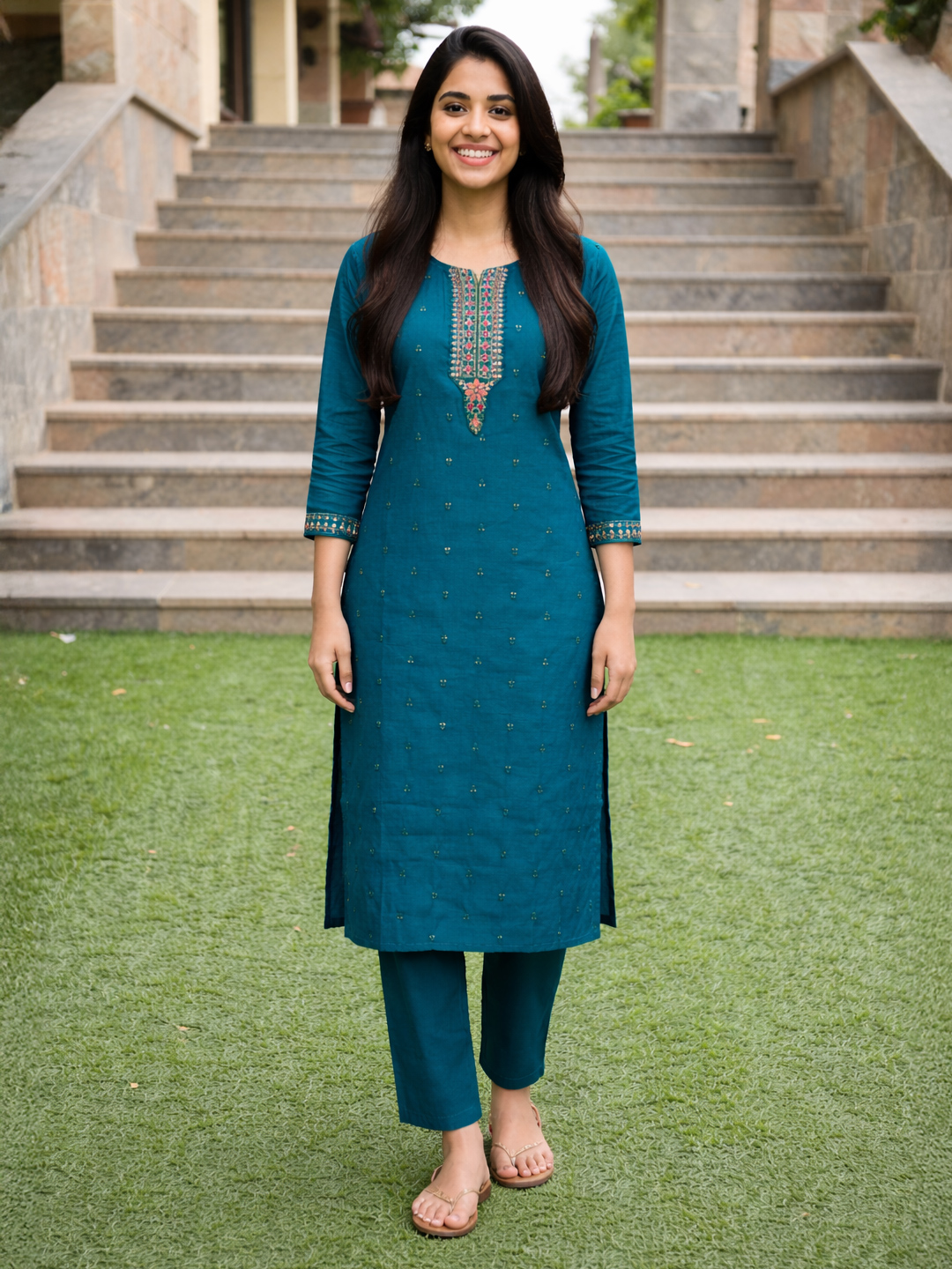 Make a lasting impression with understated embellishments and fine neckline embroidery. The clean silhouette of the straight-fit pants complements the kurta perfectly, while the eye-catching dupatta brings a pop of color and personality to the outfit.