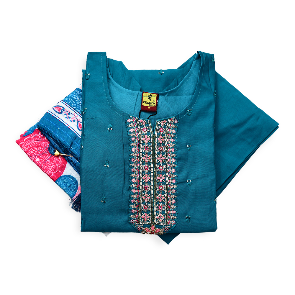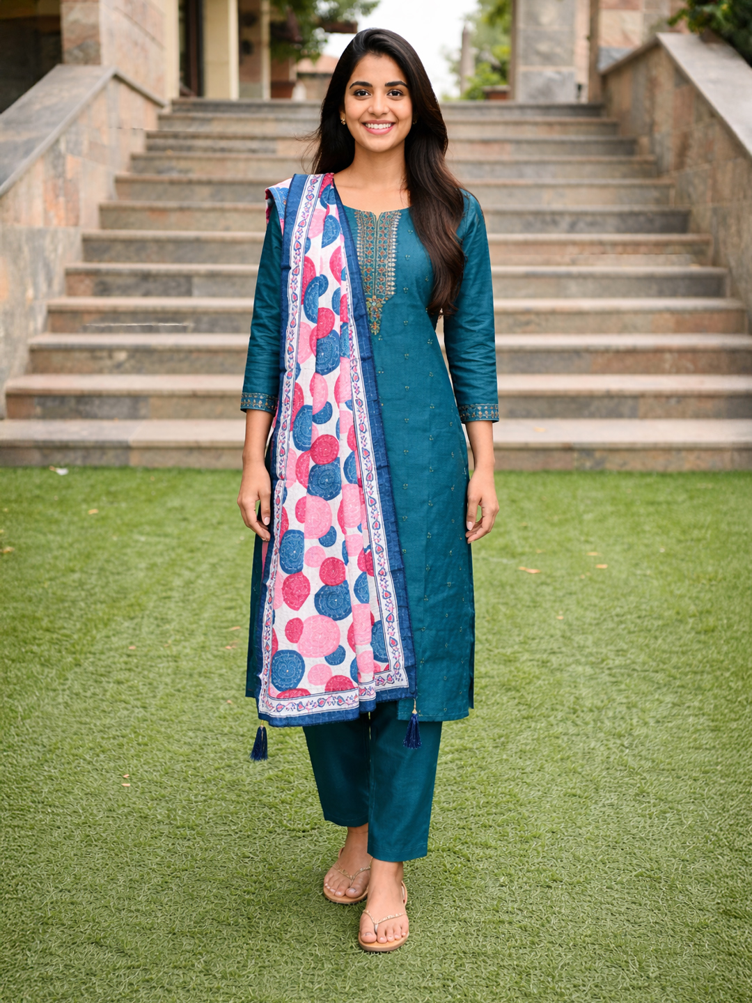 Step into timeless elegance with this beautifully crafted three-piece salwar suit set. The kurta features intricate threadwork along the neckline, adding a refined touch of artistry. Paired with straight-fit pants and a vibrant printed dupatta, this ensemble effortlessly blends tradition with modern charm.