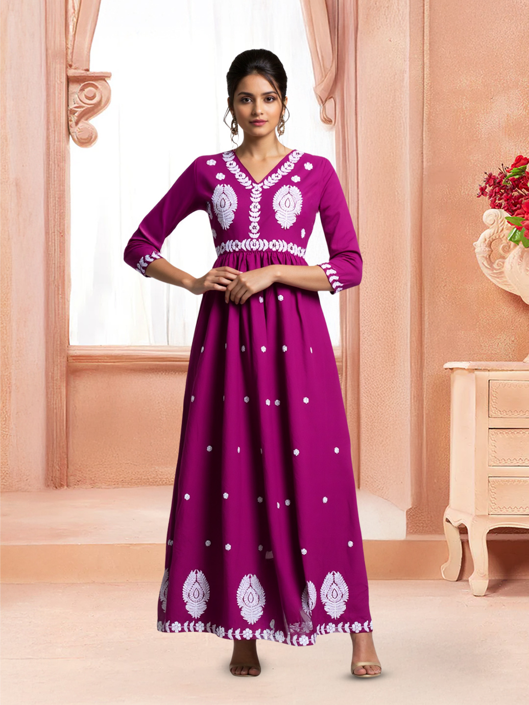 This stunning Anarkali set blends tradition with contemporary flair. The 3/4 sleeves echo the kurta’s embroidered detailing, and the flowing silhouette flatters every body type. Paired with a soft dupatta adorned with understated motifs, it’s the perfect ensemble for festive gatherings.