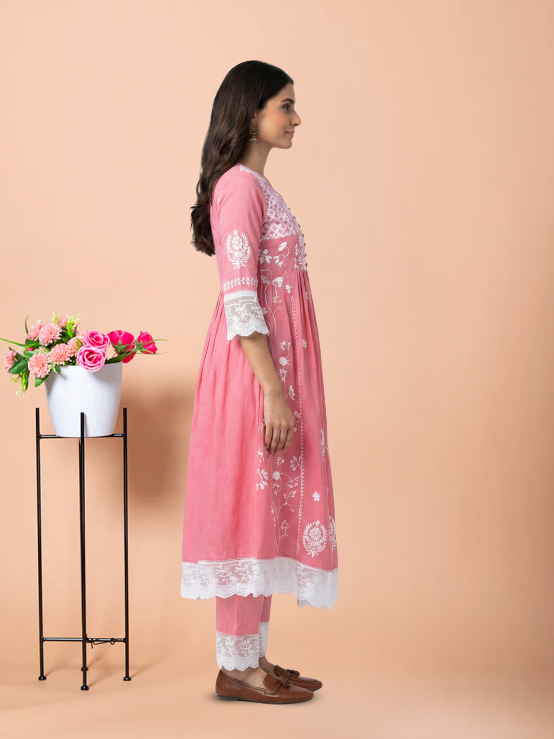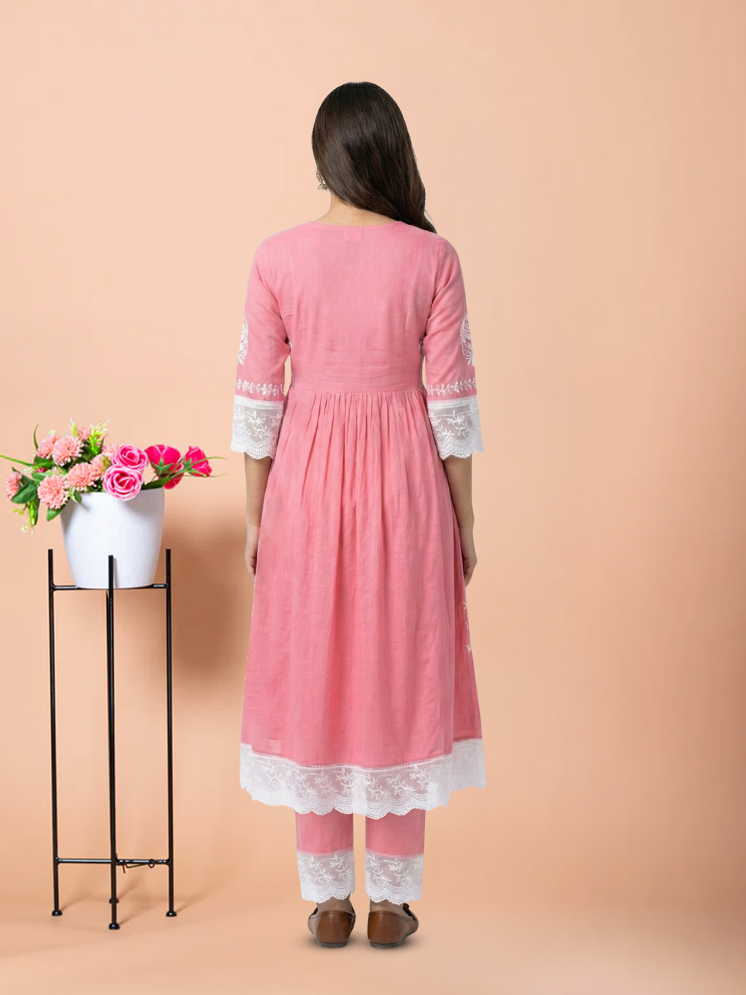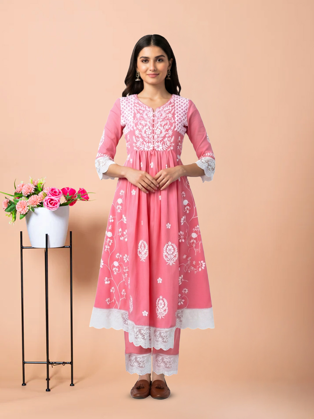 Designed for women who appreciate understated luxury, this Anarkali flare kurta offers a flattering fall with its gathered waistline. The coordinated straight pants provide a balanced silhouette, while the lace-bordered hemline adds a touch of tradition. Ideal for celebrations, family functions, or graceful everyday wear.