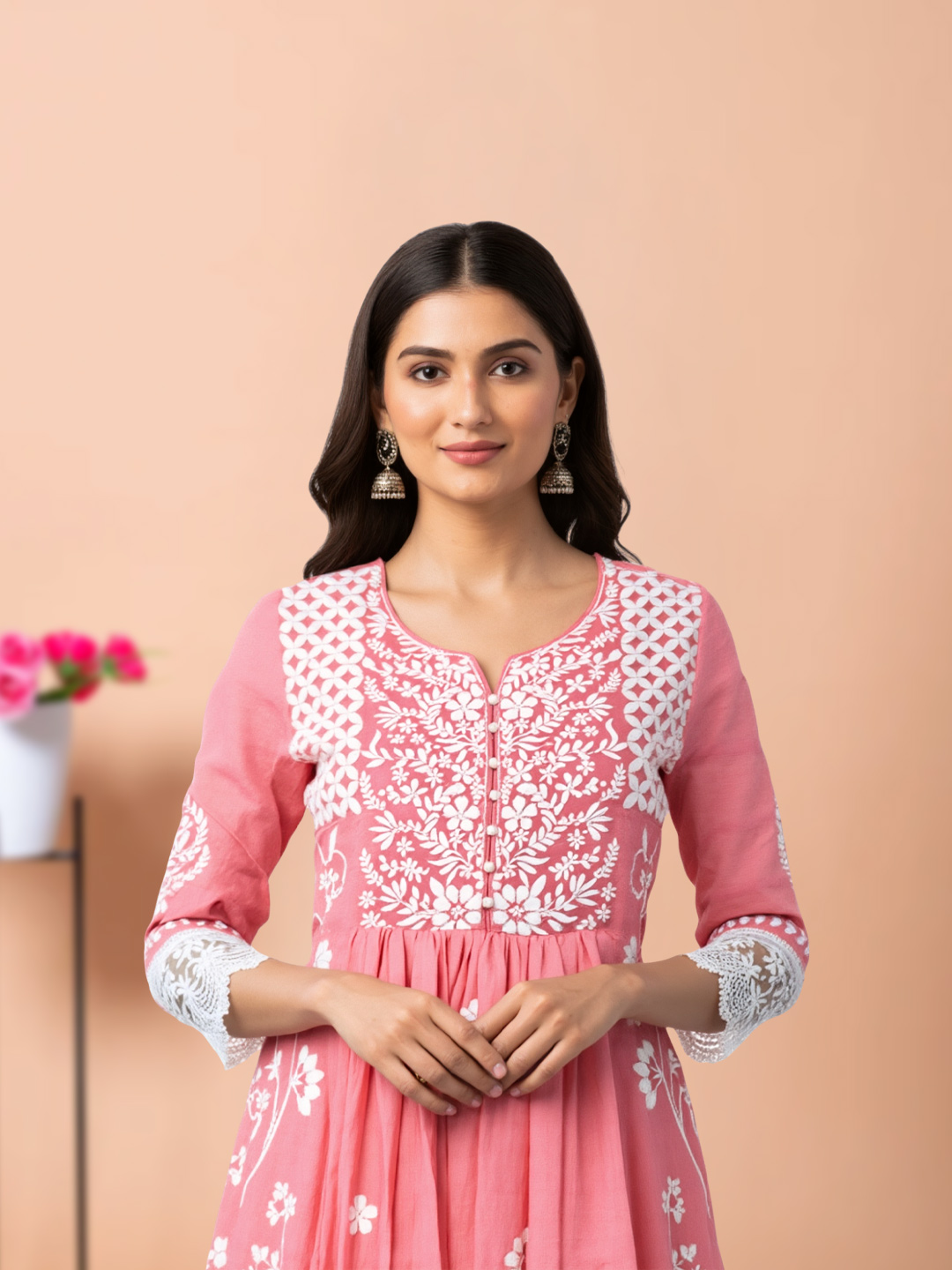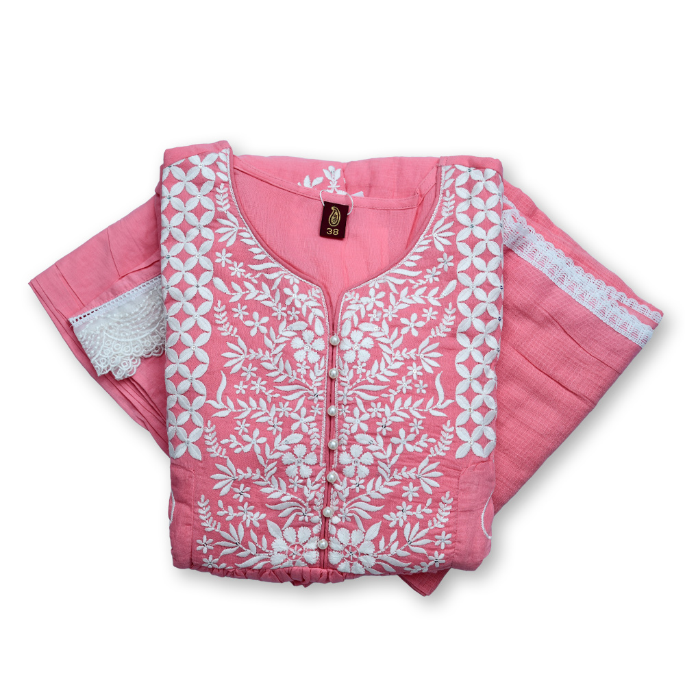 This beautifully crafted salwar suit set stands out with its intricate floral embroidery on the neckline and subtle lace detailing at the sleeve cuffs. The three-quarter sleeves balance comfort and sophistication, while the soft, breathable fabric ensures ease of wear throughout the day. A matching dupatta with embroidered accents completes this charming ethnic ensemble.