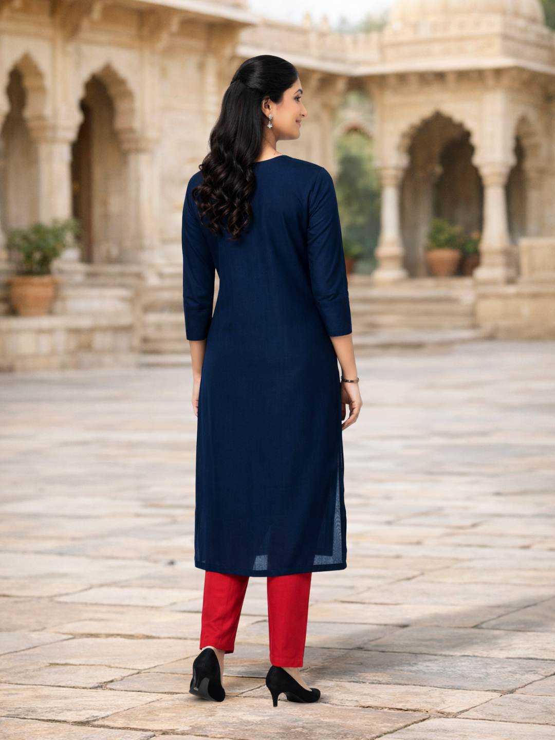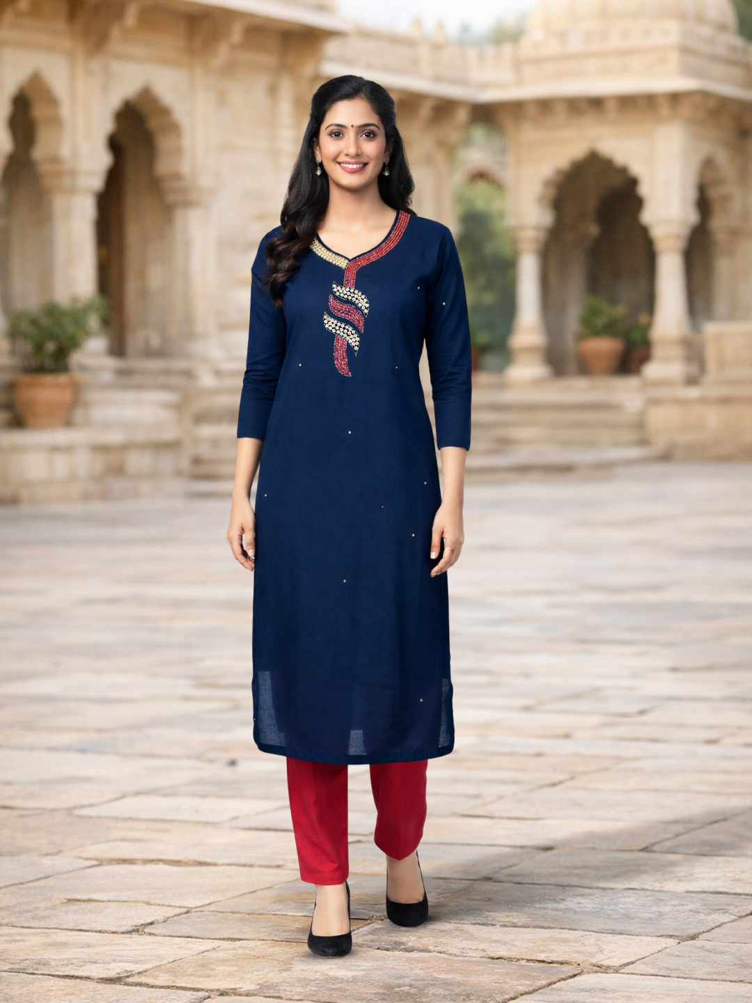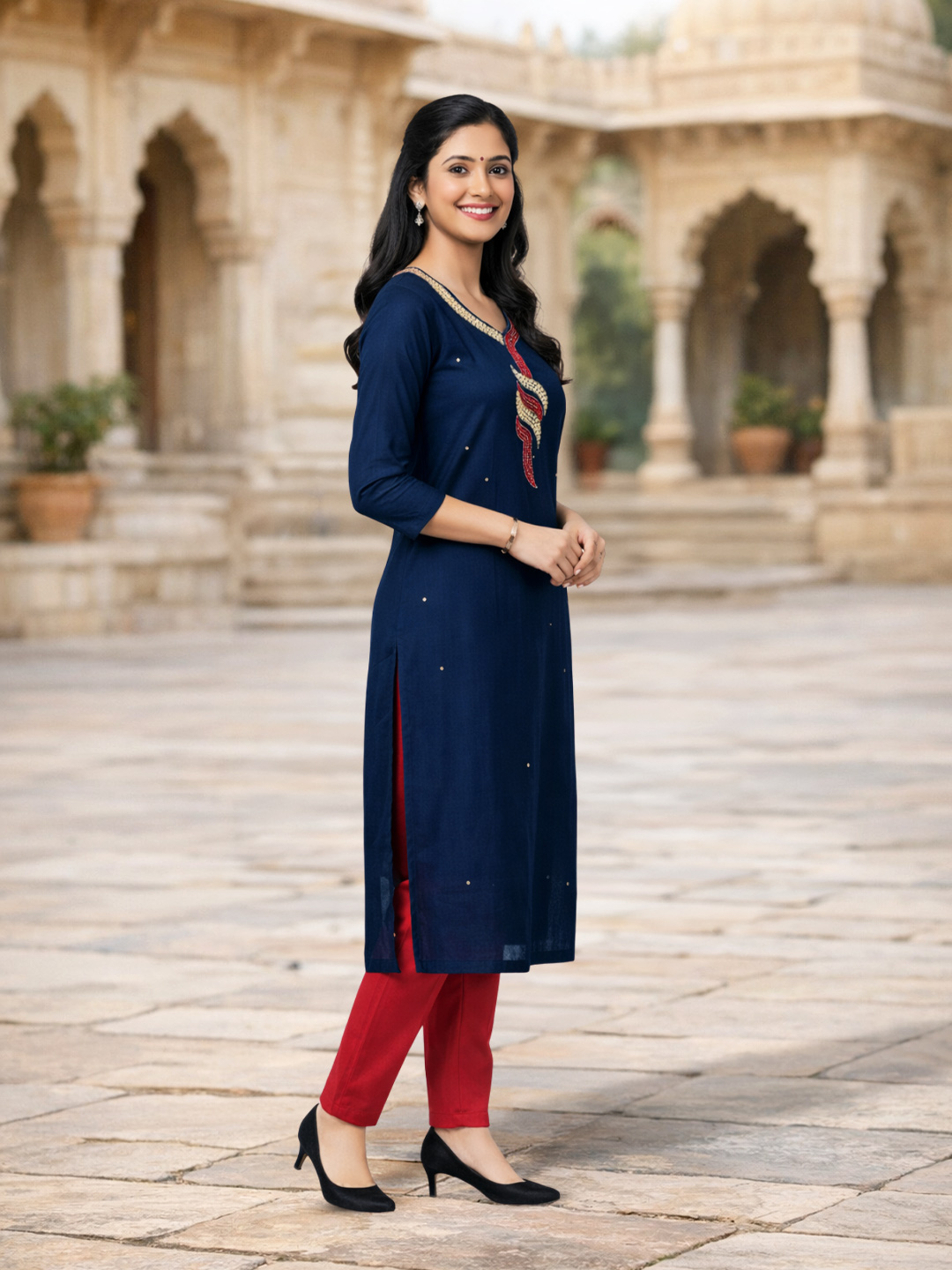 This straight-cut kurta set blends traditional craftsmanship with modern aesthetics. The subtle embroidered motifs create a refined look, and the breathable fabric keeps you relaxed throughout the day. Perfectly complemented by a printed dupatta, it’s a must-have for any wardrobe.