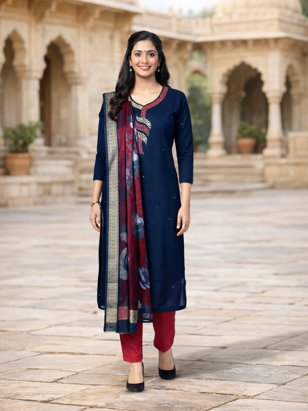 Add a touch of understated elegance to your collection with this beautifully designed salwar suit set. Featuring a clean silhouette, intricate neckline detailing, and a lightweight feel, it’s ideal for any occasion. The coordinated dupatta enhances its charm, making it effortlessly stylish.