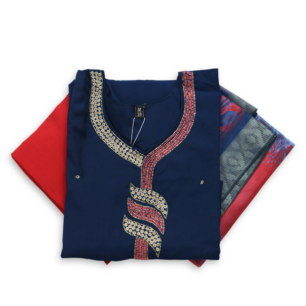 Upgrade your daily style with this chic and comfortable salwar suit set. The minimal yet elegant embroidery enhances the neckline, while the 3/4 sleeves offer a contemporary touch. The vibrant dupatta completes the look with a graceful finish.