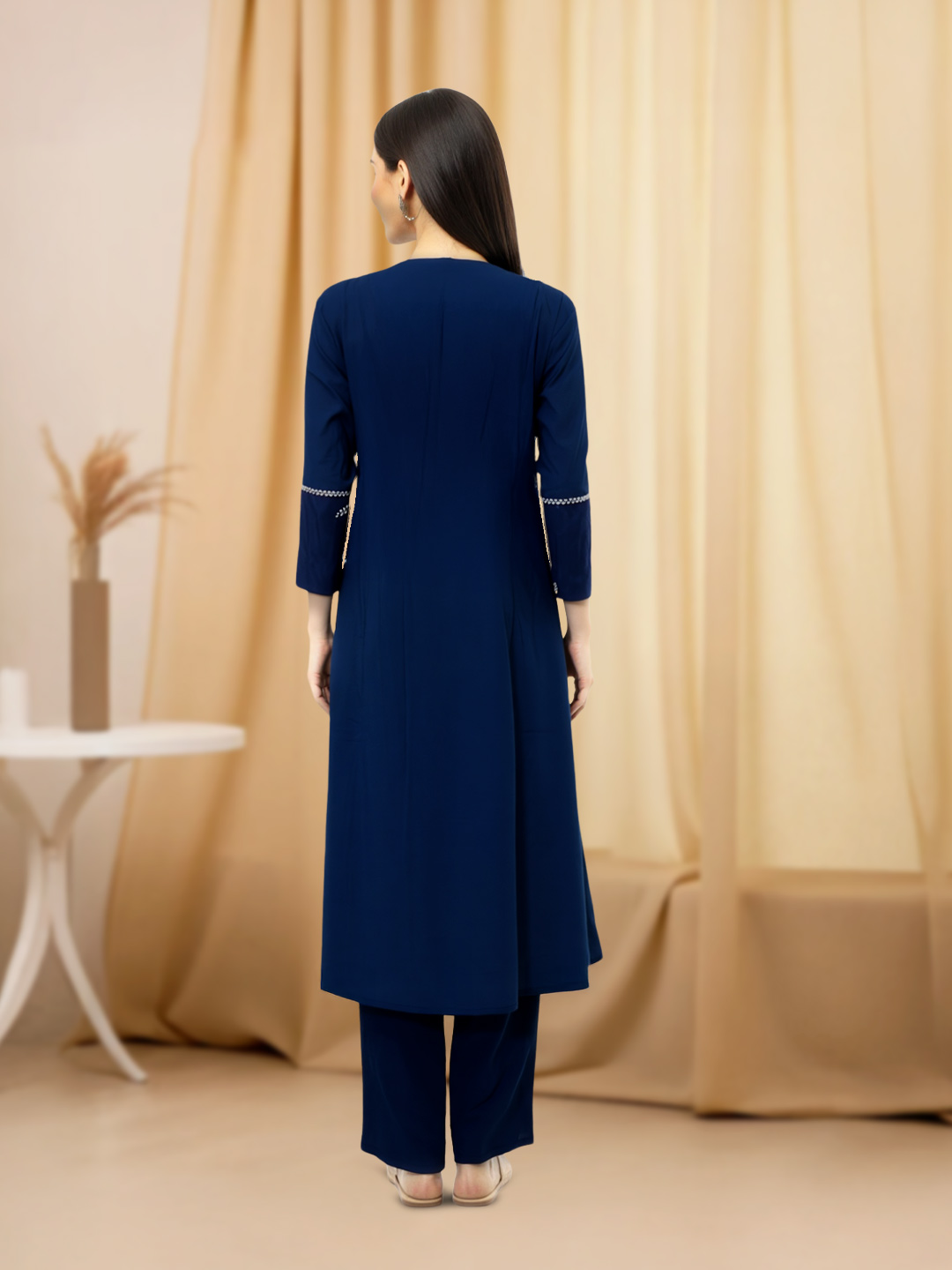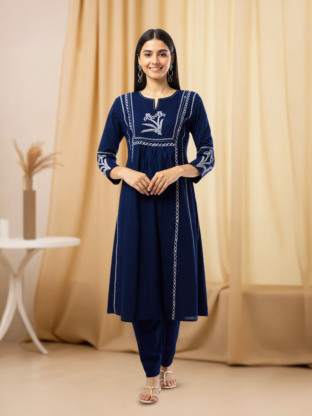 With a notched round neck and classic embroidery, this suit set effortlessly merges modern cuts with ethnic richness—perfect for the modern woman who cherishes her roots.