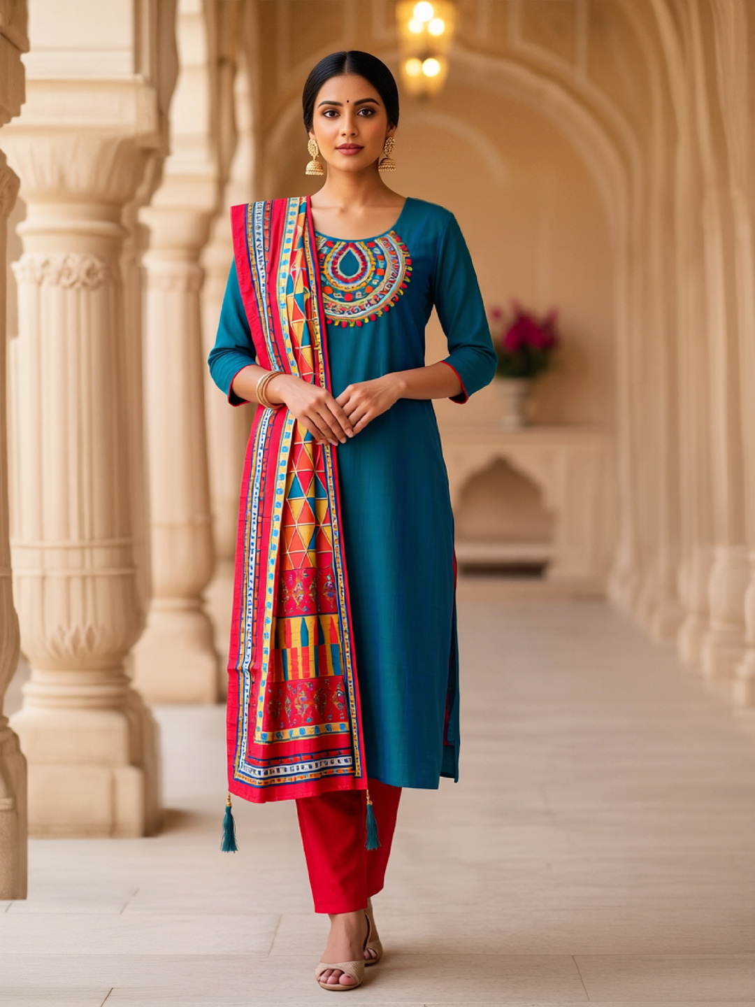 This salwar suit set is crafted for women who love subtle elegance with a hint of boldness. The multicolor embroidery highlights the neckline beautifully, while the structured straight fit offers a flattering silhouette. Paired with vibrant pants and a stylish dupatta, it’s a perfect choice for versatile ethnic wear.