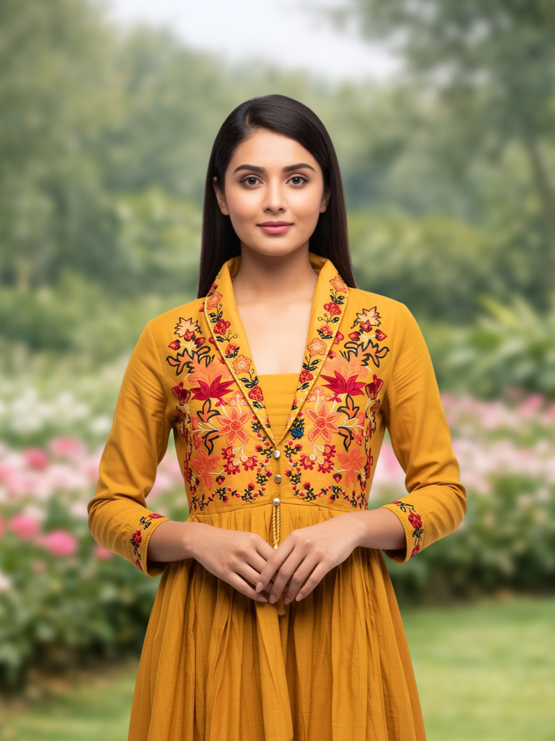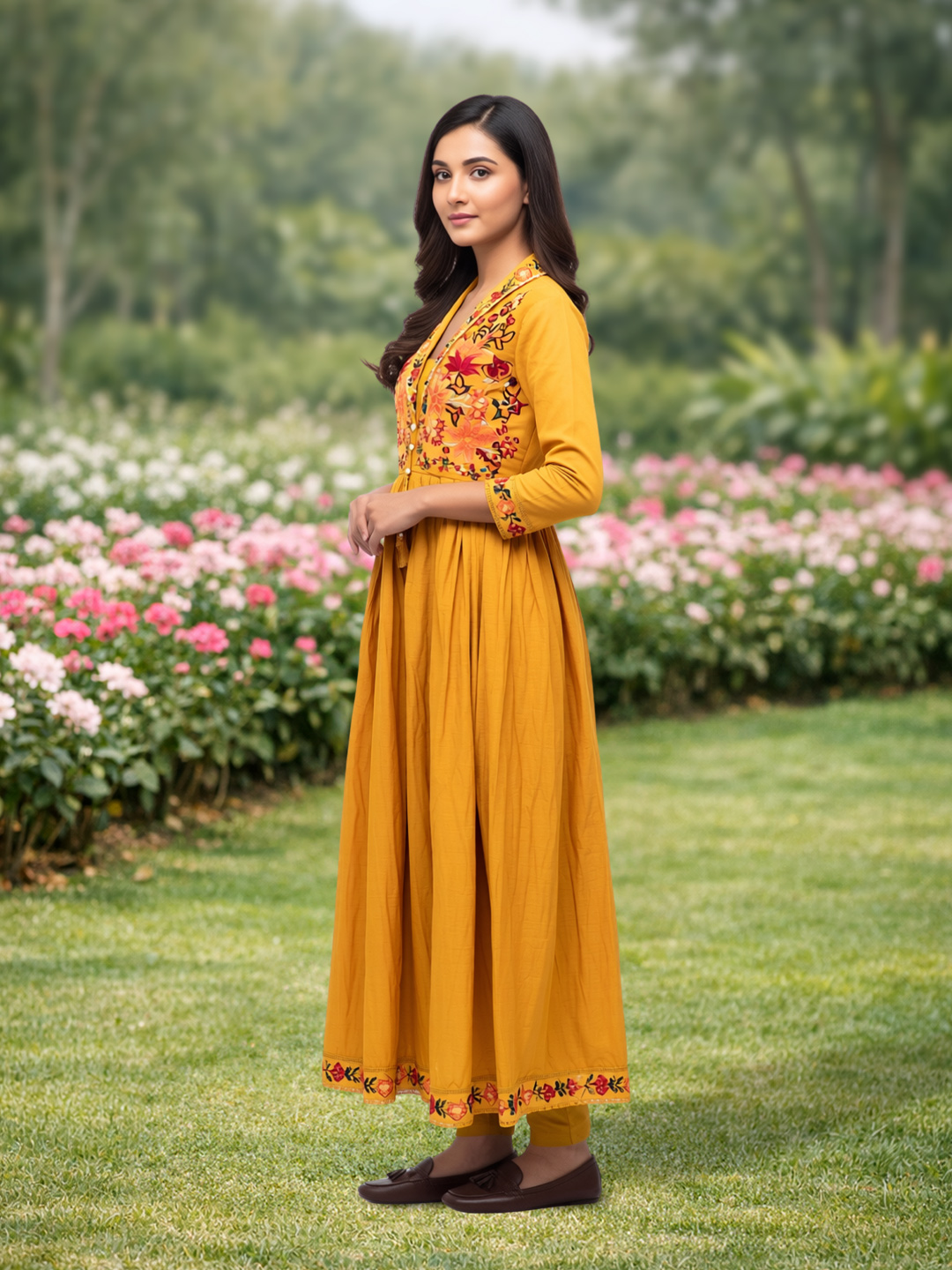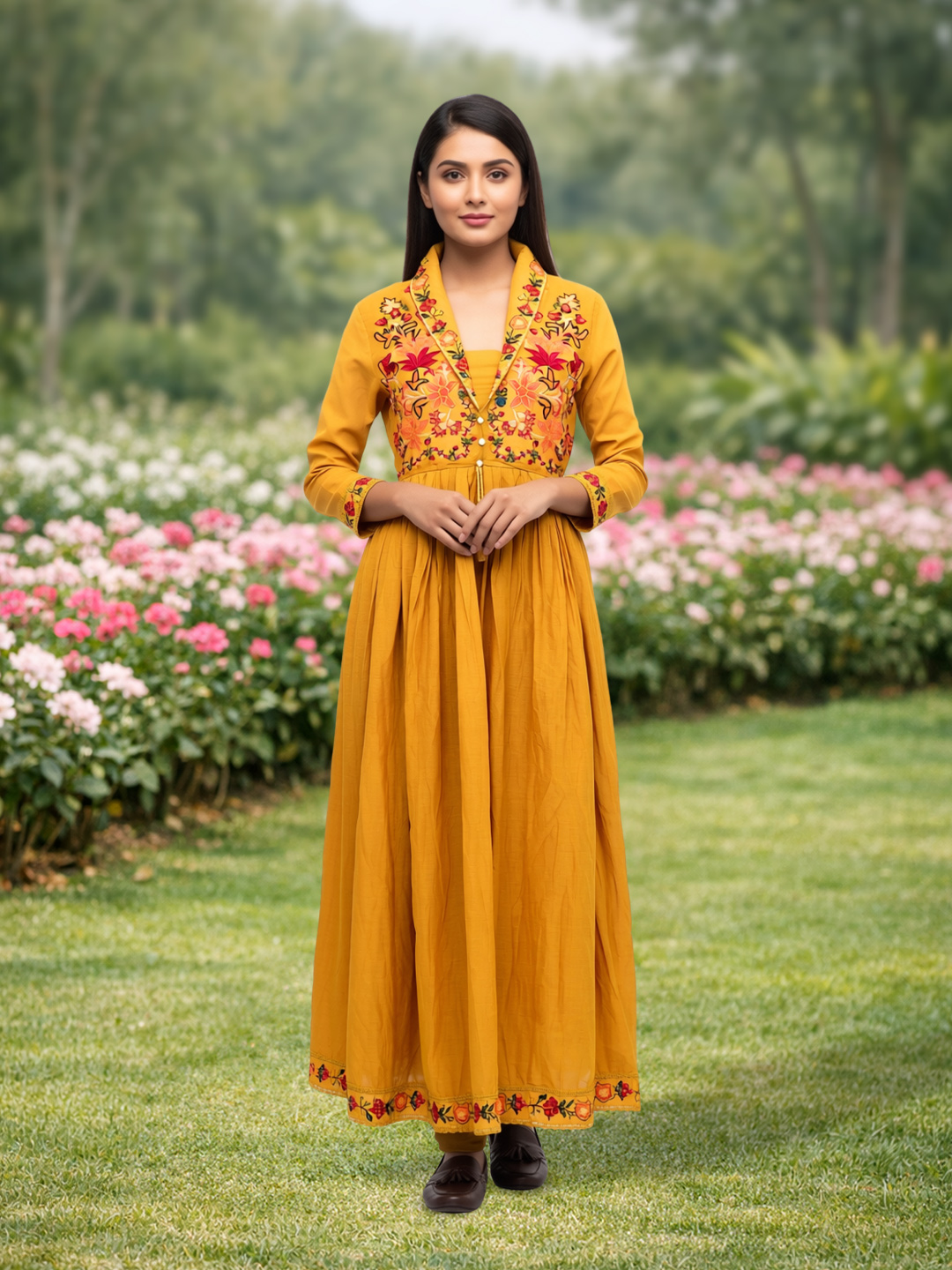 The hem of the dress and bodice feature stunning floral embroidery that ties the entire outfit together. The embroidered details add a rich, cultural touch that enhances the outfit's beauty while maintaining a sophisticated, polished appearance.