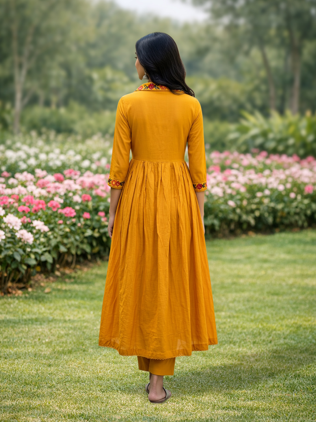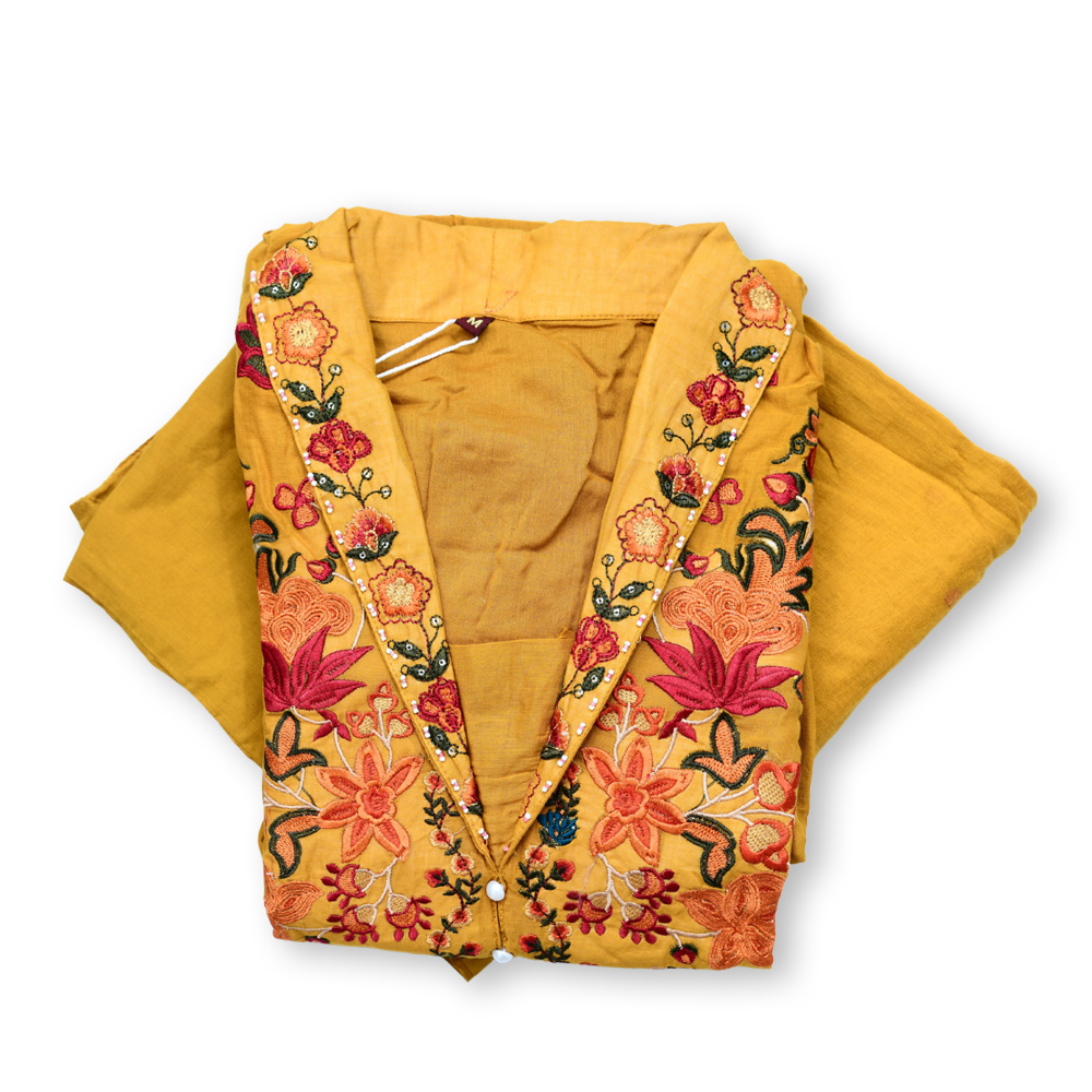 The embroidered shawl-collar V-neckline adds a contemporary flair to this traditional Anarkali. The V-neckline elongates the neck while the shawl collar creates an elegant framing effect, giving the suit a refined and stylish look that’s perfect for any festive occasion.