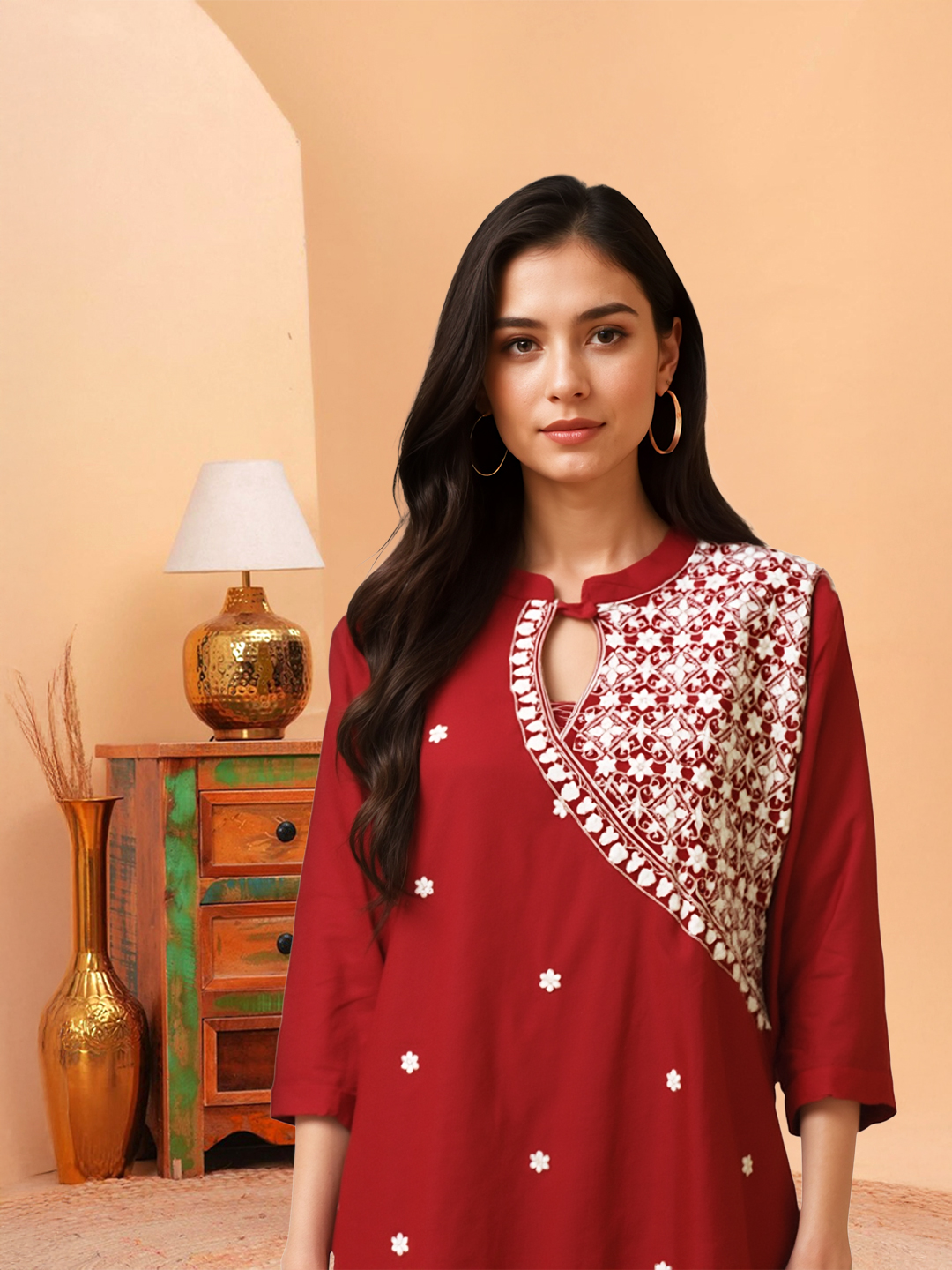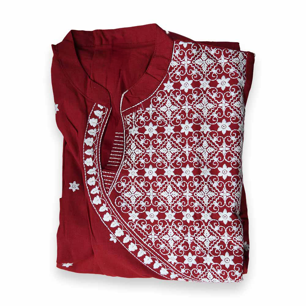 Intricately stitched along one side of the yoke and scattered across the front, the embroidery blends traditional artistry with modern asymmetry—elevating the kurta to a statement piece.