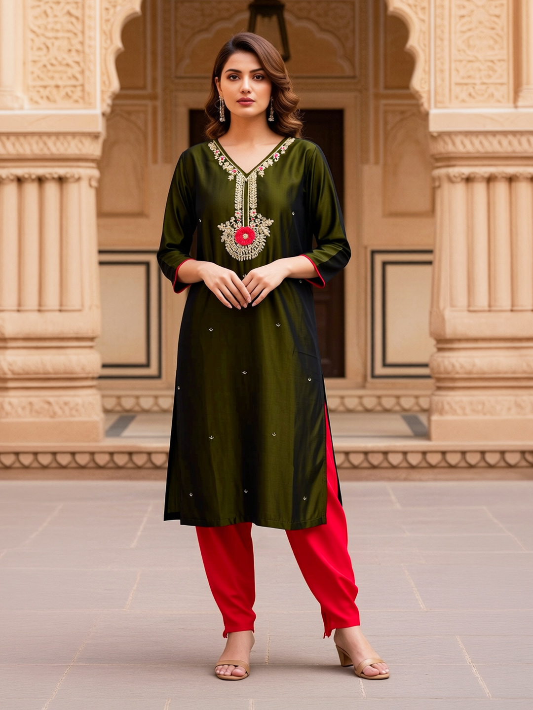 Refresh your ethnic collection with this beautifully designed embroidered V-neck salwar suit set. Crafted from soft, breathable fabric, it promises day-long comfort while maintaining a polished look. The intricate embroidery along the V-neckline adds refined charm, perfectly balanced by 3/4 sleeves finished with contrast piping. Paired with sleek straight-fit solid pants and a graceful dupatta adorned with subtle motifs and a decorative woven border, this ensemble is ideal for office wear, casual gatherings, and festive occasions alike.