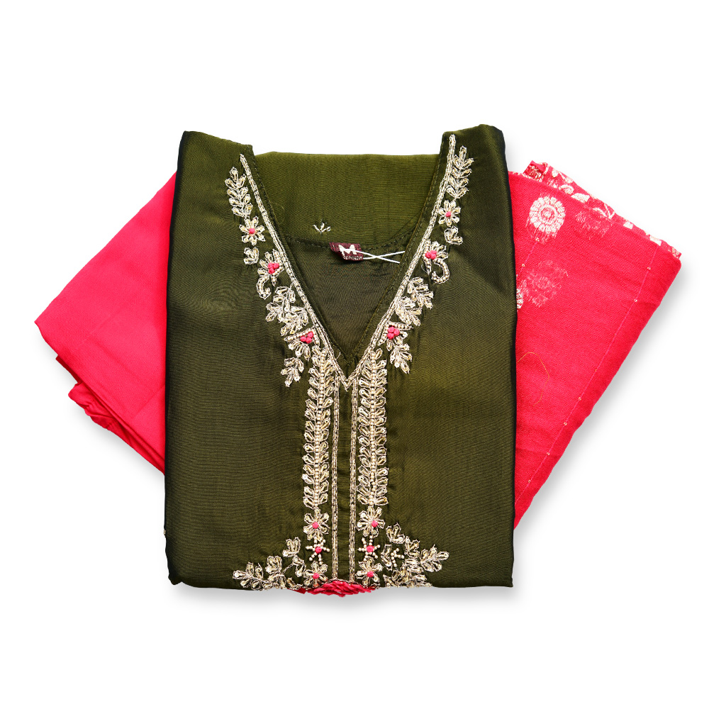 Designed for the modern woman who values both comfort and style, this salwar suit set offers a flattering regular fit with effortless movement. The delicately embroidered V-neckline enhances its elegant appeal, while the contrast detailing on the sleeves lends a contemporary touch. The straight-cut pants create a streamlined silhouette, and the coordinated dupatta with woven border detailing completes the look with understated grace. Perfect for long days that transition into evening celebrations.