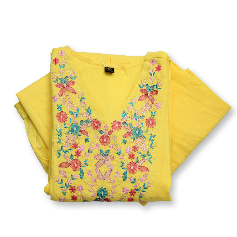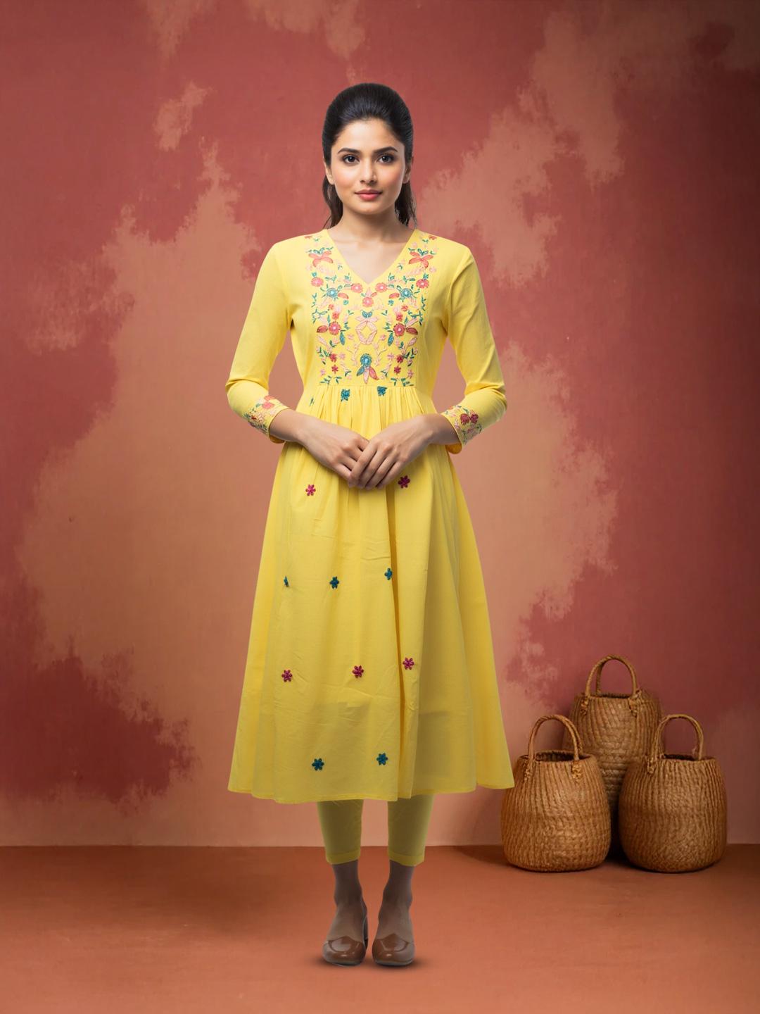 Scattered floral embroidered motifs enhance the kurta’s charm, giving it a vibrant and refined look. Soft gathers from the waist add volume and fluid movement, making this piece both flattering and graceful.