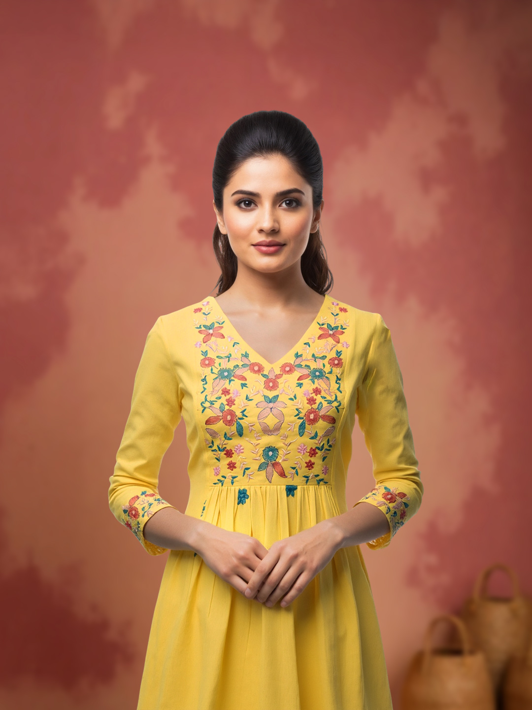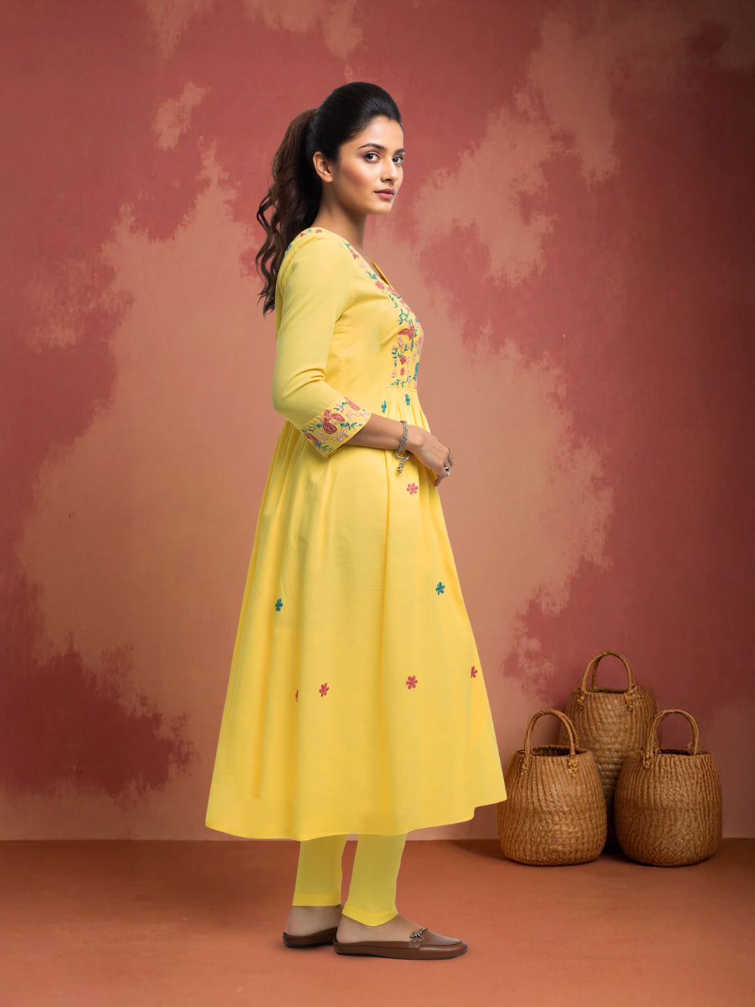 Crafted from soft, breathable fabric, this Anarkali ensures comfort throughout the day. The 3/4th sleeves are finished with embroidered cuffs, adding a touch of sophistication while allowing ease of wear.