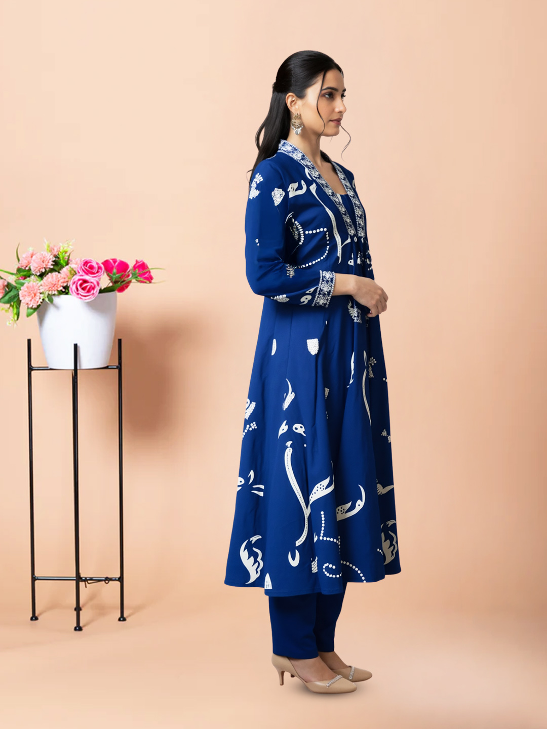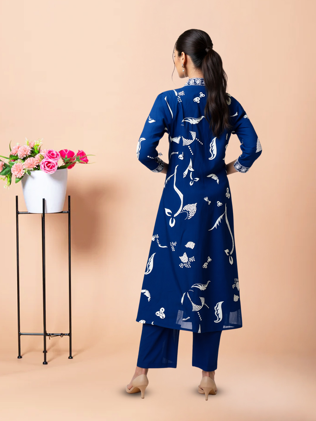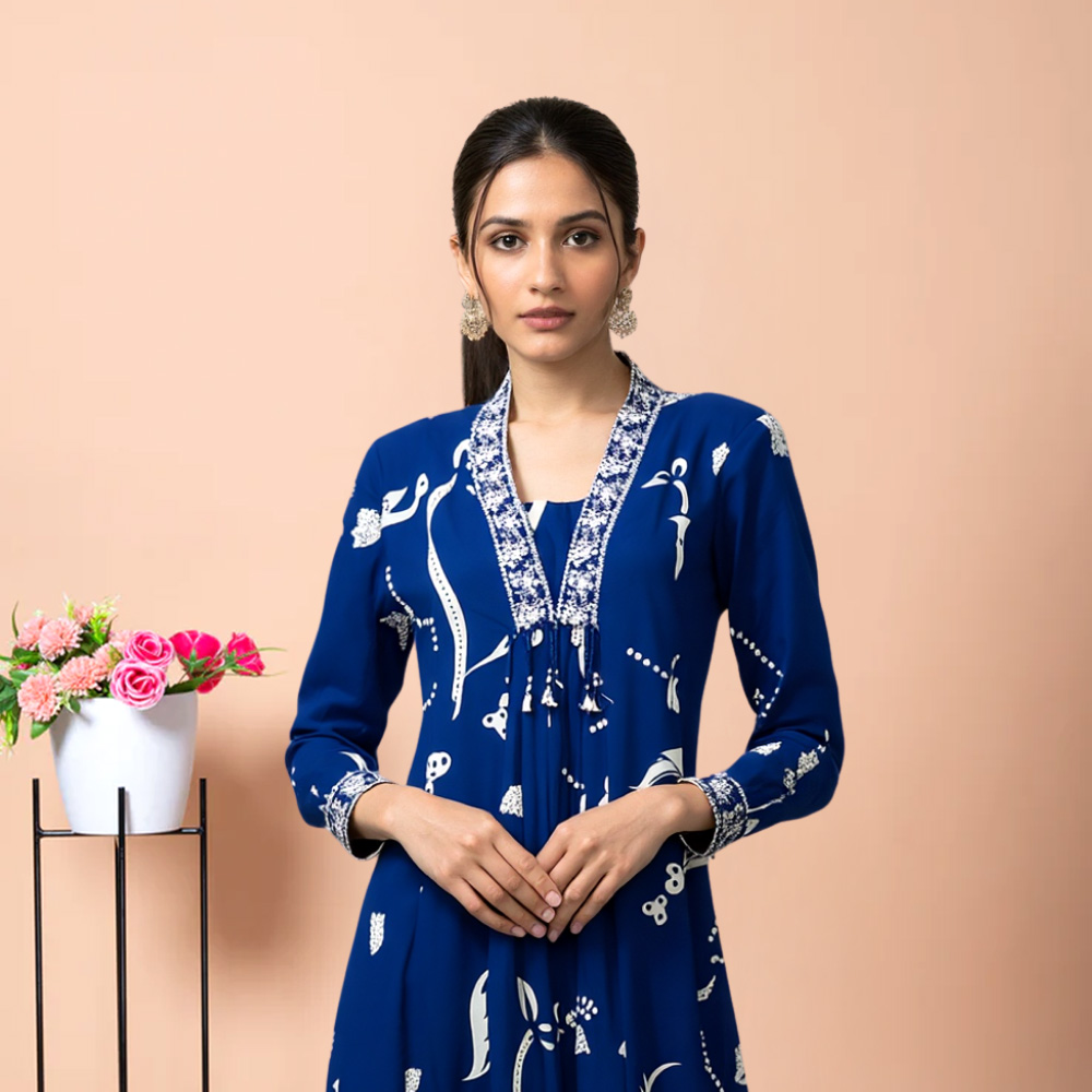 Step into timeless sophistication with this salwar suit set that perfectly balances print, embroidery, and structure. The kurta is adorned with delicate white floral and abstract prints, finished with a sequin-embellished neckline and printed cuffs. Strategic pleating under the yoke offers movement and shape, while the solid straight-fit trousers and contrasting floral dupatta make this outfit effortlessly eye-catching and event-ready.