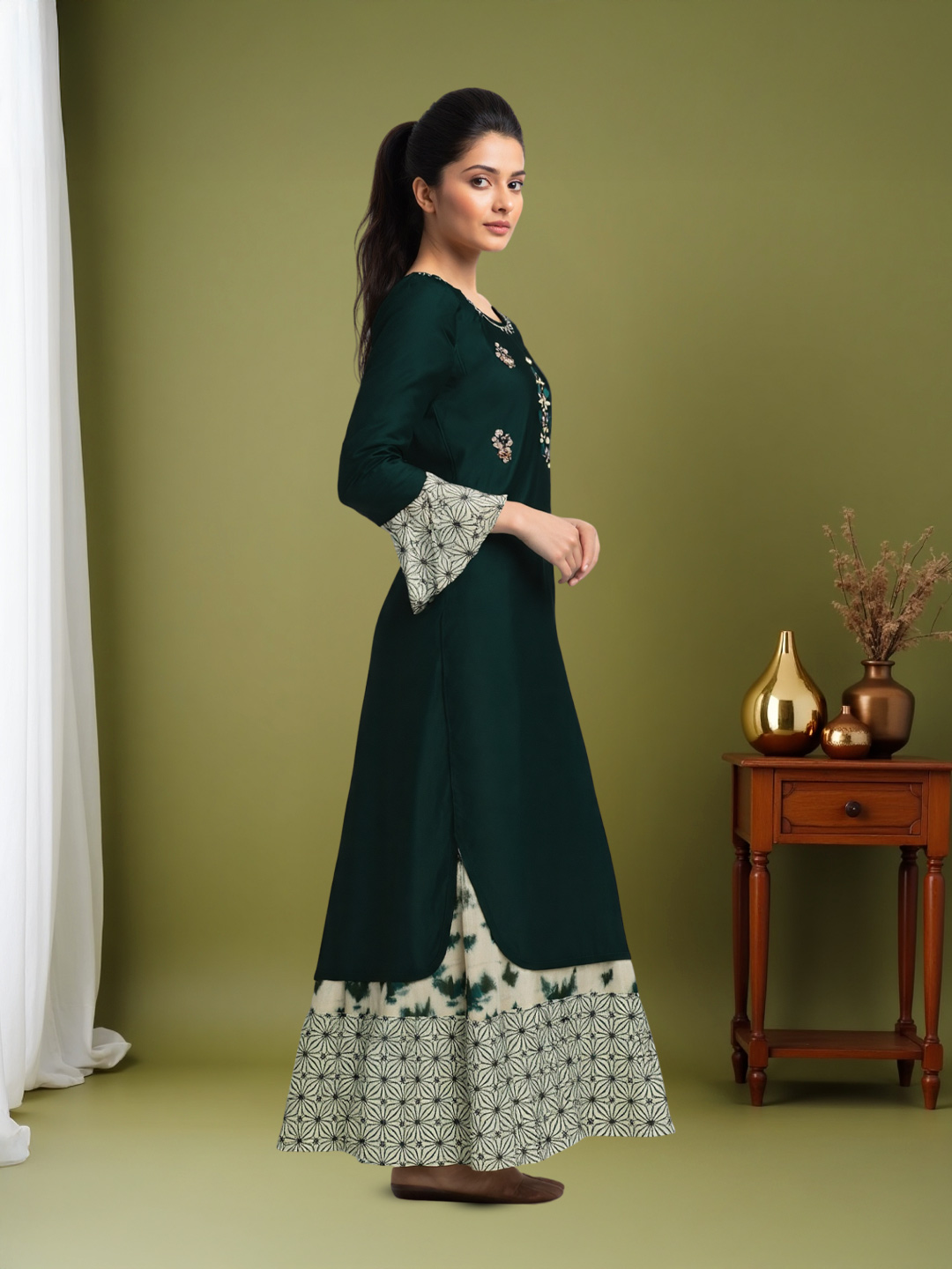 The long kurti is beautifully highlighted with delicate floral and leaf embroidery at the center, creating a refined focal point. This exquisite detailing adds elegance and makes the outfit a true statement piece.