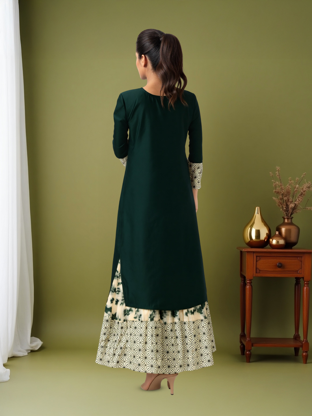 The contrasting lighter fabric at the hem features elegant geometric patterns that elevate the kurti’s design. This unique detailing adds a chic, eye-catching finish to the overall look.