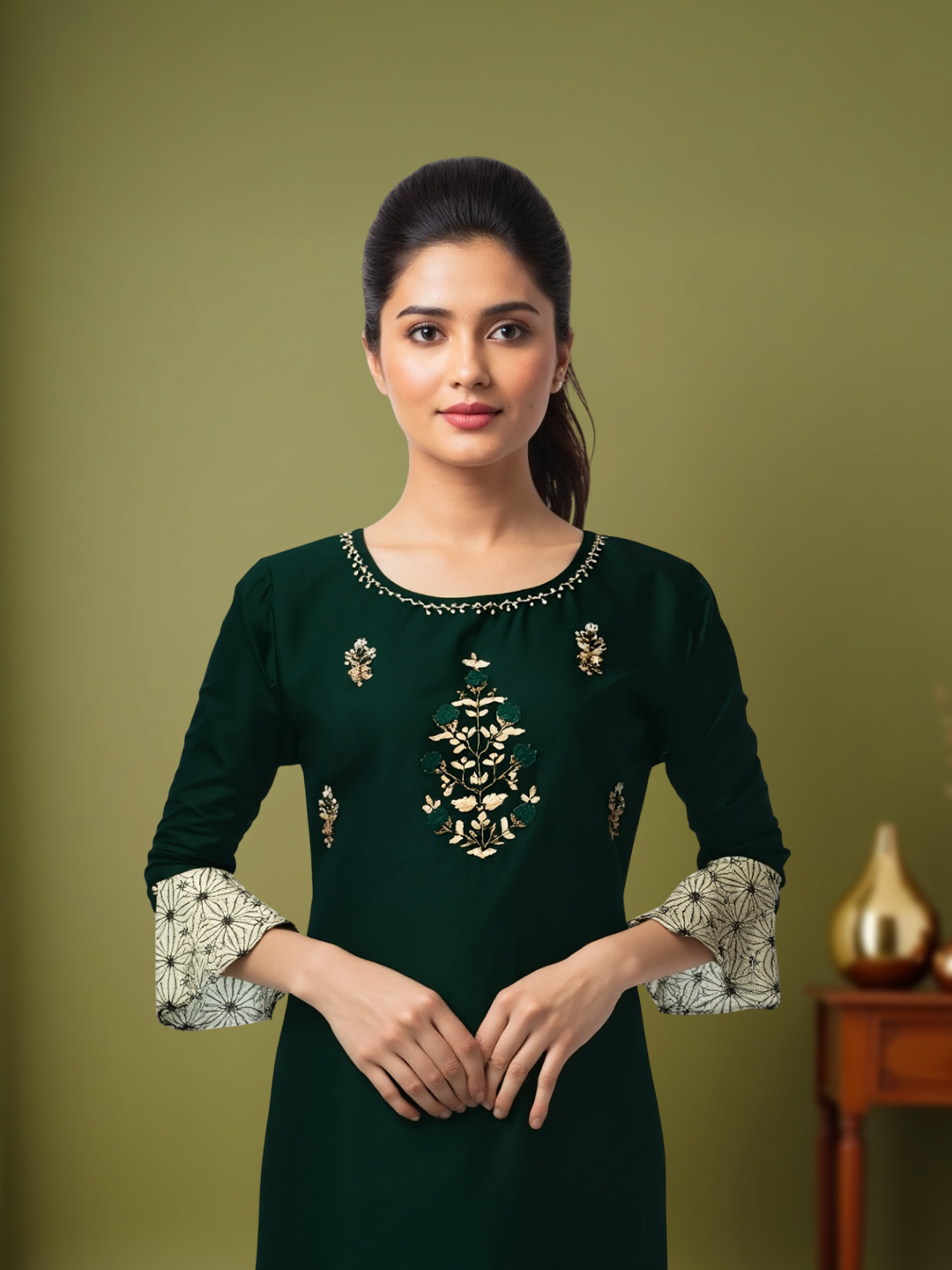Designed with three-quarter bell sleeves, the kurti brings a trendy yet graceful touch. The flowing cuffs add movement and enhance the overall feminine appeal of the ensemble.