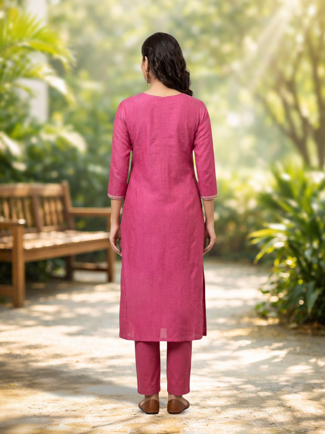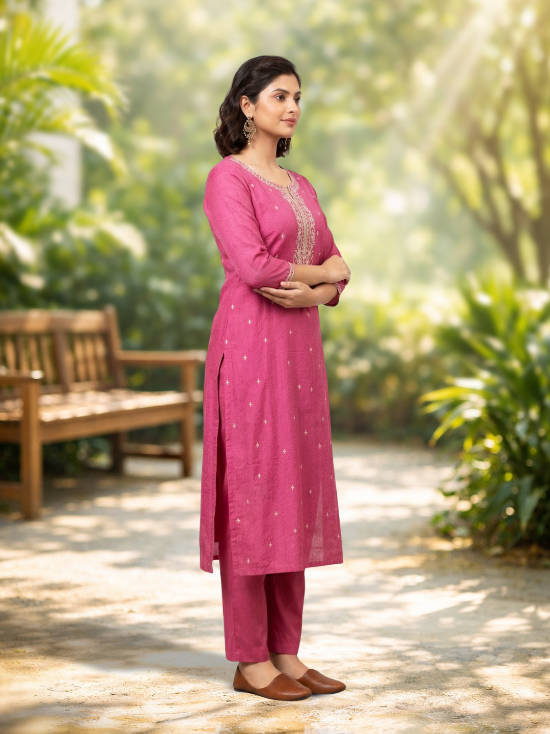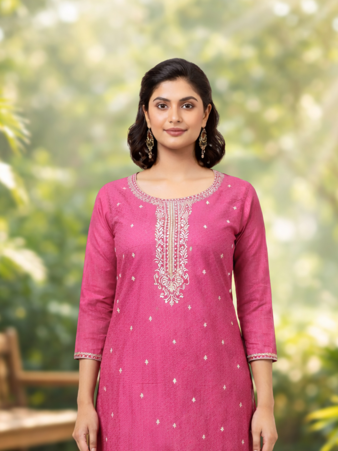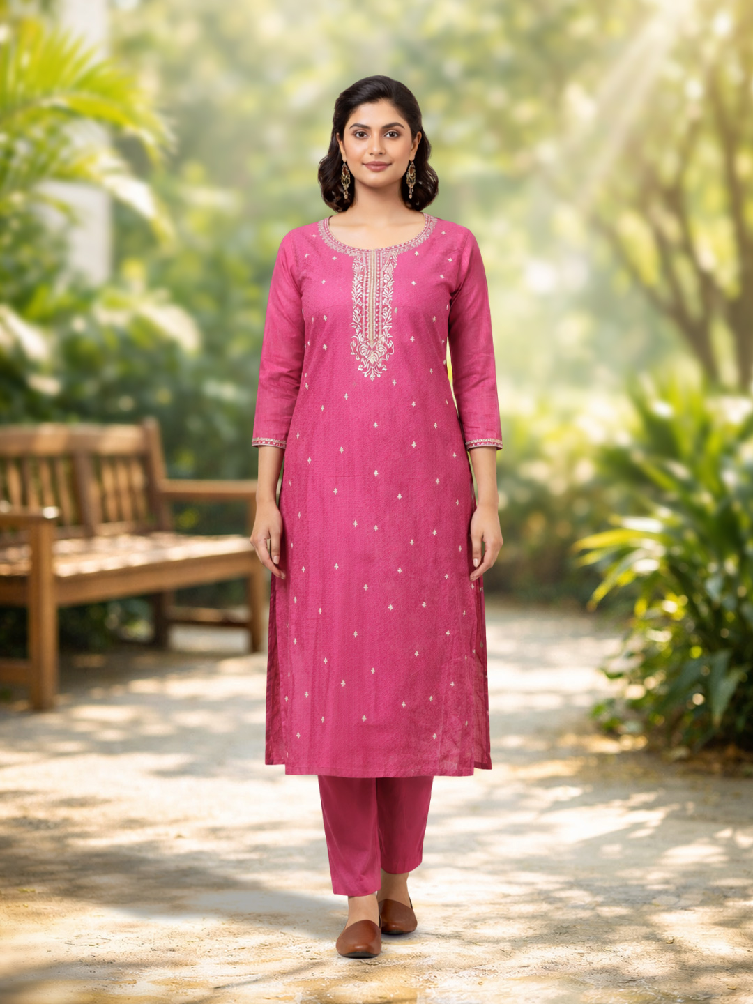 Designed for understated beauty, this straight-cut kurta features fine embroidery inspired by ethnic motifs. The breathable fabric offers ease of wear, complemented by a flowing tie-dye dupatta that adds movement and charm. Finished with sleek straight pants, this set is perfect for workdays, family gatherings, or relaxed celebrations.