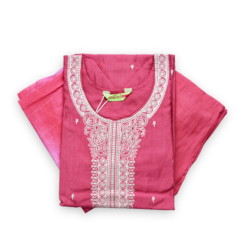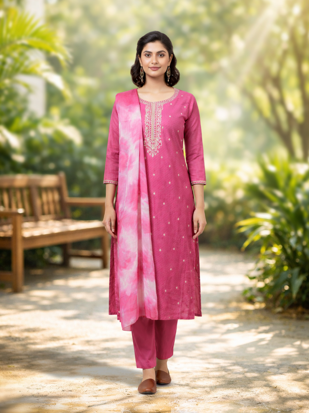 This beautifully tailored salwar suit set blends tradition with contemporary style. The delicately embroidered neckline enhances its ethnic appeal, while the airy fabric keeps you comfortable and stylish. Paired with a graceful tie-dye dupatta and coordinated straight pants, this outfit is ideal for effortless everyday elegance.
