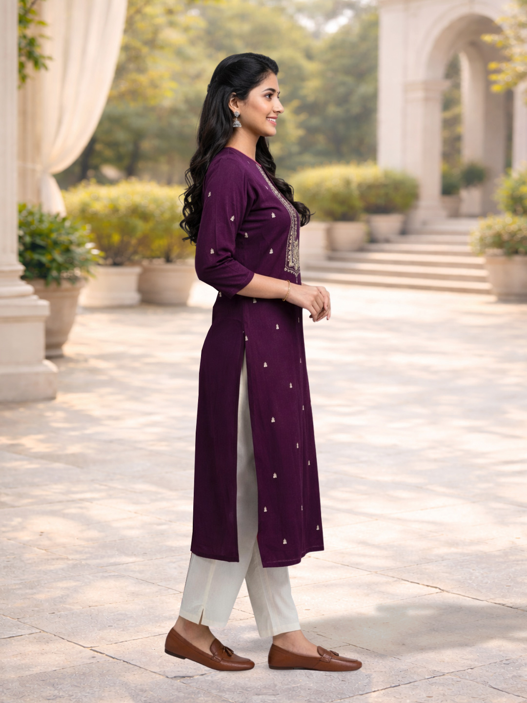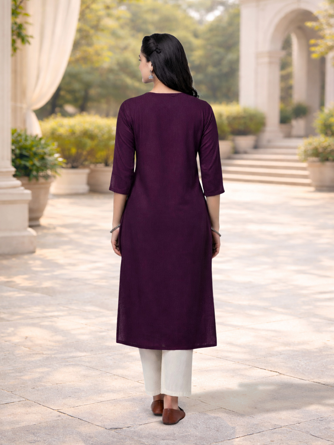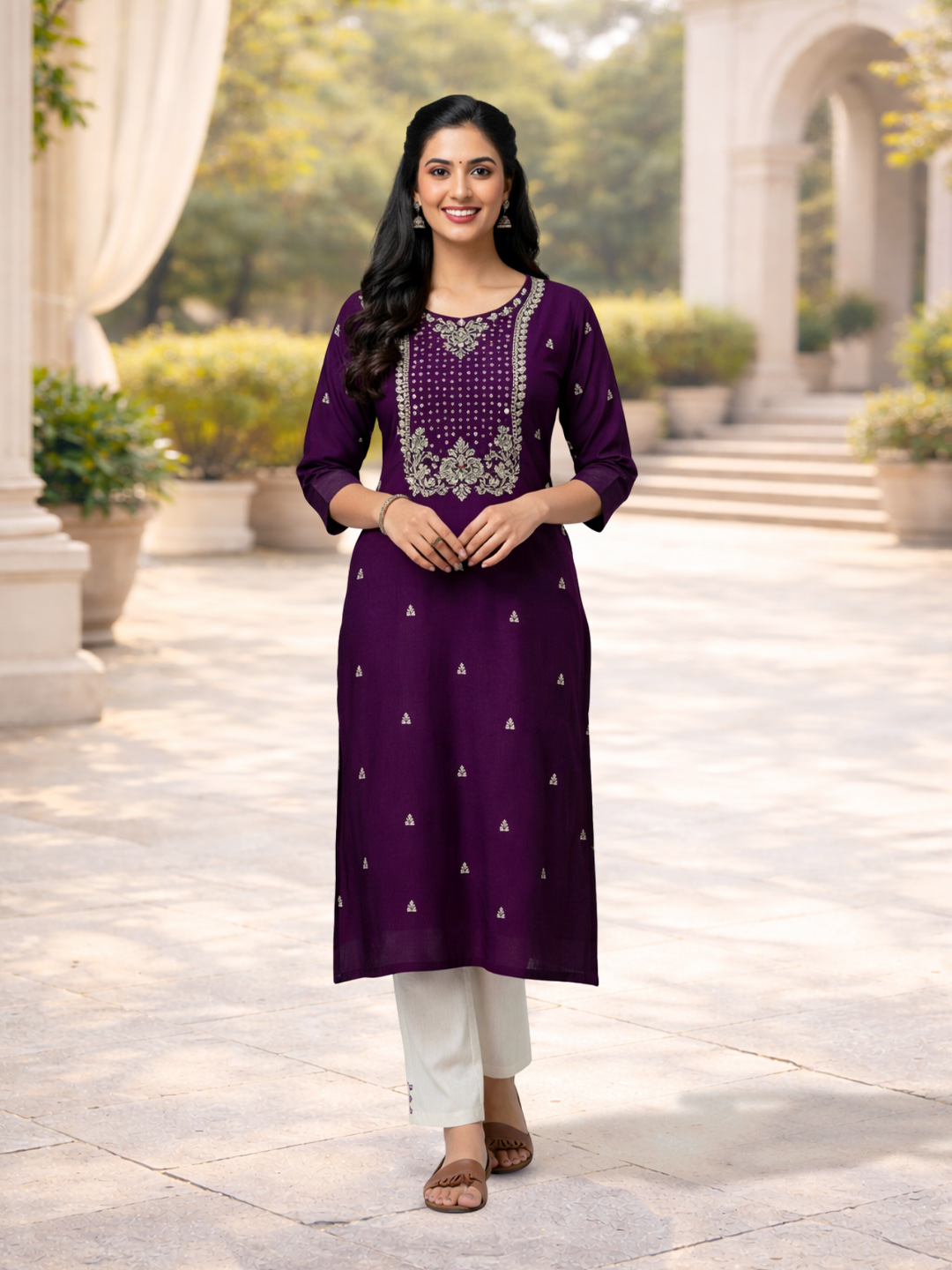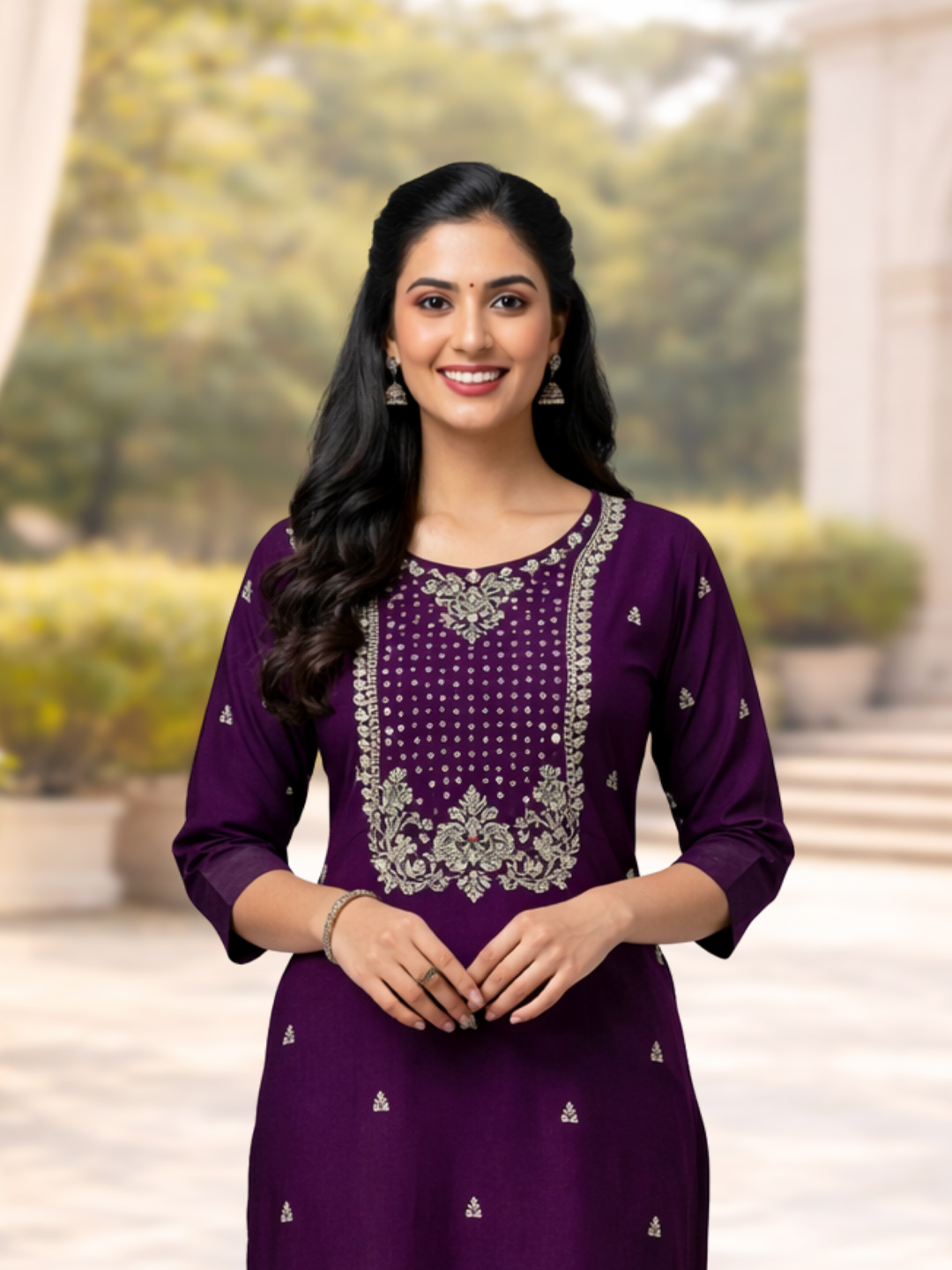 Designed for versatile wear, the straight-cut kurta paired with well-fitted pants allows ease of movement. Three-quarter sleeves add a modern touch, making this outfit ideal for festive gatherings or casual ethnic occasions.
