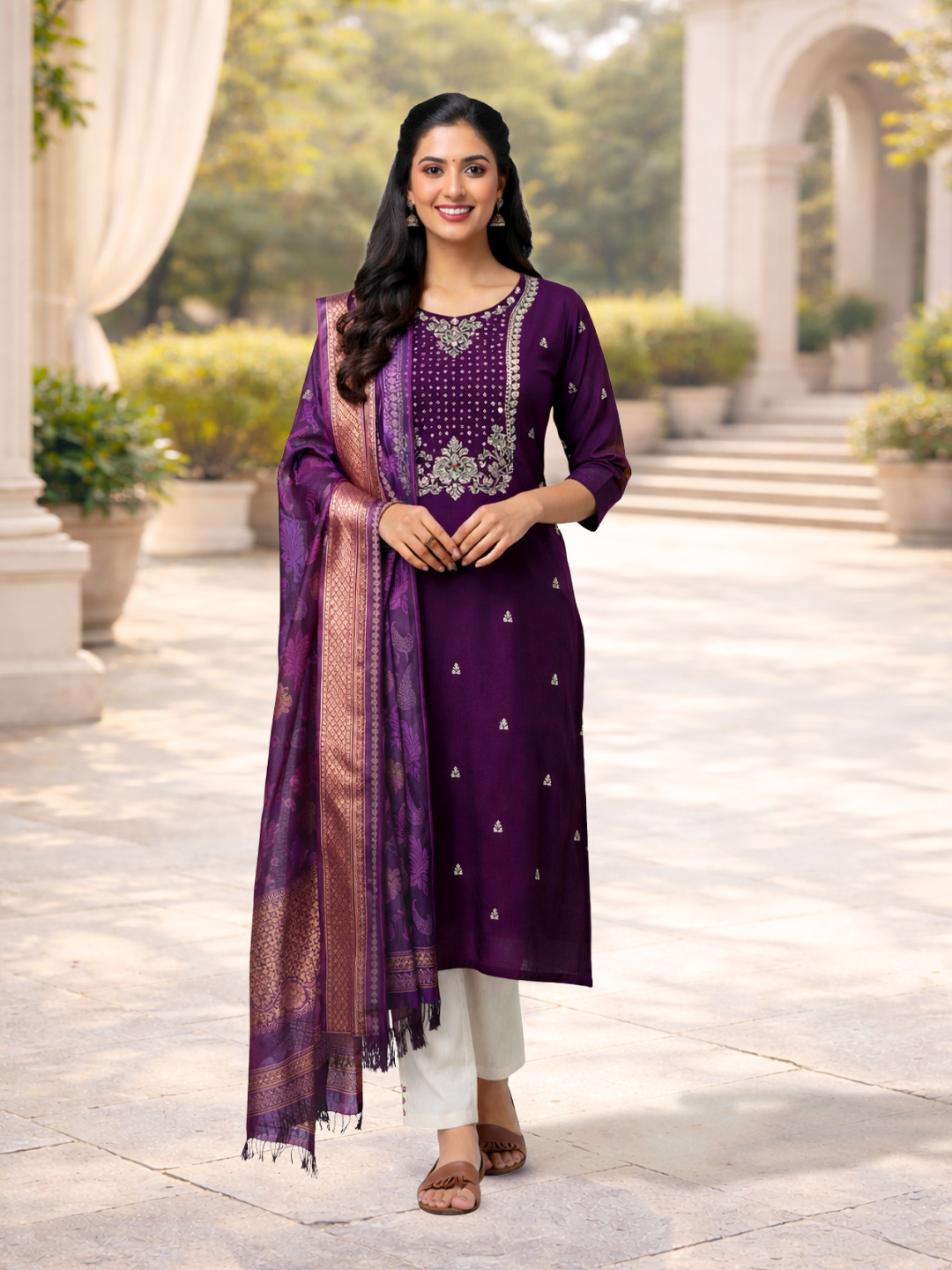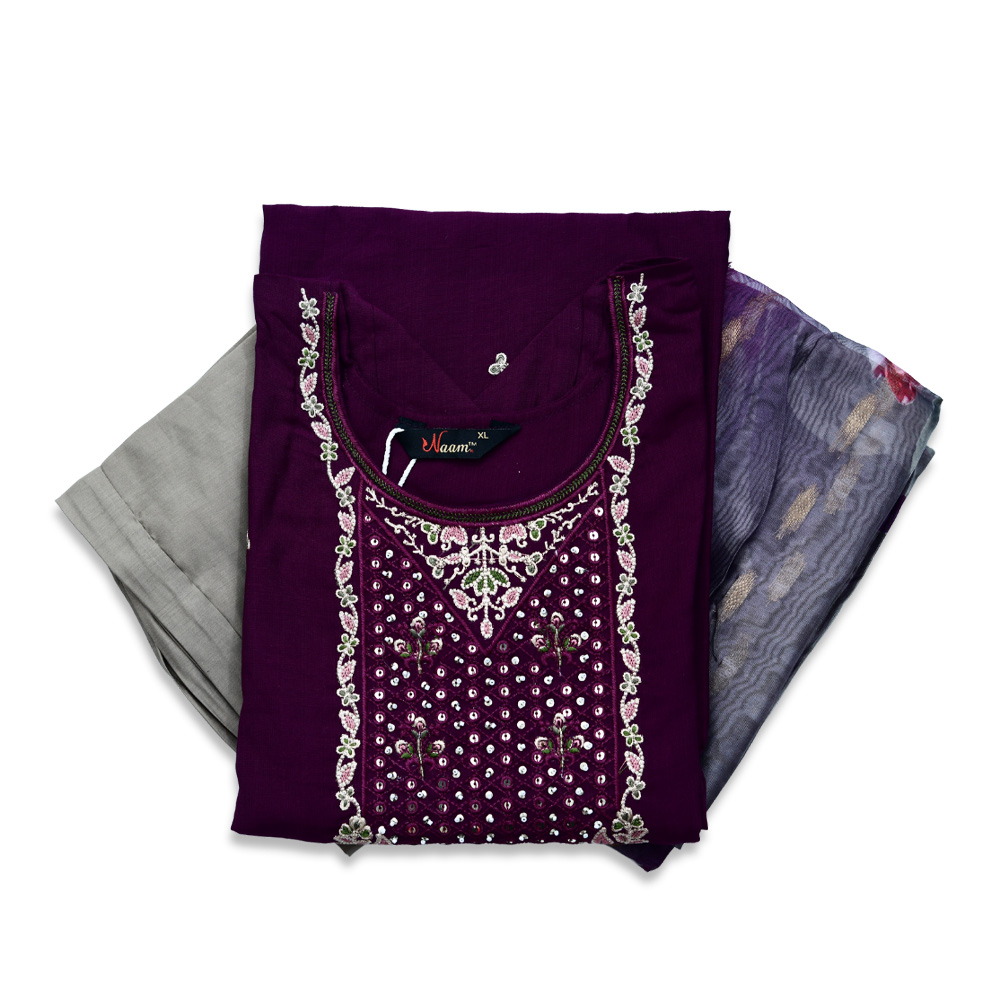 Step into timeless charm with this salwar suit set featuring delicate floral and geometric sequinned embroidery. The soft, breathable fabric ensures all-day comfort, while the coordinated dupatta with subtle patterns completes the elegant ensemble.