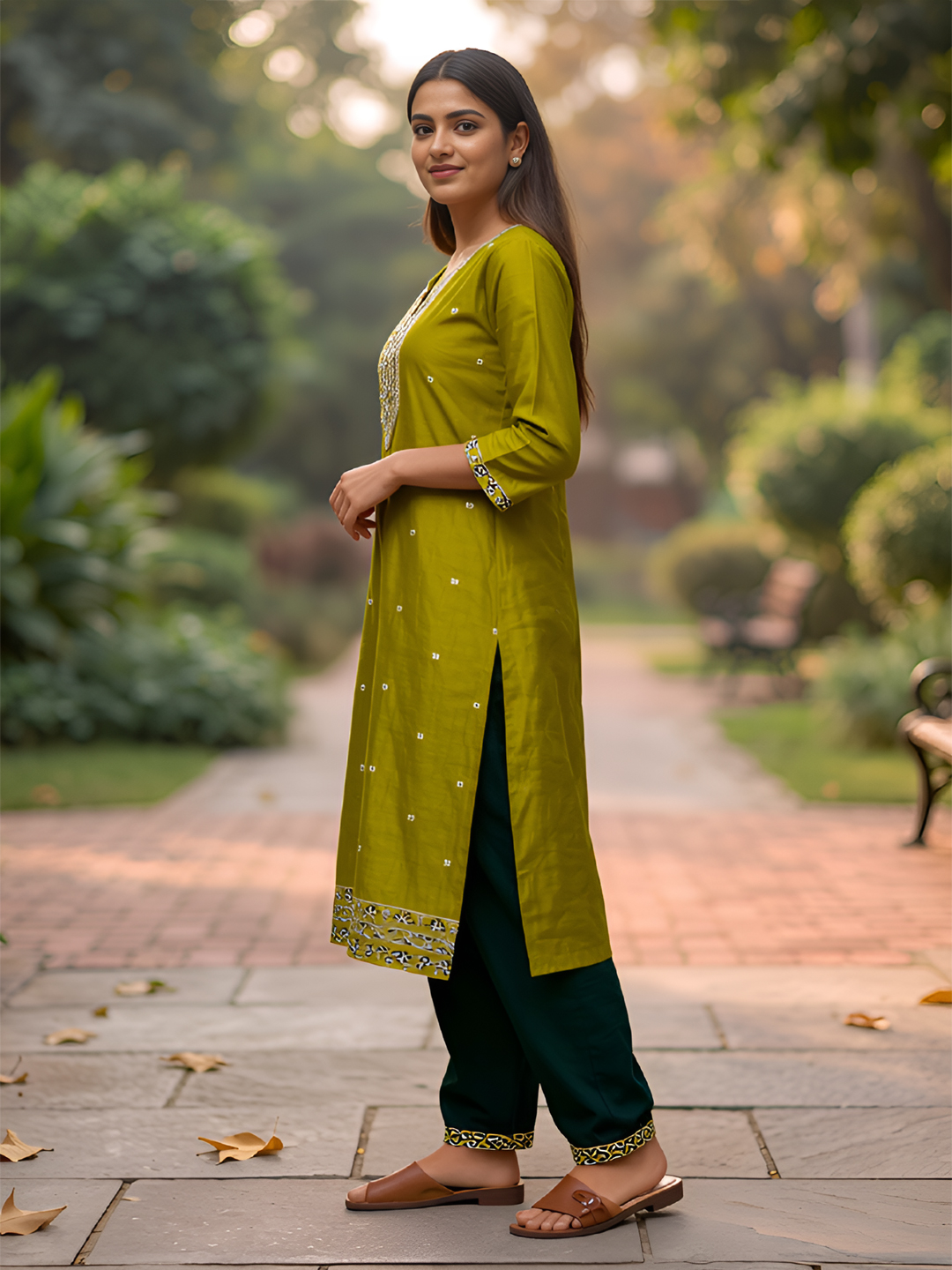 | Pant Type | Matching churidar pants with coordinated embroidery |