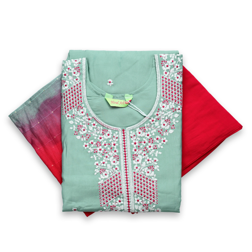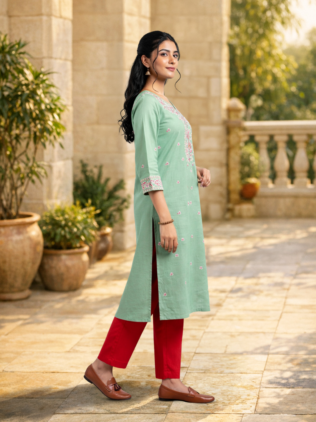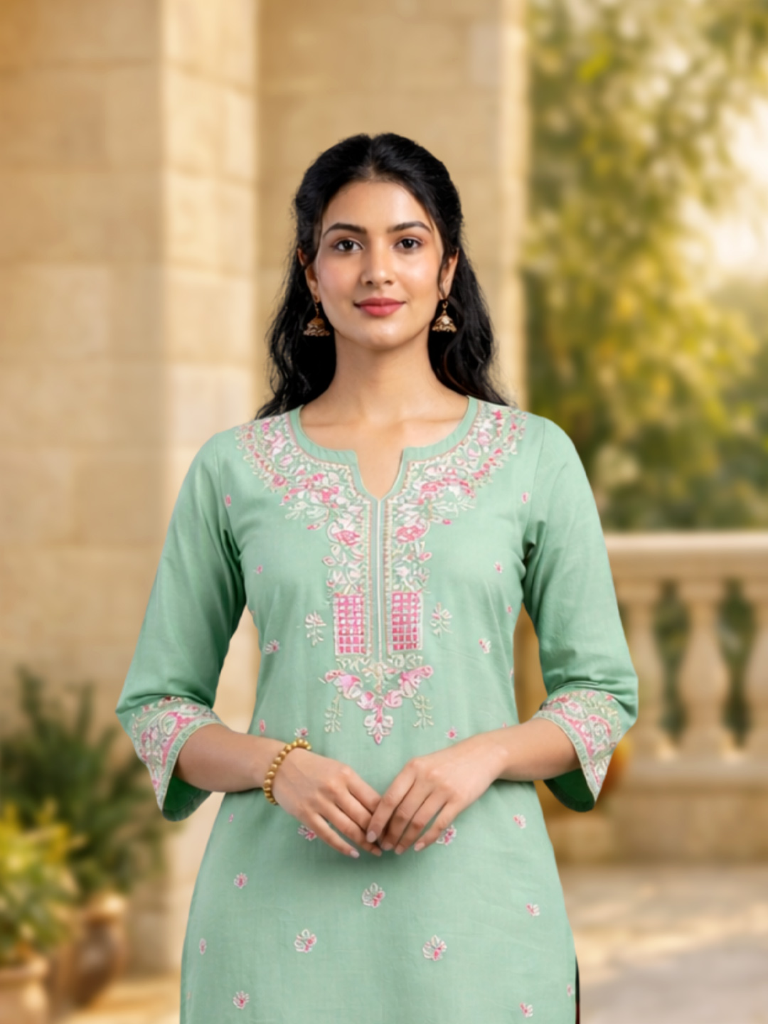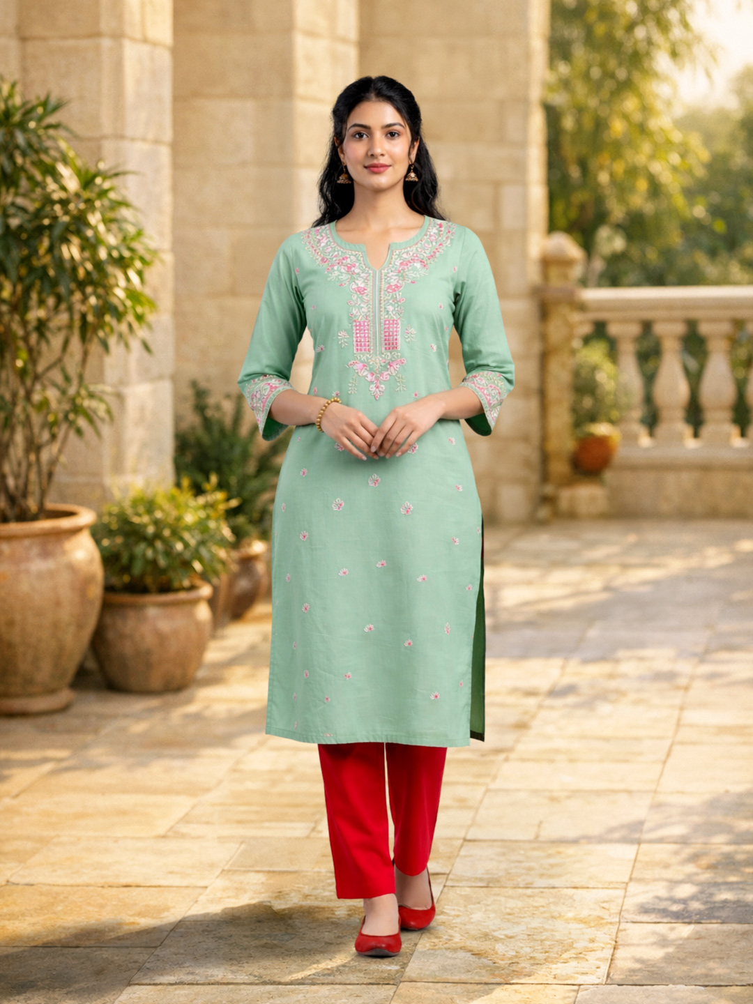 Delicate floral threadwork adorns the neckline and sleeves, adding a touch of sophistication and charm. Perfect for women who love subtle elegance with traditional flair.
